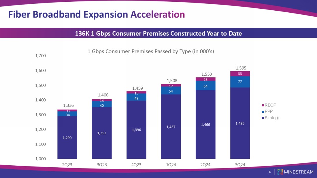 5 Adjusted EBITDAR of $361M, up 2% year to date (1) Strong Strategic Revenue Trends ▪ Continued focus on Strategic & Advanced IP portfolios, which now represent 88% of total Enterprise Market service revenue (3)(4) ▪ Wholesale had solid performance highlighted by high demand from telecom, cable and content customers Consumer Highlights ▪ Strong fiber additions of 17K in quarter ▪ Consumer Broadband ARPU of $87.26 up slightly y - o - y ▪ Kinetic consumer service revenue down 2% YTD largely driven by impact of the ACP step - down (2) Interconnection Expense Reduction (4) ▪ Total interconnection expense fell by 16% y - o - y; legacy - TDM related expenses (5) fell by 24% y - o - y ▪ Of the $628 million in annualized interconnection expense remaining, $274 million relates to TDM services (5) & (1) Adjusted EBITDAR excluding gain on sale of IPv4 assets in 1Q24 (2) Step - down of the Affordable Connectivity Program (ACP) b egan in 2Q24; Windstream’s ACP customer base received ~$3M in monthly subsidy under this program (3) Excludes End user surcha rge s; (4) Based on 3Q24 results on an annualized basis (5) Includes TDM expenses as shown on Slide 11, plus Network Facilities (excluding Fi ber Expense) & Fiber Build Momentum Continues ▪ 136K new consumer premises added year to date ▪ Approximately 1.6 million consumer premises now have access to FTTH services ▪ 36% coverage of consumer households was achieved by quarter end