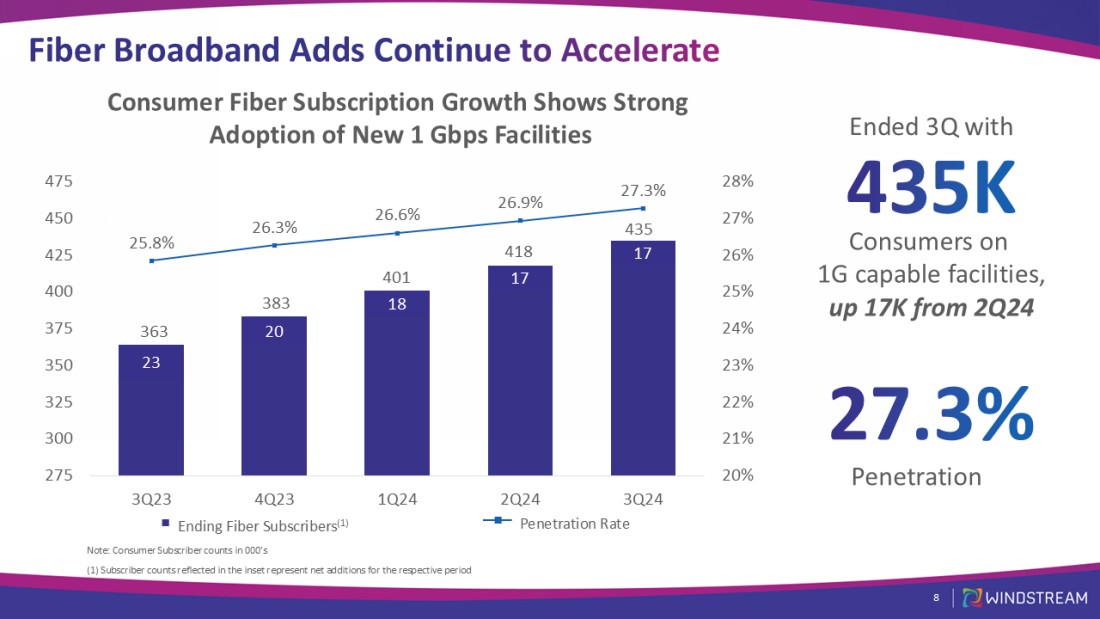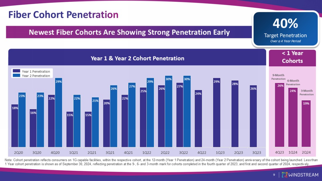 < 1 Year Cohorts 18% 16% 22% 15% 15% 20% 22% 25% 26% 27% 24% 29% 28% 26% 23% 23% 29% 22% 21% 26% 27% 29% 30% 30% 2Q20 3Q20 4Q20 1Q21 2Q21 3Q21 4Q21 1Q22 2Q22 3Q22 4Q22 1Q23 2Q23 3Q23 26% 24% 19% 4Q23 1Q24 2Q24 Newest Fiber Cohorts Are Showing Strong Penetration Early Note: Cohort penetration reflects consumers on 1G capable facilities, within the respective cohort, at the 12 - month (Year 1 Penetratio n) and 24 - month (Year 2 Penetration) anniversary of the cohort being launched. Less than 1 Year cohort penetration is shown as of September 30, 2024, reflecting penetration at the 9 - , 6 - and 3 - month mark for cohorts c ompleted in the fourth quarter of 2023, and first and second quarter of 2024, respectively. 40% Target Penetration Over a 4 Year Period 6 - Month Penetration 3 - Month Penetration Year 1 & Year 2 Cohort Penetration Year 1 Penetration Year 2 Penetration 9 - Month Penetration 9