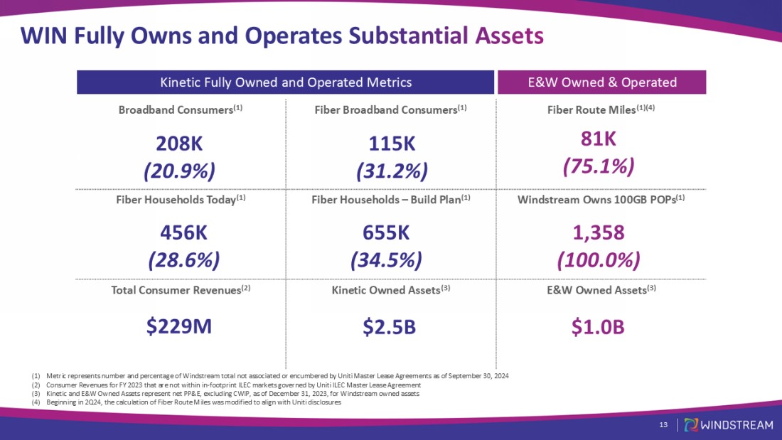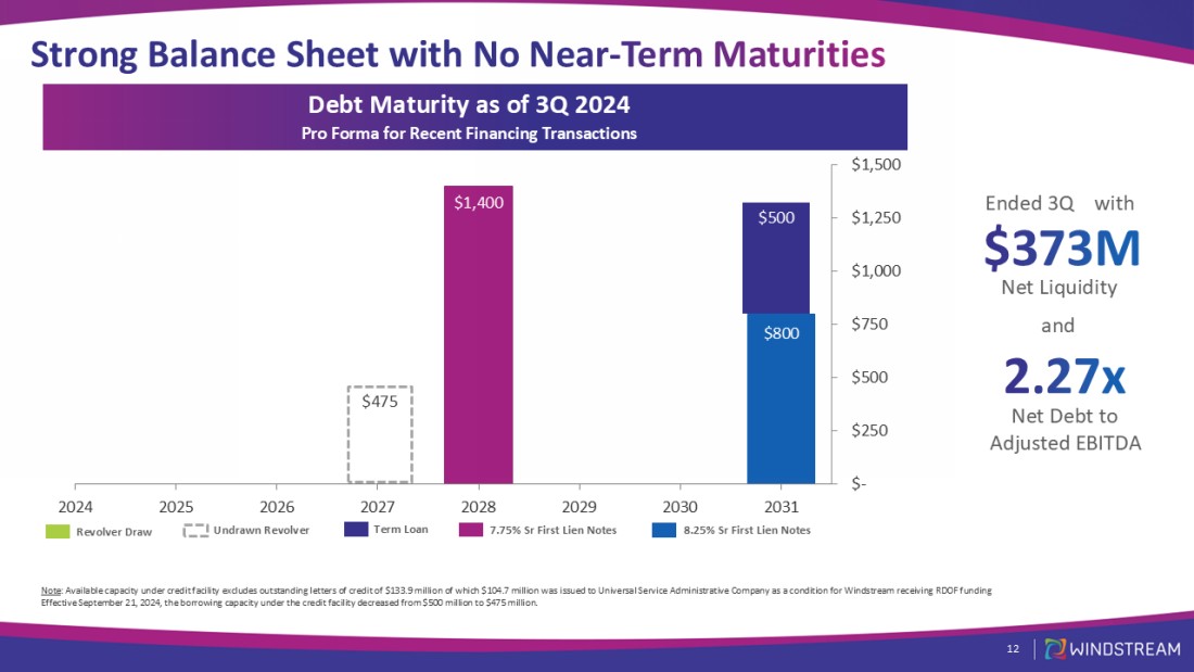 $0 $0 $0 $0 $1,400 $800 $- $250 $500 $750 $1,000 $1,250 $1,500 2024 2025 2026 2027 2028 2029 2030 2031 $475 Debt Maturity as of November 10, 2022 Revolver Draw Note : Available capacity under credit facility excludes outstanding letters of credit of $133.9 million of which $104.7 million w as issued to Universal Service Administrative Company as a condition for Windstream receiving RDOF funding Effective September 21, 2024, the borrowing capacity under the credit facility decreased from $500 million to $475 million. Net Liquidity Net Debt to Adjusted EBITDA Debt Maturity as of 3Q 2024 Pro Forma for Recent Financing Transactions 12 Term Loan 7.75% Sr First Lien Notes Undrawn Revolver 8.25% Sr First Lien Notes Ended 3Q with and $500