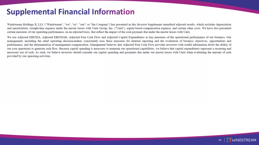 14 2024 Guidance 2023 Results (all $ in millions) Approximately flat y - o - y (adjusted for ACP expiration) (2) $1,488M Adjusted EBITDAR (1) Approximately $700M $798M Capex, net (3) Approximately $140M $155M Unlevered Free Cash Flow (4) 75K (lowered from previous: “Similar to 2023”) 96K Fiber Consumer Customer Additions 180K - 200K (lowered from previous: Approximately 200K) 232K Fiber Premises Constructed (1) 2024 Adjusted EBITDAR guidance excludes the impact of non - core operating asset sales during the period (2) Adjusted for expected wind - down of the Affordable Connectivity Program (ACP) in 2Q 2024. Windstream’s ACP customer base currently receives ~ $3M in monthly subsidy under this program (3) Adjusted Capex, less GCI reimbursements (4) Total change in cash, excluding cash interest, cash taxes and debt amortization payments