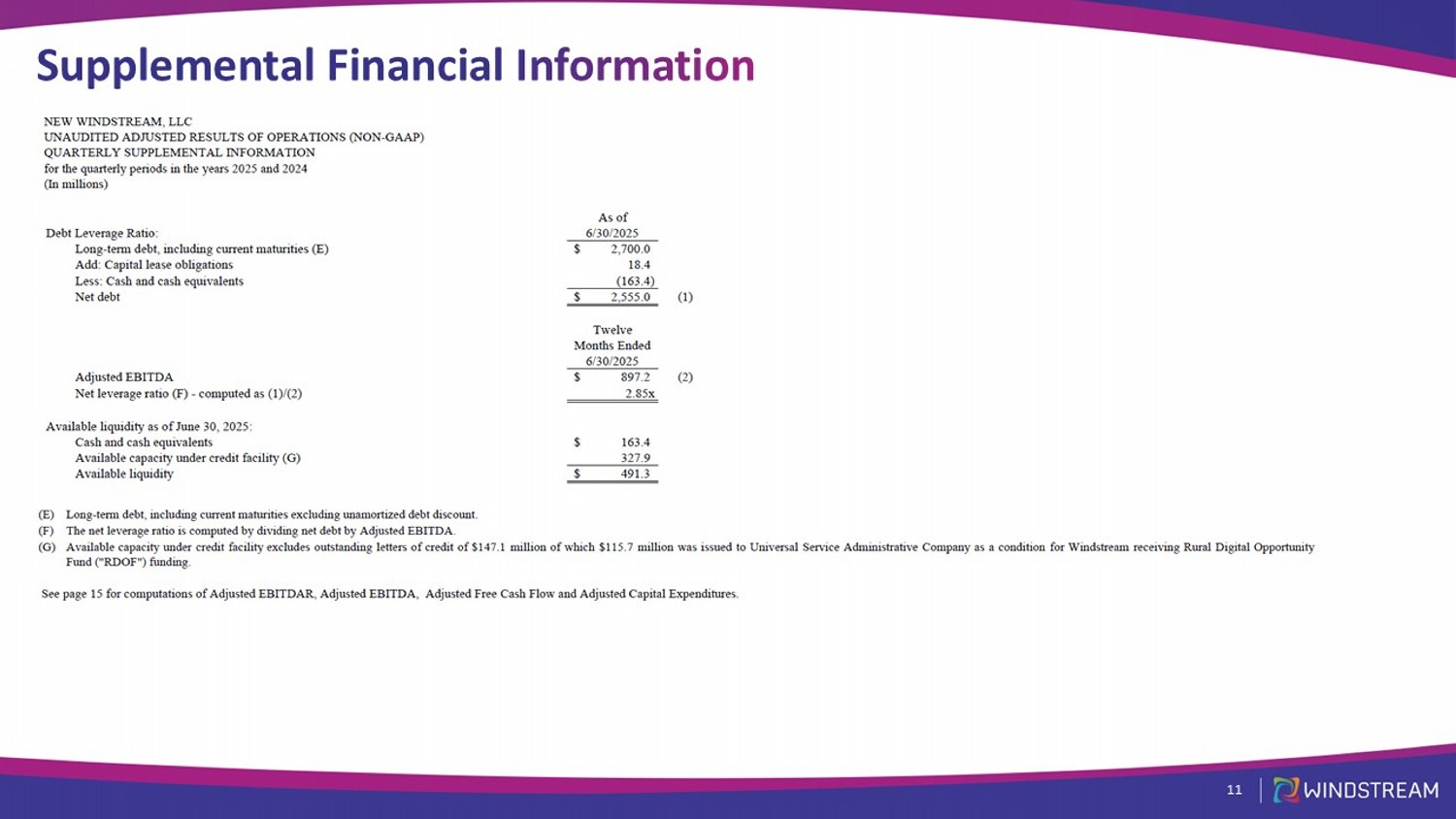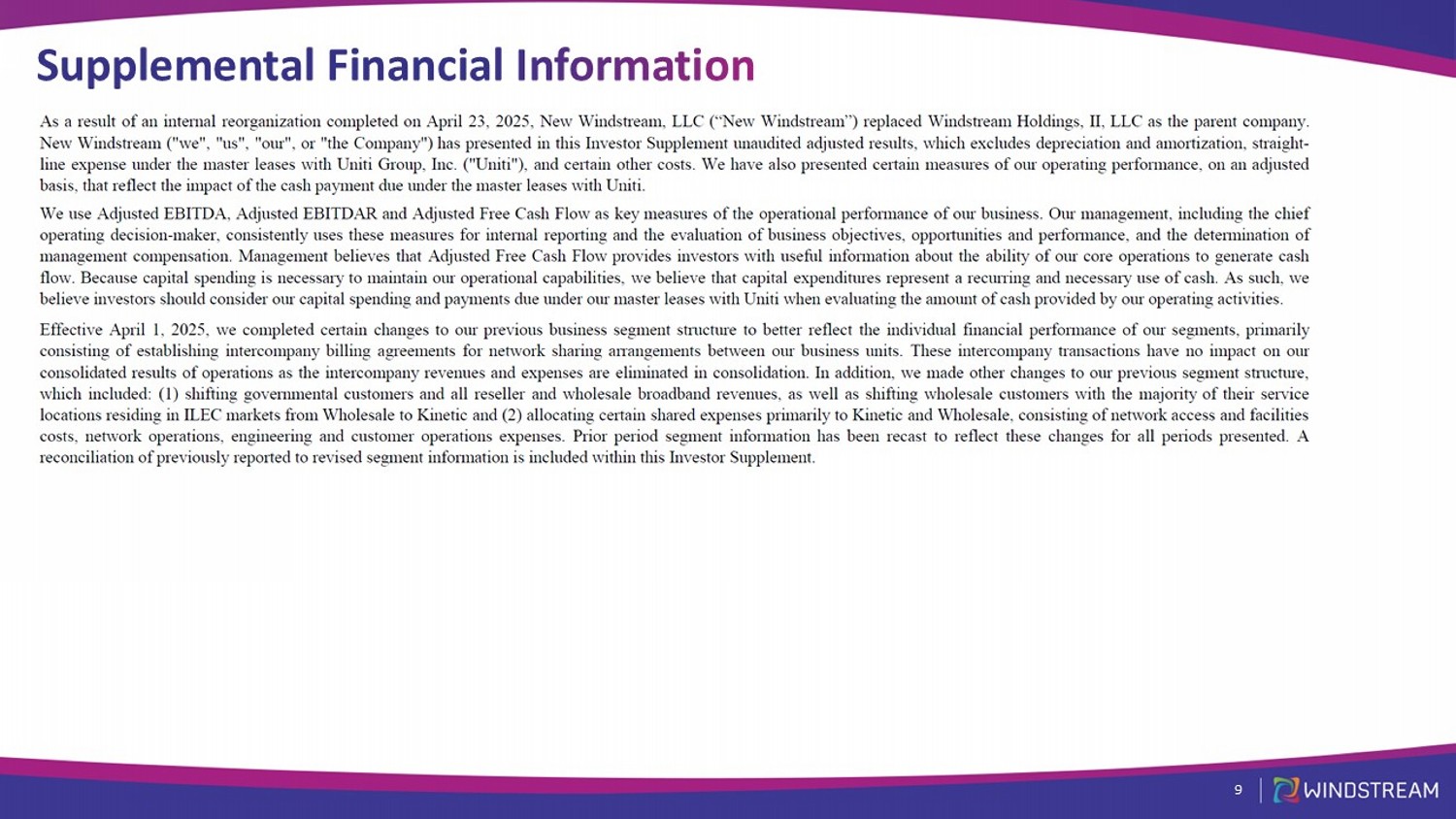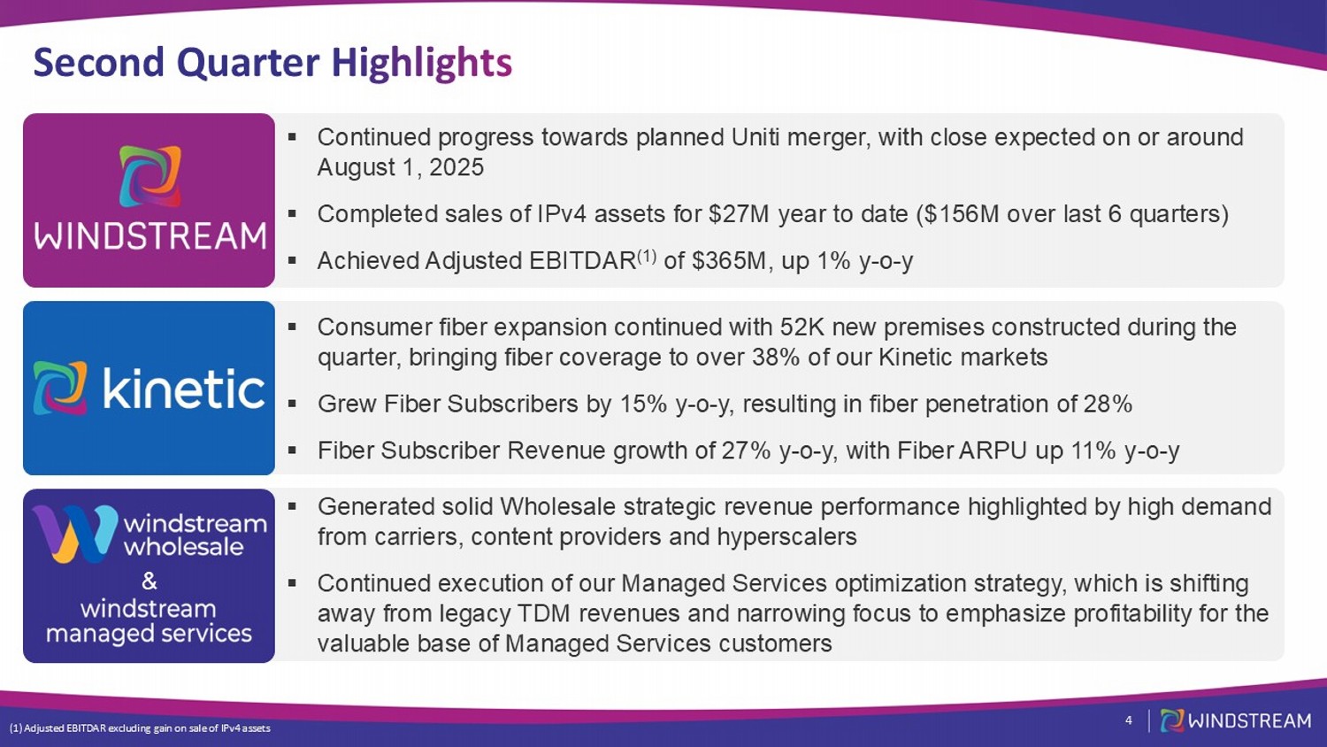 2 This presentation includes forward - looking statements that are subject to risks and uncertainties that could cause actual future events and results to differ materially from those expressed in the forward - looking statements. Forward - looking statements are typically identified by words or phrases such as “will,” “anticipate,” “estimate,” “e xpect,” “project,” “intend,” “plan,” “believe,” “target,” “forecast” and other words and terms of similar meaning. Forward - looking statements include, but are not limited to, guidance regarding 2025 financial and operational results and our ab ility to execute our 2025 strategic goals supporting the guidance, including planned acceleration of our fiber deployment and our ability to increase our fiber penetration; the number of households or locations we may be able to serve generally and related to funding from various current or future state and federal broadband programs, public - private partnerships with government entities, the Rural Digital Opportunity Fund, and th e BEAD program; our ability to continue positive trends regarding ARPU and fiber broadband adds; opportunities related to strategic sales, products, and strategic revenue growth across our business units; e xpe ctations regarding expense management activities, and the timing and benefit of such activities; statements regarding possible benefits and opportunities related to the proposed transaction with Uniti Group, In c.; and any other statements regarding plans, objectives, expectations and intentions and other statements that are not historical facts. These statements, along with other forward - looking statements regarding Windstream’s o verall business outlook, are based on estimates, projections, beliefs, and assumptions that Windstream believes are reasonable but are not guarantees of future events, performance, or results. Actual future event s a nd results may differ materially from those expressed in these forward - looking statements as the result of a number of important factors. Important factors that could cause actual results to differ materially from those indicated by such forward - looking statements i nclude risks and uncertainties relating to increased competitive pressures as state and federal broadband funding programs provide opportunities for new entrants in our markets, or prefer municipal cooperatives, leading to possible overbuilding of our network; our ability to, and the extent to which, we participate in broadband funding programs, such as BEAD, and are able to successfully secure funding via competitive bidding pro cesses over competitors; the uncertainty surrounding the BEAD program in light of the revised federal guidance regarding the program; the effect of any changes in federal or state governmental regulations or sta tut es or new requirements or restrictions contained in executive orders that could impact our business or the business of our customers; increased oversight or enforcement activities by state or federal agencies, partic ula rly based on our status as a federal and state government contractor; that the proposed transaction with Uniti Group, Inc., could cause distraction by management, increased employee turnover, and an allocation of res ources that otherwise would have been attributed to the business; risks and uncertainties from cost pressures, trade tariffs, trade disputes, or inflation on our business or on our customers’ communications and paym ent decisions and on the business of our vendors; adverse economic, political or market conditions related to foreign wars or unrest, political upheaval epidemics, pandemics, or disease outbreaks, and the impact o f t hese conditions on our business operations and financial position and on our customers; any supply chain impact from trade tariffs or trade disputes on our vendors that may impact our business operations and our custo mer s’ ability to operate their business; that the expected benefits of cost and expense management activities are not realized or adversely affect our sales and operations or are otherwise disruptive to our busine ss and personnel; the impact of new, emerging, or competing technologies and our ability to utilize these technologies to provide services to our customers; and general U.S. and worldwide economic conditions and relat ed uncertainties. Windstream does not undertake any obligation to publicly update any forward - looking statement, whether as a result of new information, future events or otherwise.
