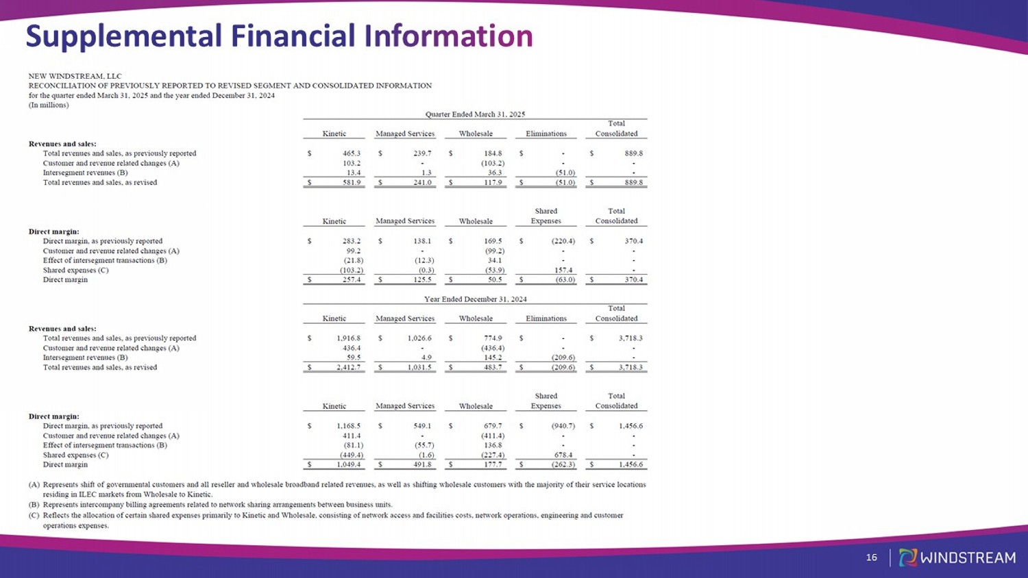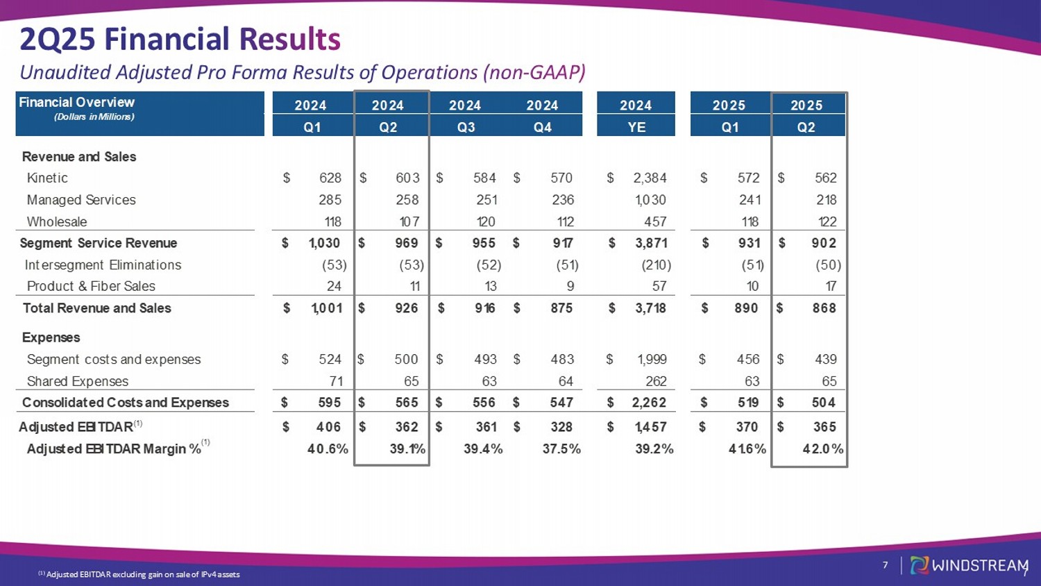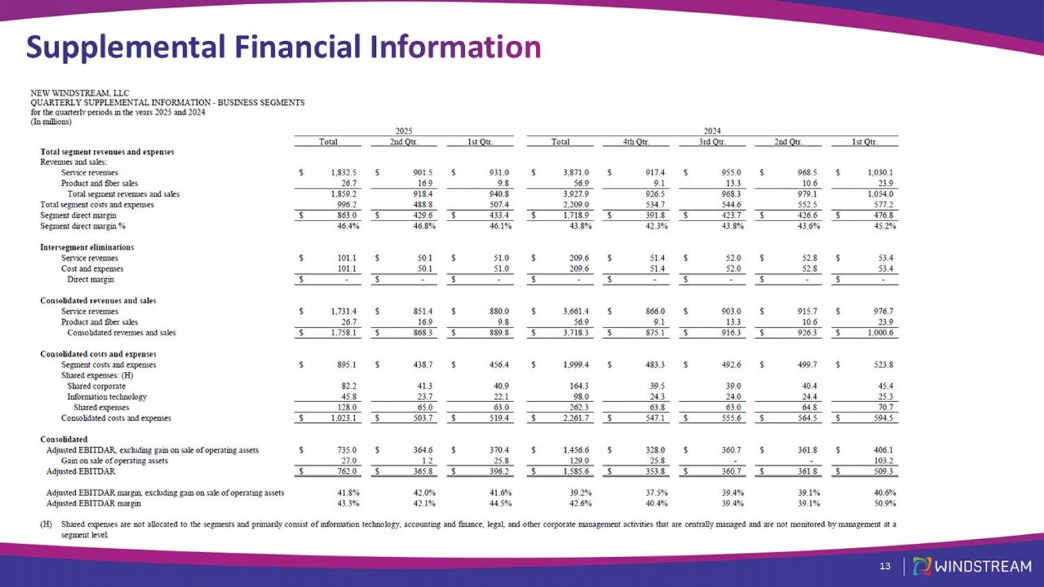 2 This presentation includes forward - looking statements that are subject to risks and uncertainties that could cause actual future events and results to differ materially from those expressed in the forward - looking statements. Forward - looking statements are typically identified by words or phrases such as “will,” “anticipate,” “estimate,” “e xpect,” “project,” “intend,” “plan,” “believe,” “target,” “forecast” and other words and terms of similar meaning. Forward - looking statements include, but are not limited to, guidance regarding 2025 financial and operational results and our ab ility to execute our 2025 strategic goals supporting the guidance, including planned acceleration of our fiber deployment and our ability to increase our fiber penetration; the number of households or locations we may be able to serve generally and related to funding from various current or future state and federal broadband programs, public - private partnerships with government entities, the Rural Digital Opportunity Fund, and th e BEAD program; our ability to continue positive trends regarding ARPU and fiber broadband adds; opportunities related to strategic sales, products, and strategic revenue growth across our business units; e xpe ctations regarding expense management activities, and the timing and benefit of such activities; statements regarding possible benefits and opportunities related to the proposed transaction with Uniti Group, In c.; and any other statements regarding plans, objectives, expectations and intentions and other statements that are not historical facts. These statements, along with other forward - looking statements regarding Windstream’s o verall business outlook, are based on estimates, projections, beliefs, and assumptions that Windstream believes are reasonable but are not guarantees of future events, performance, or results. Actual future event s a nd results may differ materially from those expressed in these forward - looking statements as the result of a number of important factors. Important factors that could cause actual results to differ materially from those indicated by such forward - looking statements i nclude risks and uncertainties relating to increased competitive pressures as state and federal broadband funding programs provide opportunities for new entrants in our markets, or prefer municipal cooperatives, leading to possible overbuilding of our network; our ability to, and the extent to which, we participate in broadband funding programs, such as BEAD, and are able to successfully secure funding via competitive bidding pro cesses over competitors; the uncertainty surrounding the BEAD program in light of the revised federal guidance regarding the program; the effect of any changes in federal or state governmental regulations or sta tut es or new requirements or restrictions contained in executive orders that could impact our business or the business of our customers; increased oversight or enforcement activities by state or federal agencies, partic ula rly based on our status as a federal and state government contractor; that the proposed transaction with Uniti Group, Inc., could cause distraction by management, increased employee turnover, and an allocation of res ources that otherwise would have been attributed to the business; risks and uncertainties from cost pressures, trade tariffs, trade disputes, or inflation on our business or on our customers’ communications and paym ent decisions and on the business of our vendors; adverse economic, political or market conditions related to foreign wars or unrest, political upheaval epidemics, pandemics, or disease outbreaks, and the impact o f t hese conditions on our business operations and financial position and on our customers; any supply chain impact from trade tariffs or trade disputes on our vendors that may impact our business operations and our custo mer s’ ability to operate their business; that the expected benefits of cost and expense management activities are not realized or adversely affect our sales and operations or are otherwise disruptive to our busine ss and personnel; the impact of new, emerging, or competing technologies and our ability to utilize these technologies to provide services to our customers; and general U.S. and worldwide economic conditions and relat ed uncertainties. Windstream does not undertake any obligation to publicly update any forward - looking statement, whether as a result of new information, future events or otherwise.