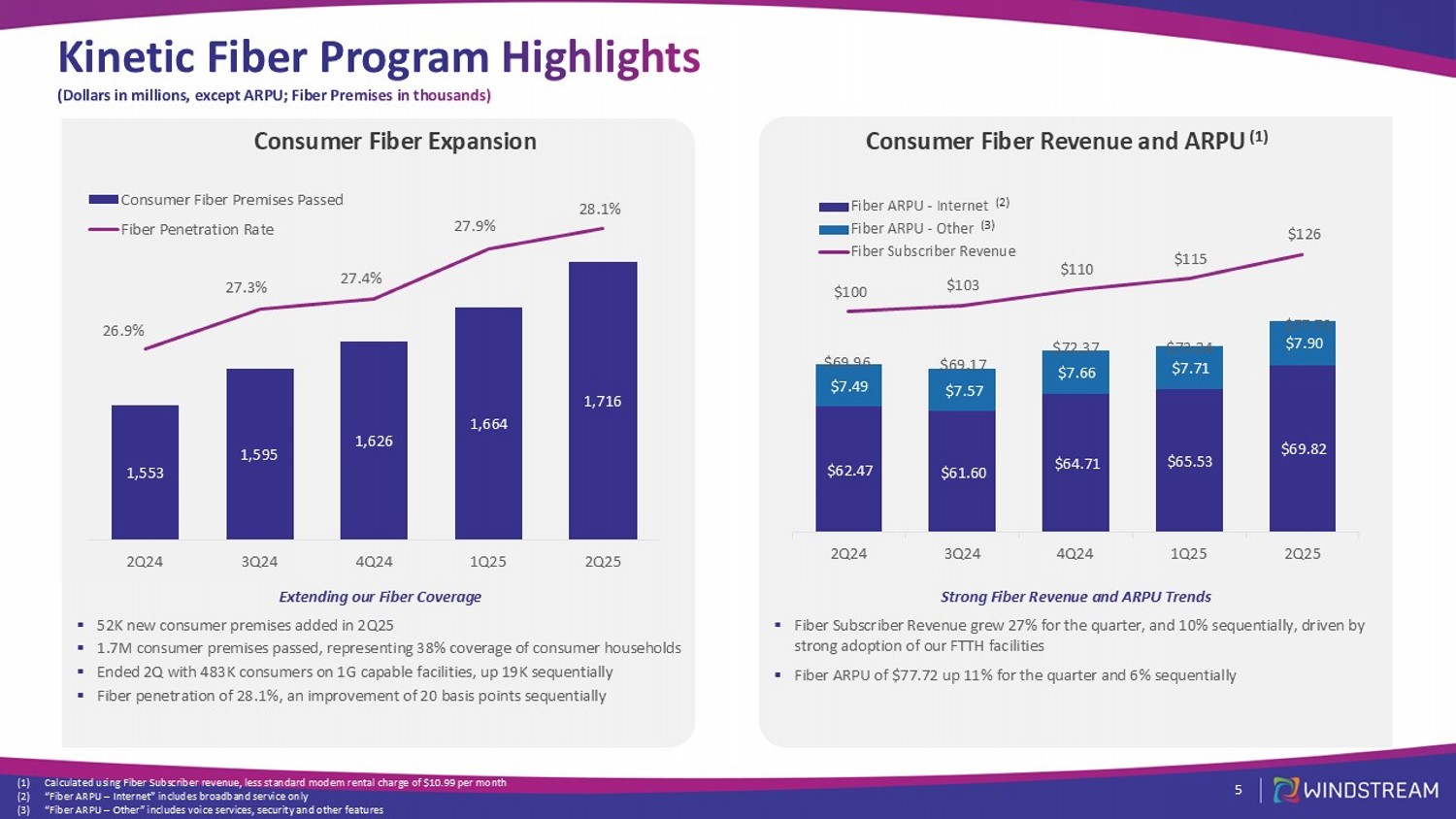 4 ▪ Continued progress towards planned Uniti merger, with close expected on or around August 1, 2025 ▪ Completed sales of IPv4 assets for $27M year to date ($156M over last 6 quarters) ▪ Achieved Adjusted EBITDAR (1) of $365M , up 1% y - o - y ▪ Consumer fiber expansion continued with 52K new premises constructed during the quarter, bringing fiber coverage to over 38% of our Kinetic markets ▪ Grew Fiber Subscribers by 15% y - o - y, resulting in fiber penetration of 28% ▪ Fiber Subscriber Revenue growth of 27 % y - o - y, with Fiber ARPU up 11% y - o - y ▪ Generated solid Wholesale strategic revenue performance highlighted by high demand from carriers, content providers and hyperscalers ▪ Continued execution of our Managed Services optimization strategy, which is shifting away from legacy TDM revenues and narrowing focus to emphasize profitability for the valuable base of Managed Services customers (1) Adjusted EBITDAR excluding gain on sale of IPv4 assets &
