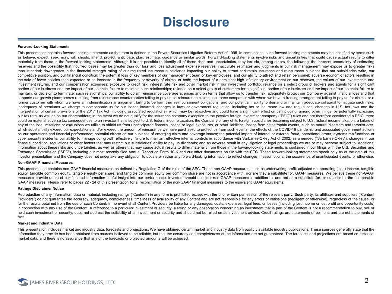 Disclosure Forward - Looking Statements This presentation contains forward - looking statements as that term is defined in the Private Securities Litigation Reform Act of 1995 . In some cases, such forward - looking statements may be identified by terms such as believe, expect, seek, may, will, should, intend, project, anticipate, plan, estimate, guidance or similar words . Forward - looking statements involve risks and uncertainties that could cause actual results to differ materially from those in the forward - looking statements . Although it is not possible to identify all of these risks and uncertainties, they include, among others, the following : the inherent uncertainty of estimating reserves and the possibility that incurred losses may be greater than our loss and loss adjustment expense reserves ; inaccurate estimates and judgments in our risk management may expose us to greater risks than intended ; downgrades in the financial strength rating of our regulated insurance subsidiaries impacting our ability to attract and retain insurance and reinsurance business that our subsidiaries write, our competitive position, and our financial condition ; the potential loss of key members of our management team or key employees, and our ability to attract and retain personnel ; adverse economic factors resulting in the sale of fewer policies than expected or an increase in the frequency or severity of claims, or both ; the impact of a persistent high inflationary environment on our reserves, the values of our investments and investment returns, and our compensation expenses ; exposure to credit risk, interest rate risk and other market risk in our investment portfolio ; reliance on a select group of brokers and agents for a significant portion of our business and the impact of our potential failure to maintain such relationships ; reliance on a select group of customers for a significant portion of our business and the impact of our potential failure to maintain, or decision to terminate, such relationships ; our ability to obtain reinsurance coverage at prices and on terms that allow us to transfer risk, adequately protect our Company against financial loss and that supports our growth plans ; losses resulting from reinsurance counterparties failing to pay us on reinsurance claims, insurance companies with whom we have a fronting arrangement failing to pay us for claims, or a former customer with whom we have an indemnification arrangement failing to perform their reimbursement obligations, and our potential inability to demand or maintain adequate collateral to mitigate such risks ; inadequacy of premiums we charge to compensate us for our losses incurred ; changes in laws or government regulation, including tax or insurance law and regulations ; changes in U . S . tax laws and the interpretation of certain provisions of the 2017 Tax Act (including associated regulations), which may be retroactive and could have a significant effect on us including, among other things, by potentially increasing our tax rate, as well as on our shareholders ; in the event we do not qualify for the insurance company exception to the passive foreign investment company (“PFIC”) rules and are therefore considered a PFIC, there could be material adverse tax consequences to an investor that is subject to U . S . federal income taxation ; the Company or any of its foreign subsidiaries becoming subject to U . S . federal income taxation ; a failure of any of the loss limitations or exclusions we utilize to shield us from unanticipated financial losses or legal exposures, or other liabilities ; losses from catastrophic events, such as natural disasters and terrorist acts, which substantially exceed our expectations and/or exceed the amount of reinsurance we have purchased to protect us from such events ; the effects of the COVID - 19 pandemic and associated government actions on our operations and financial performance ; potential effects on our business of emerging claim and coverage issues ; the potential impact of internal or external fraud, operational errors, systems malfunctions or cyber security incidents ; our ability to manage our growth effectively ; failure to maintain effective internal controls in accordance with Sarbanes - Oxley Act of 2002 , as amended (“Sarbanes - Oxley”) ; changes in our financial condition, regulations or other factors that may restrict our subsidiaries’ ability to pay us dividends ; and an adverse result in any litigation or legal proceedings we are or may become subject to . Additional information about these risks and uncertainties, as well as others that may cause actual results to differ materially from those in the forward - looking statements, is contained in our filings with the U . S . Securities and Exchange Commission ("SEC"), including our most recently filed Annual Report on Form 10 - K and our other documents on file with the SEC . These forward - looking statements speak only as of the date of this investor presentation and the Company does not undertake any obligation to update or revise any forward - looking information to reflect changes in assumptions, the occurrence of unanticipated events, or otherwise . Non - GAAP Financial Measures This presentation contains non - GAAP financial measures as defined by Regulation G of the rules of the SEC . These non - GAAP measures, such as underwriting profit, adjusted net operating (loss) income, tangible equity, tangible common equity, tangible equity per share, and tangible common equity per common share are not in accordance with, nor are they a substitute for, GAAP measures . We believe these non - GAAP measures provide users of our financial information useful insight into our performance . Investors should consider non - GAAP measures in addition to, and not as a substitute for, or superior to, the comparable GAAP measures . Please refer to pages 22 - 24 of this presentation for a reconciliation of the non 