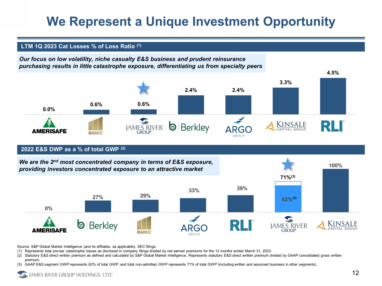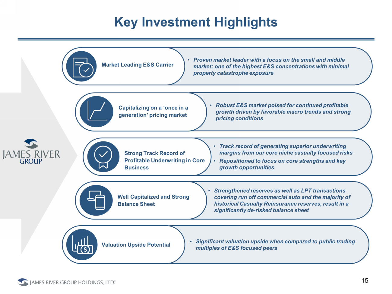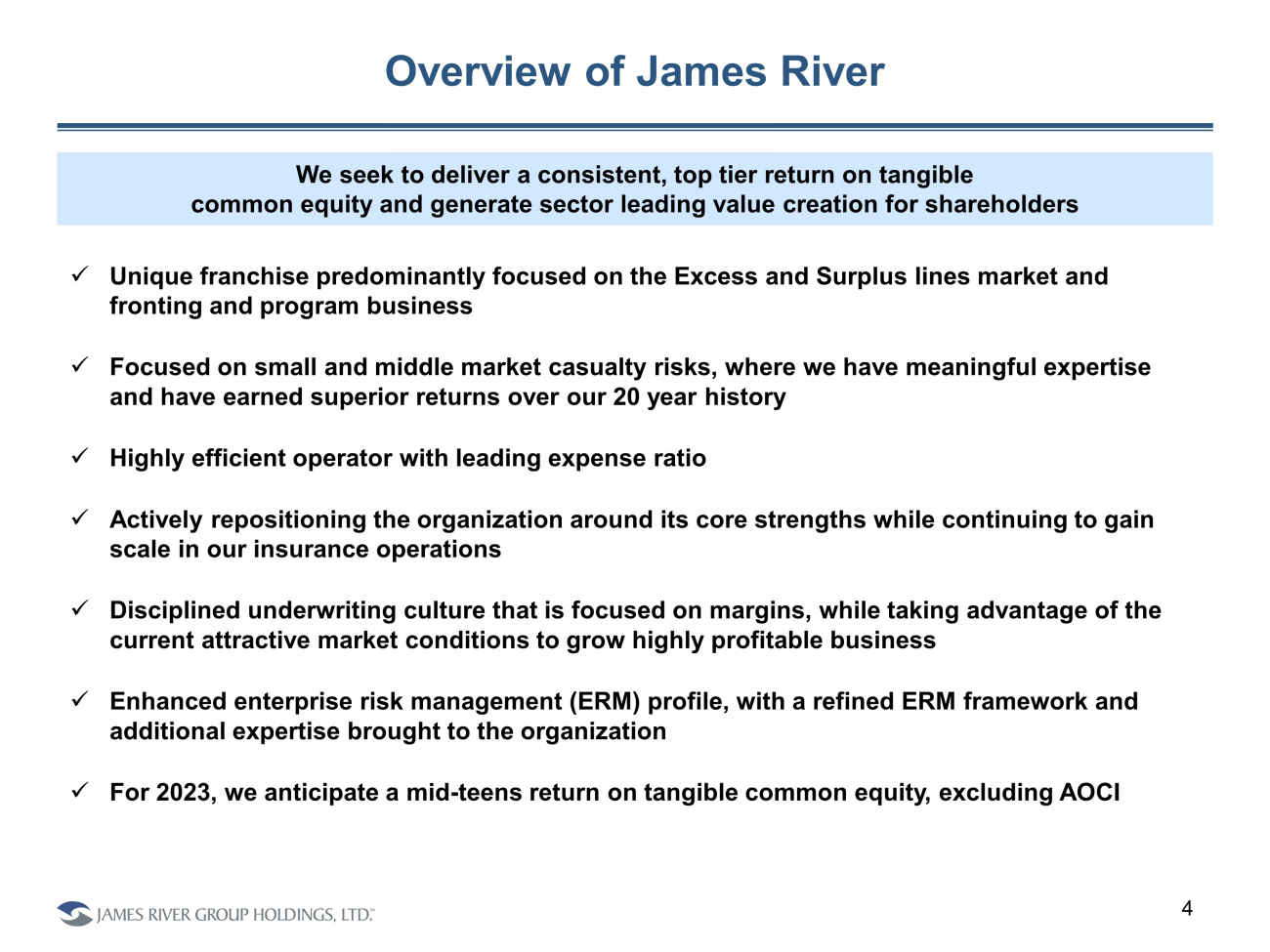 4 Overview of James River We seek to deliver a consistent, top tier return on tangible common equity and generate sector leading value creation for shareholders x Unique franchise predominantly focused on the Excess and Surplus lines market and fronting and program business x Focused on small and middle market casualty risks, where we have meaningful expertise and have earned superior returns over our 20 year history x Highly efficient operator with leading expense ratio x Actively repositioning the organization around its core strengths while continuing to gain scale in our insurance operations x Disciplined underwriting culture that is focused on margins, while taking advantage of the current attractive market conditions to grow highly profitable business x Enhanced enterprise risk management (ERM) profile, with a refined ERM framework and additional expertise brought to the organization x For 2023, we anticipate a mid - teens return on tangible common equity, excluding AOCI
