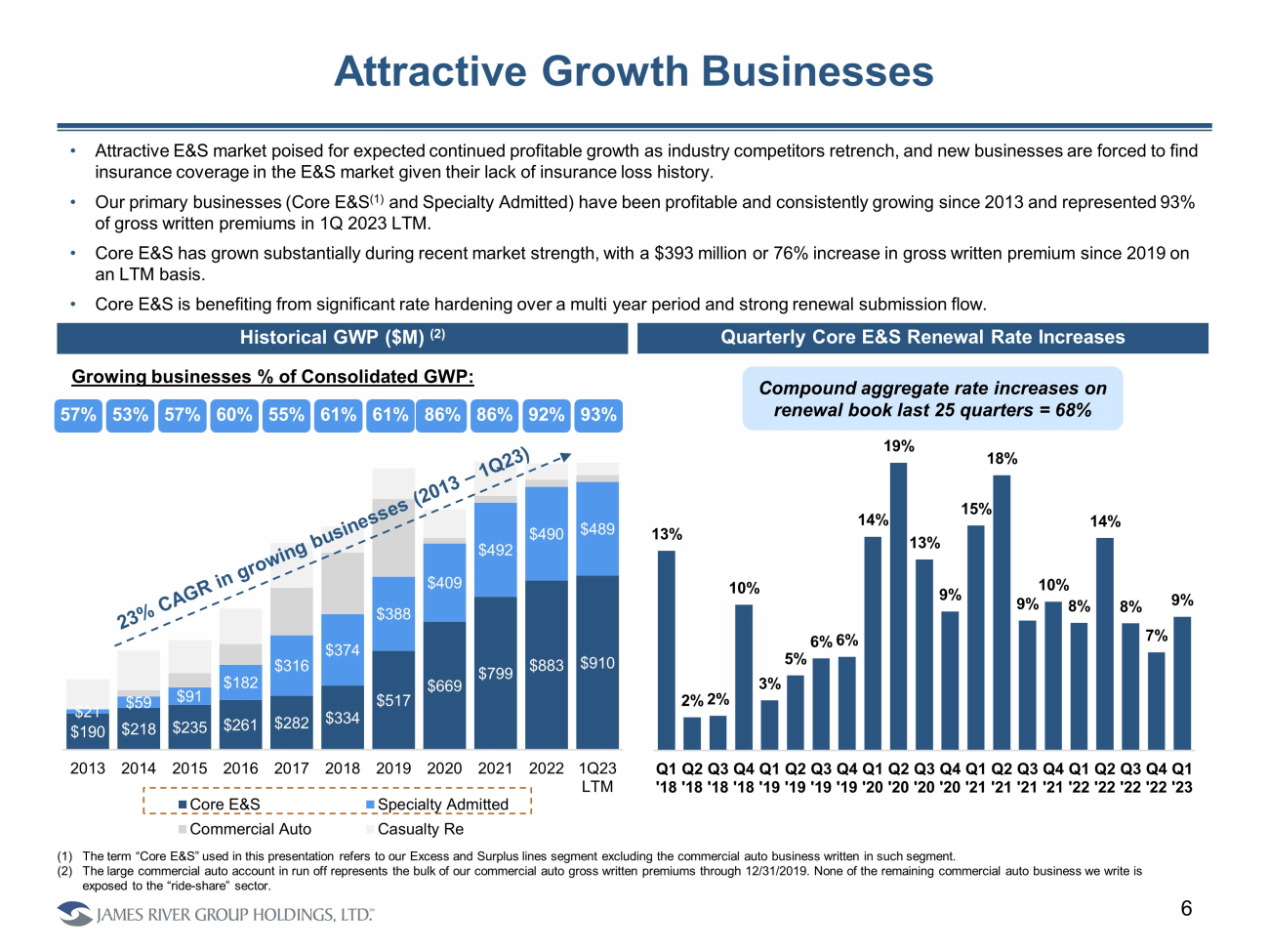 Our Business 5 Our Key Growth Opportunities E&S Segment Specialty Admitted Segment Casualty Reinsurance Segment PROFITABLE SPECIALTY UNDERWRITING A FOCUS ON FEE INCOME SUSPENDING UNDERWRITING ACTIVITIES 63% of 1Q 2023 LTM Consolidated GWP 33% of 1Q 2023 LTM Consolidated GWP $946 MM 1Q 2023 LTM GWP $489 MM 1Q 2023 LTM GWP $82 MM 1Q 2023 LTM Underwriting Profit 85.8% Combined Ratio 1Q 2023 LTM $3.6 MM Underwriting Profit 95.3% Combined Ratio • We are a specialty, low volatility underwriting company with an attractive, sizeable Excess & Surplus (“E&S”) franchise and s cal ing “capital light” fronting business experiencing a robust market for property and casualty risk. • Little catastrophe or cyber underwriting exposure, and effective use of reinsurance to limit volatility. • Our focus is small and medium sized commercial account E&S casualty business which we look to continue to complement with a g row ing fronting business generating fee income within our Specialty Admitted segment. • Our balance sheet has been significantly de - risked by two loss portfolio transfer (“LPT”) transactions on distinct books of busi ness, as well as significant reserve strengthening, and capital raised, since 2021. • Segment includes (i) a growing, deal - driven, “capital light” fee business that fronts admitted and non - admitted business and (ii) a targeted book of workers’ compensation risks • Business is scaling, as fee income grows and new programs are added, with a stable expense and capital base • Experienced management team with a robust pipeline of new programs • Gross f ee income of $6 MM for 1Q 2023 increased 3% compared to 1Q 2022 • We have decided to suspend writing business in this segment • Segment was meaningfully downsized in 2022 • Majority of legacy reserves significantly de - risked via LPT closed in March 2022 • Third - party proportional and working - layer casualty business focused on small and medium U.S. specialty lines • Loss mitigation features are widely utilized across the book • Focus is on small and medium sized commercial account E&S casualty business; generally $1.0 MM per occurrence limits; ~$24,000 average premium per policy • Significant strength in current market environment • The E&S segment has experienced 25 consecutive quarters of renewal rate increases; 68% CAGR over that time period • Underwritten by specialists in 13 divisions and distributed through ~100 broker groups