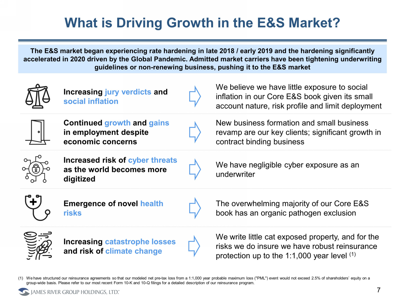 $190 $218 $235 $261 $282 $334 $517 $669 $799 $883 $910 $21 $59 $91 $182 $316 $374 $388 $409 $492 $490 $489 2013 2014 2015 2016 2017 2018 2019 2020 2021 2022 1Q23 LTM Core E&S Specialty Admitted Commercial Auto Casualty Re 13% 2% 2% 10% 3% 5% 6% 6% 14% 19% 13% 9% 15% 18% 9% 10% 8% 14% 8% 7% 9% Q1 '18 Q2 '18 Q3 '18 Q4 '18 Q1 '19 Q2 '19 Q3 '19 Q4 '19 Q1 '20 Q2 '20 Q3 '20 Q4 '20 Q1 '21 Q2 '21 Q3 '21 Q4 '21 Q1 '22 Q2 '22 Q3 '22 Q4 '22 Q1 '23 6 Attractive Growth Businesses Historical GWP ($M) (2) Quarterly Core E&S Renewal Rate Increases Growing businesses % of Consolidated GWP: 57% 53 % 60% 61% 57% 61% 86 % 86 % (1) The term “Core E&S” used in this presentation refers to our Excess and Surplus lines segment excluding the commercial auto bu sin ess written in such segment. (2) The large commercial auto account in run off represents the bulk of our commercial auto gross written premiums through 12/31/ 201 9. None of the remaining commercial auto business we write is exposed to the “ride - share” sector. 92% 93 % Compound aggregate rate increases on renewal book last 25 quarters = 68% • Attractive E&S market poised for expected continued profitable growth as industry competitors retrench, and new businesses ar e f orced to find insurance coverage in the E&S market given their lack of insurance loss history. • Our primary businesses (Core E&S (1) and Specialty Admitted) have been profitable and consistently growing since 2013 and represented 93% of gross written premiums in 1Q 2023 LTM. • Core E&S has grown substantially during recent market strength, with a $393 million or 76% increase in gross written premium sin ce 2019 on an LTM basis. • Core E&S is benefiting from significant rate hardening over a multi year period and strong renewal submission flow. 55% 86 %