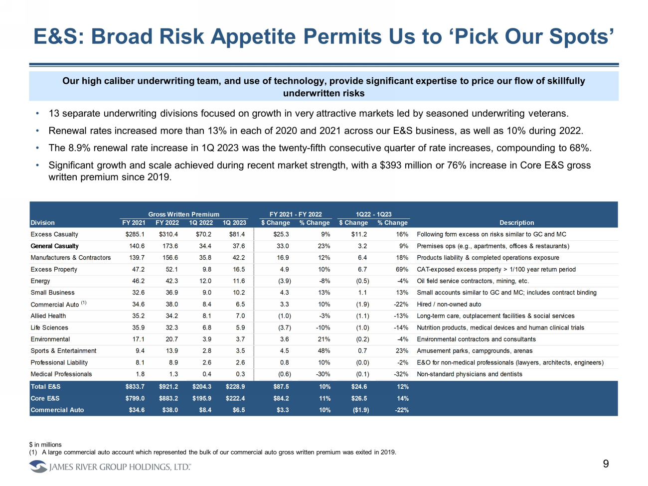71% 75% 74% 83% 100% 94% 87% 95% 89% 87% 96% 97% 98% 101% 104% 99% 99% 99% 100% 103% 2013 2014 2015 2016 2017 2018 2019 2020 2021 2022 E&S Industry Combined Ratio P&C Industry Combined Ratio $27.3 $28.9 $29.8 $29.9 $31.5 $34.6 $40.3 $47.6 $62.9 $75.5 2013 2014 2015 2016 2017 2018 2019 2020 2021 2022 8 The E&S Market is Highly Attractive U.S. Excess & Surplus Lines DWP ($BN) Profitability of E&S Industry vs. Total P&C Industry: 10 Year Combined Ratio P&C Industry 2013 – 2022 Average Combined Ratio: 99.6% E&S Industry 2013 – 2022 Average Combined Ratio: 85.4% E&S industry DWP has grown at double digit rates the past 5 years driven by rising renewal rates and changes in risk appetite 2013 – 2017 Average Growth Rate: 4% E&S market generated ~14 points of underwriting alpha compared to the broader P&C industry Source: S&P Global Market Intelligence (and its affiliates, as applicable).