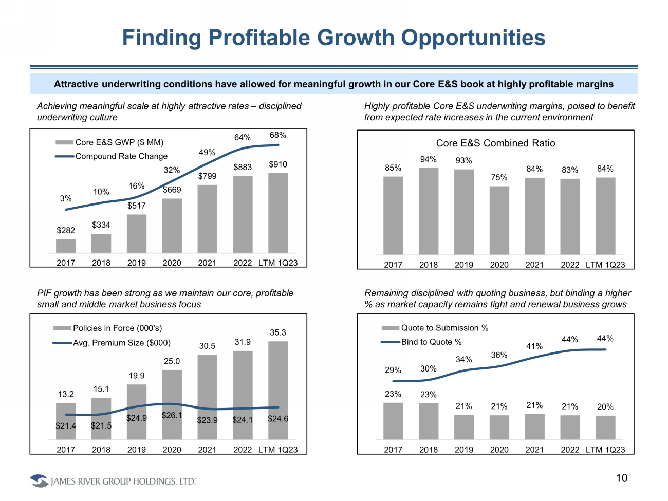 E&S: Broad Risk Appetite Permits Us to ‘Pick Our Spots’ 9 • 13 separate underwriting divisions focused on growth in very attractive markets led by seasoned underwriting veterans. • Renewal rates increased more than 13% in each of 2020 and 2021 across our E&S business, as well as 10% during 2022. • The 8.9% renewal rate increase in 1Q 2023 was the twenty - fifth consecutive quarter of rate increases, compounding to 68%. • Significant growth and scale achieved during recent market strength, with a $393 million or 76% increase in Core E&S gross written premium since 2019. Our high caliber underwriting team, and use of technology, provide significant expertise to price our flow of skillfully underwritten risks $ in millions (1) A large commercial auto account which represented the bulk of our commercial auto gross written premium was exited in 2019. Gross Written Premium FY 2021 - FY 2022 1Q22 - 1Q23 Division FY 2021 FY 2022 1Q 2022 1Q 2023 $ Change % Change $ Change % Change Description Excess Casualty $285.1 $310.4 $70.2 $81.4 $25.3 9% $11.2 16% Following form excess on risks similar to GC and MC General Casualty 140.6 173.6 34.4 37.6 33.0 23% 3.2 9% Premises ops (e.g., apartments, offices & restaurants) Manufacturers & Contractors 139.7 156.6 35.8 42.2 16.9 12% 6.4 18% Products liability & completed operations exposure Excess Property 47.2 52.1 9.8 16.5 4.9 10% 6.7 69% CAT-exposed excess property > 1/100 year return period Energy 46.2 42.3 12.0 11.6 (3.9) -8% (0.5) -4% Oil field service contractors, mining, etc. Small Business 32.6 36.9 9.0 10.2 4.3 13% 1.1 13% Small accounts similar to GC and MC; includes contract binding Commercial Auto (1) 34.6 38.0 8.4 6.5 3.3 10% (1.9) -22% Hired / non-owned auto Allied Health 35.2 34.2 8.1 7.0 (1.0) -3% (1.1) -13% Long-term care, outplacement facilities & social services Life Sciences 35.9 32.3 6.8 5.9 (3.7) -10% (1.0) -14% Nutrition products, medical devices and human clinical trials Environmental 17.1 20.7 3.9 3.7 3.6 21% (0.2) -4% Environmental contractors and consultants Sports & Entertainment 9.4 13.9 2.8 3.5 4.5 48% 0.7 23% Amusement parks, campgrounds, arenas Professional Liability 8.1 8.9 2.6 2.6 0.8 10% (0.0) -2% E&O for non-medical professionals (lawyers, architects, engineers) Medical Professionals 1.8 1.3 0.4 0.3 (0.6) -30% (0.1) -32% Non-standard physicians and dentists Total E&S $833.7 $921.2 $204.3 $228.9 $87.5 10% $24.6 12% Core E&S $799.0 $883.2 $195.9 $222.4 $84.2 11% $26.5 14% Commercial Auto $34.6 $38.0 $8.4 $6.5 $3.3 10% ($1.9) -22%