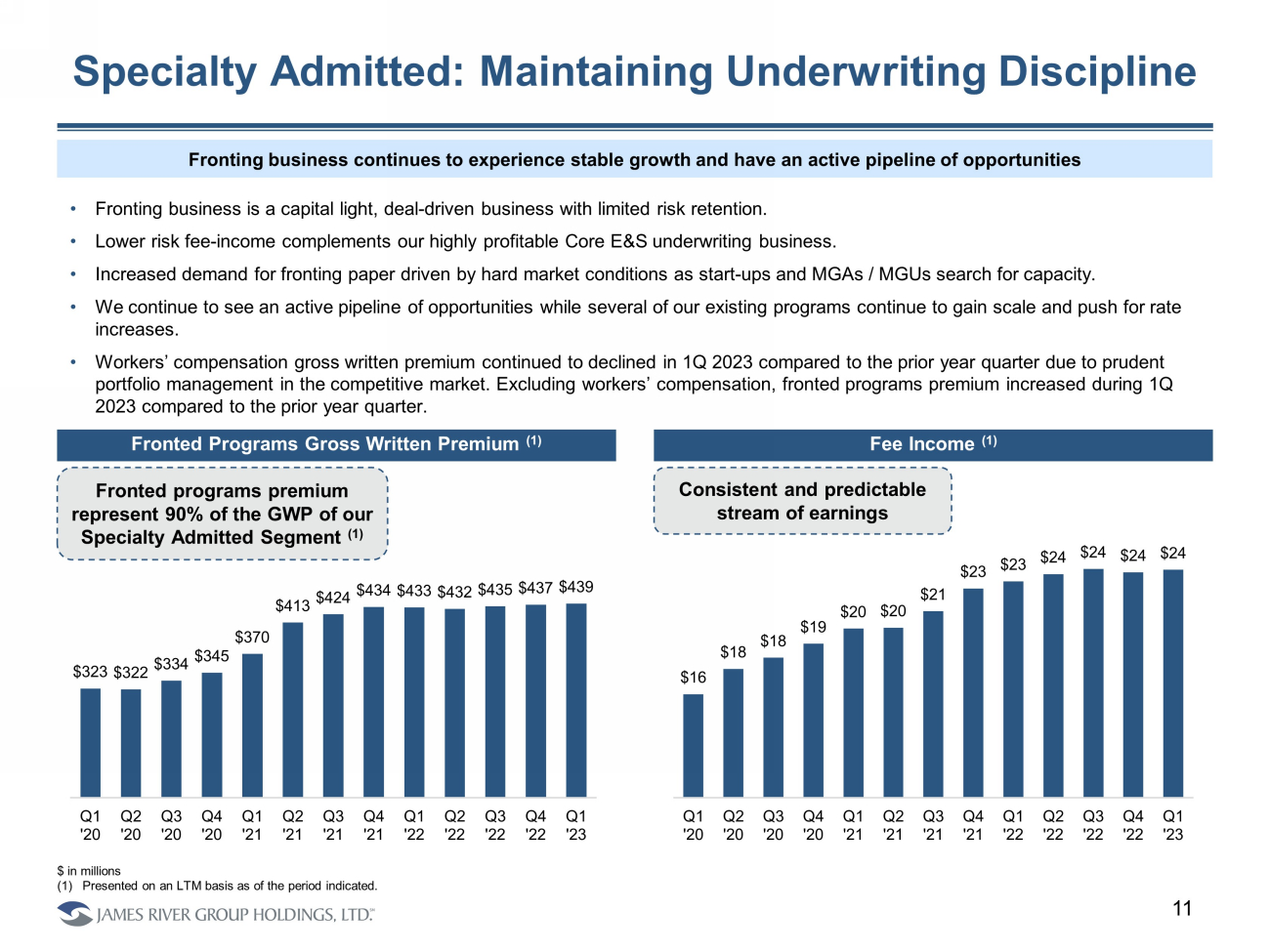 Finding Profitable Growth Opportunities 10 Attractive underwriting conditions have allowed for meaningful growth in our Core E&S book at highly profitable margins Achieving meaningful scale at highly attractive rates – disciplined underwriting culture Highly profitable Core E&S underwriting margins, poised to benefit from expected rate increases in the current environment Remaining disciplined with quoting business, but binding a higher % as market capacity remains tight and renewal business grows PIF growth has been strong as we maintain our core, profitable small and middle market business focus 23% 23% 21% 21% 21% 21% 20% 29% 30% 34% 36% 41% 44% 44% 2017 2018 2019 2020 2021 2022 LTM 1Q23 Quote to Submission % Bind to Quote % $282 $334 $517 $669 $799 $883 $910 3% 10% 16% 32% 49% 64% 68% 2017 2018 2019 2020 2021 2022 LTM 1Q23 Core E&S GWP ($ MM) Compound Rate Change 85% 94% 93% 75% 84% 83% 84% 2017 2018 2019 2020 2021 2022 LTM 1Q23 Core E&S Combined Ratio 13.2 15.1 19.9 25.0 30.5 31.9 35.3 $21.4 $21.5 $24.9 $26.1 $23.9 $24.1 $24.6 2017 2018 2019 2020 2021 2022 LTM 1Q23 Policies in Force (000's) Avg. Premium Size ($000)