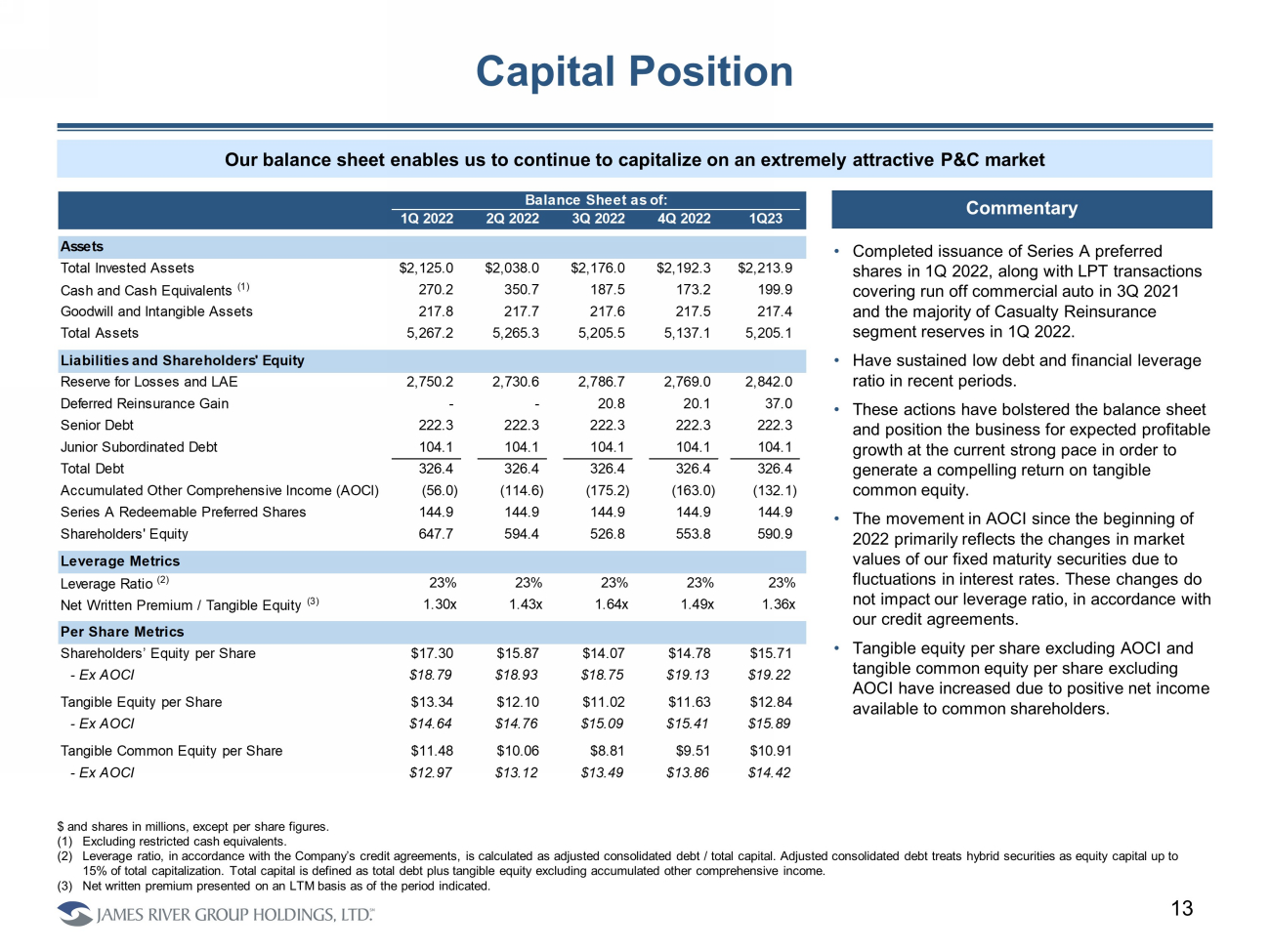 0.0% 0.6% 0.6% 2.4% 2.4% 3.3% 4.5% 0% 27% 29% 33% 39% 62% 100% 12 We Represent a Unique Investment Opportunity LTM 1Q 2023 Cat Losses % of Loss Ratio (1) 2022 E&S DWP as a % of total GWP (2) Our focus on low volatility, niche casualty E&S business and prudent reinsurance purchasing results in little catastrophe exposure, differentiating us from specialty peers We are the 2 nd most concentrated company in terms of E&S exposure, providing investors concentrated exposure to an attractive market (3) 71% (3) Source: S&P Global Market Intelligence (and its affiliates, as applicable), SEC filings. (1) Represents total pre - tax catastrophe losses as disclosed in company filings divided by net earned premiums for the 12 months end ed March 31, 2023. (2) Statutory E&S direct written premium as defined and calculated by S&P Global Market Intelligence. Represents statutory E&S di rec t written premium divided by GAAP consolidated gross written premium. (3) GAAP E&S segment GWP represents 62% of total GWP, and total non - admitted GWP represents 71% of total GWP (including written and assumed business in other segments).