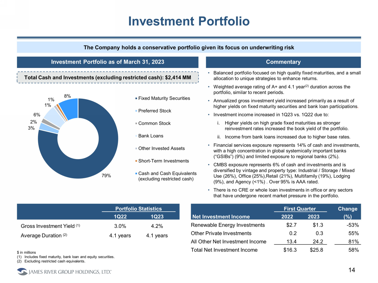 13 Capital Position Commentary • Completed issuance of Series A preferred shares in 1Q 2022, along with LPT transactions covering run off commercial auto in 3Q 2021 and the majority of Casualty Reinsurance segment reserves in 1Q 2022. • Have sustained low debt and financial leverage ratio in recent periods. • These actions have bolstered the balance sheet and position the business for expected profitable growth at the current strong pace in order to generate a compelling return on tangible common equity. • The movement in AOCI since the beginning of 2022 primarily reflects the changes in market values of our fixed maturity securities due to fluctuations in interest rates. These changes do not impact our leverage ratio, in accordance with our credit agreements. • Tangible equity per share excluding AOCI and tangible common equity per share excluding AOCI have increased due to positive net income available to common shareholders. $ and shares in millions, except per share figures. (1) Excluding restricted cash equivalents. (2) Leverage ratio, in accordance with the Company’s credit agreements, is calculated as adjusted consolidated debt / total capit al. Adjusted consolidated debt treats hybrid securities as equity capital up to 15% of total capitalization. Total capital is defined as total debt plus tangible equity excluding accumulated other comprehe nsi ve income. (3) Net written premium presented on an LTM basis as of the period indicated. Our balance sheet enables us to continue to capitalize on an extremely attractive P&C market Balance Sheet as of: 1Q 2022 2Q 2022 3Q 2022 4Q 2022 1Q23 Assets Total Invested Assets $2,125.0 $2,038.0 $2,176.0 $2,192.3 $2,213.9 Cash and Cash Equivalents (1) 270.2 350.7 187.5 173.2 199.9 Goodwill and Intangible Assets 217.8 217.7 217.6 217.5 217.4 Total Assets 5,267.2 5,265.3 5,205.5 5,137.1 5,205.1 Liabilities and Shareholders' Equity Reserve for Losses and LAE 2,750.2 2,730.6 2,786.7 2,769.0 2,842.0 Deferred Reinsurance Gain - - 20.8 20.1 37.0 Senior Debt 222.3 222.3 222.3 222.3 222.3 Junior Subordinated Debt 104.1 104.1 104.1 104.1 104.1 Total Debt 326.4 326.4 326.4 326.4 326.4 Accumulated Other Comprehensive Income (AOCI) (56.0) (114.6) (175.2) (163.0) (132.1) Series A Redeemable Preferred Shares 144.9 144.9 144.9 144.9 144.9 Shareholders' Equity 647.7 594.4 526.8 553.8 590.9 Leverage Metrics Leverage Ratio (2) 23% 23% 23% 23% 23% Net Written Premium / Tangible Equity (3) 1.30x 1.43x 1.64x 1.49x 1.36x Per Share Metrics Shareholders’ Equity per Share $17.30 $15.87 $14.07 $14.78 $15.71 - Ex AOCI $18.79 $18.93 $18.75 $19.13 $19.22 Tangible Equity per Share $13.34 $12.10 $11.02 $11.63 $12.84 - Ex AOCI $14.64 $14.76 $15.09 $15.41 $15.89 Tangible Common Equity per Share $11.48 $10.06 $8.81 $9.51 $10.91 - Ex AOCI $12.97 $13.12 $13.49 $13.86 $14.42