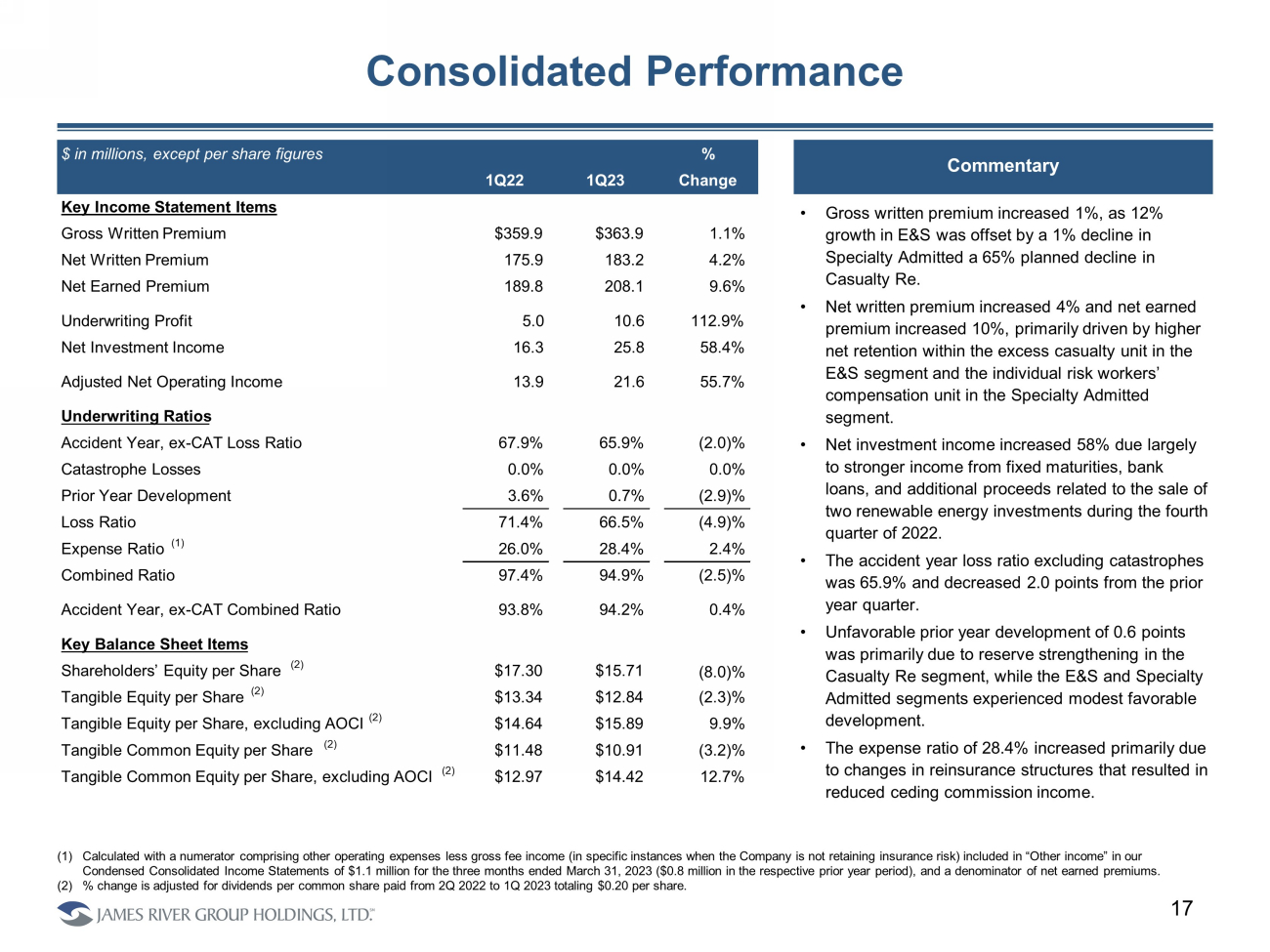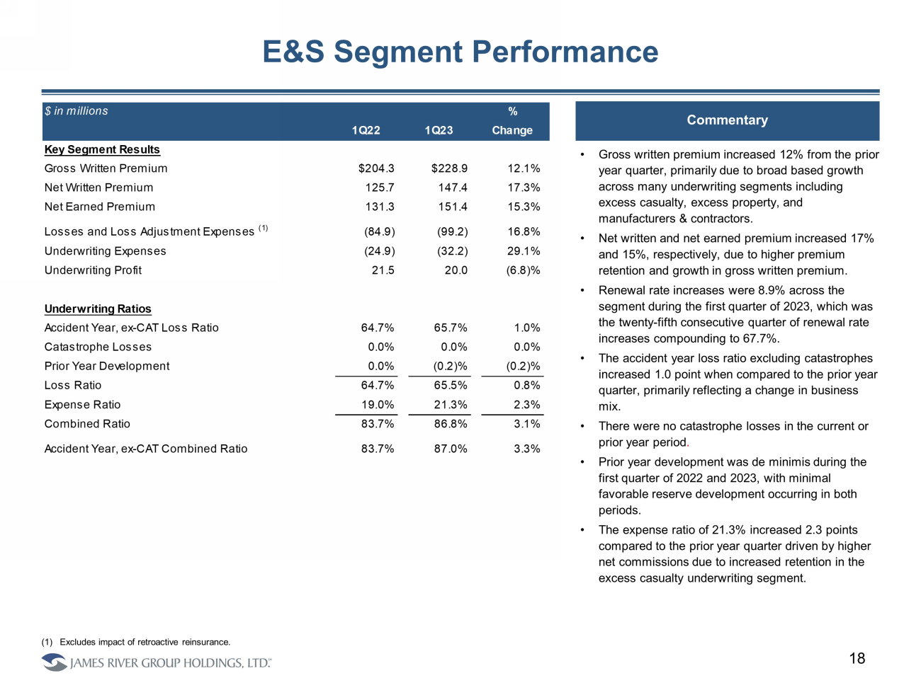 17 Consolidated Performance Commentary • Gross written premium increased 1%, as 12% growth in E&S was offset by a 1% decline in Specialty Admitted a 65% planned decline in Casualty Re. • Net written premium increased 4% and net earned premium increased 10%, primarily driven by higher net retention within the excess casualty unit in the E&S segment and the individual risk workers’ compensation unit in the Specialty Admitted segment. • Net investment income increased 58% due largely to stronger income from fixed maturities, bank loans, and additional proceeds related to the sale of two renewable energy investments during the fourth quarter of 2022. • The accident year loss ratio excluding catastrophes was 65.9% and decreased 2.0 points from the prior year quarter. • Unfavorable prior year development of 0.6 points was primarily due to reserve strengthening in the Casualty Re segment, while the E&S and Specialty Admitted segments experienced modest favorable development. • The expense ratio of 28.4% increased primarily due to changes in reinsurance structures that resulted in reduced ceding commission income. (1) Calculated with a numerator comprising other operating expenses less gross fee income (in specific instances when the Company is not retaining insurance risk) included in “Other income” in our Condensed Consolidated Income Statements of $1.1 million for the three months ended March 31, 2023 ($0.8 million in the respe cti ve prior year period), and a denominator of net earned premiums. (2) % change is adjusted for dividends per common share paid from 2Q 2022 to 1Q 2023 totaling $0.20 per share. $ in millions, except per share figures % 1Q22 1Q23 Change Key Income Statement Items Gross Written Premium $359.9 $363.9 1.1% Net Written Premium 175.9 183.2 4.2% Net Earned Premium 189.8 208.1 9.6% Underwriting Profit 5.0 10.6 112.9% Net Investment Income 16.3 25.8 58.4% Adjusted Net Operating Income 13.9 21.6 55.7% Underwriting Ratios Accident Year, ex - CAT Loss Ratio 67.9% 65.9% (2.0)% Catastrophe Losses 0.0% 0.0% 0.0% Prior Year Development 3.6% 0.7% (2.9)% Loss Ratio 71.4% 66.5% (4.9)% Expense Ratio (1) 26.0% 28.4% 2.4% Combined Ratio 97.4% 94.9% (2.5)% Accident Year, ex - CAT Combined Ratio 93.8% 94.2% 0.4% Key Balance Sheet Items Shareholders’ Equity per Share (2) $17.30 $15.71 (8.0)% Tangible Equity per Share (2) $13.34 $12.84 (2.3)% Tangible Equity per Share, excluding AOCI (2) $14.64 $15.89 9.9% Tangible Common Equity per Share (2) $11.48 $10.91 (3.2)% Tangible Common Equity per Share, excluding AOCI (2) $12.97 $14.42 12.7%