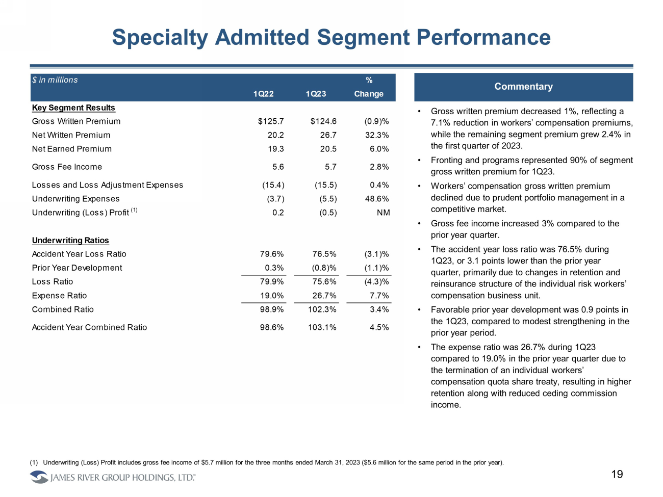 18 E&S Segment Performance Commentary • Gross written premium increased 12% from the prior year quarter, primarily due to broad based growth across many underwriting segments including excess casualty, excess property, and manufacturers & contractors. • Net written and net earned premium increased 17% and 15%, respectively, due to higher premium retention and growth in gross written premium. • Renewal rate increases were 8.9% across the segment during the first quarter of 2023, which was the twenty - fifth consecutive quarter of renewal rate increases compounding to 67.7%. • The accident year loss ratio excluding catastrophes increased 1.0 point when compared to the prior year quarter, primarily reflecting a change in business mix. • There were no catastrophe losses in the current or prior year period . • Prior year development was de minimis during the first quarter of 2022 and 2023, with minimal favorable reserve development occurring in both periods. • The expense ratio of 21.3% increased 2.3 points compared to the prior year quarter driven by higher net commissions due to increased retention in the excess casualty underwriting segment. (1) Excludes impact of retroactive reinsurance. $ in millions % 1Q22 1Q23 Change Key Segment Results Gross Written Premium $204.3 $228.9 12.1% Net Written Premium 125.7 147.4 17.3% Net Earned Premium 131.3 151.4 15.3% Losses and Loss Adjustment Expenses (1) (84.9) (99.2) 16.8% Underwriting Expenses (24.9) (32.2) 29.1% Underwriting Profit 21.5 20.0 (6.8)% Underwriting Ratios Accident Year, ex-CAT Loss Ratio 64.7% 65.7% 1.0% Catastrophe Losses 0.0% 0.0% 0.0% Prior Year Development 0.0% (0.2)% (0.2)% Loss Ratio 64.7% 65.5% 0.8% Expense Ratio 19.0% 21.3% 2.3% Combined Ratio 83.7% 86.8% 3.1% Accident Year, ex-CAT Combined Ratio 83.7% 87.0% 3.3%