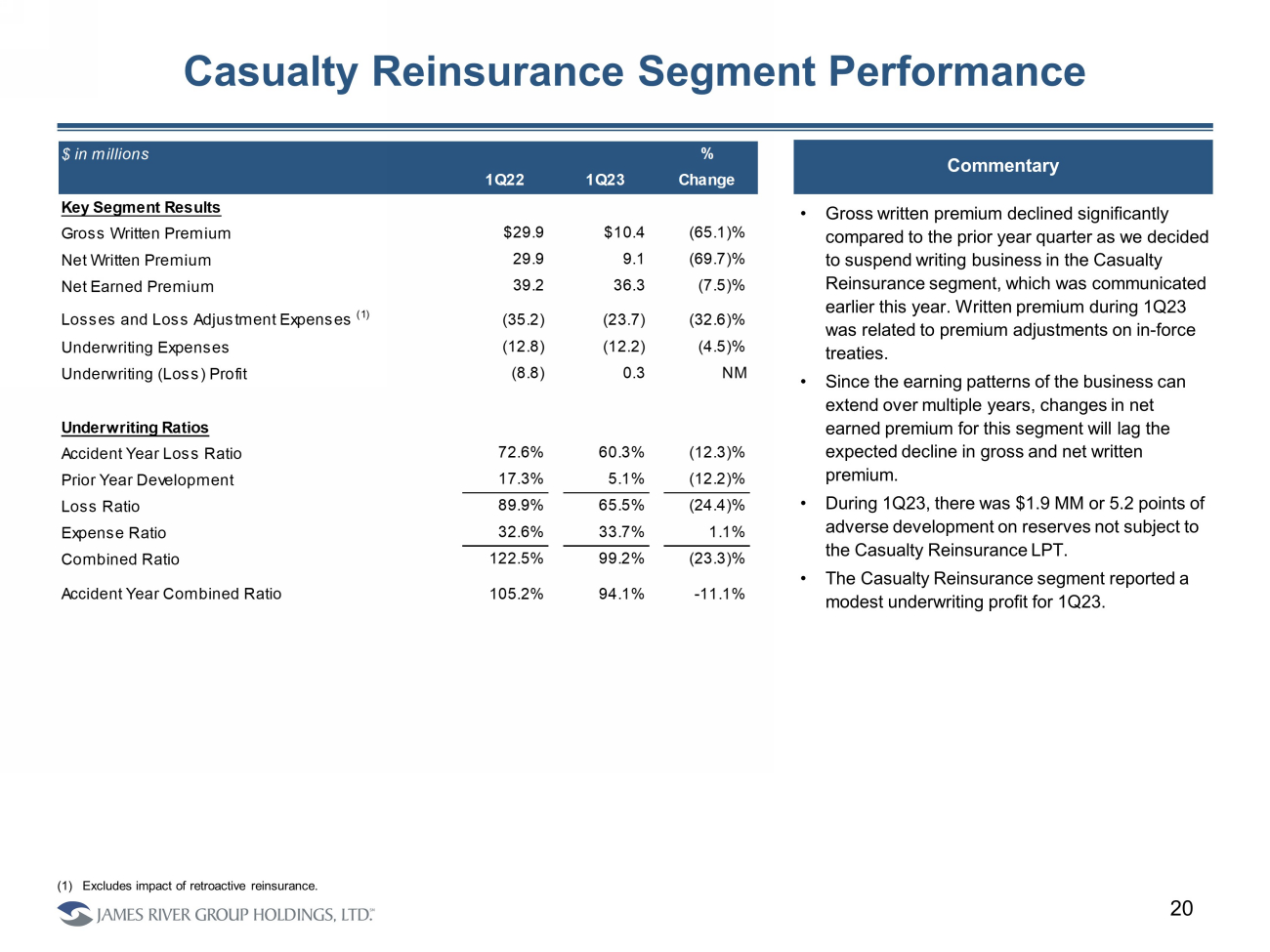 19 Specialty Admitted Segment Performance Commentary • Gross written premium decreased 1%, reflecting a 7.1% reduction in workers’ compensation premiums, while the remaining segment premium grew 2.4% in the first quarter of 2023. • Fronting and programs represented 90% of segment gross written premium for 1Q23. • Workers’ compensation gross written premium declined due to prudent portfolio management in a competitive market. • Gross fee income increased 3% compared to the prior year quarter. • The accident year loss ratio was 76.5% during 1Q23, or 3.1 points lower than the prior year quarter, primarily due to changes in retention and reinsurance structure of the individual risk workers’ compensation business unit. • Favorable prior year development was 0.9 points in the 1Q23, compared to modest strengthening in the prior year period. • The expense ratio was 26.7% during 1Q23 compared to 19.0% in the prior year quarter due to the termination of an individual workers’ compensation quota share treaty, resulting in higher retention along with reduced ceding commission income. (1) Underwriting (Loss) Profit includes gross fee income of $5.7 million for the three months ended March 31, 2023 ($5.6 million for the same period in the prior year). $ in millions % 1Q22 1Q23 Change Key Segment Results Gross Written Premium $125.7 $124.6 (0.9)% Net Written Premium 20.2 26.7 32.3% Net Earned Premium 19.3 20.5 6.0% Gross Fee Income 5.6 5.7 2.8% Losses and Loss Adjustment Expenses (15.4) (15.5) 0.4% Underwriting Expenses (3.7) (5.5) 48.6% Underwriting (Loss) Profit (1) 0.2 (0.5) NM Underwriting Ratios Accident Year Loss Ratio 79.6% 76.5% (3.1)% Prior Year Development 0.3% (0.8)% (1.1)% Loss Ratio 79.9% 75.6% (4.3)% Expense Ratio 19.0% 26.7% 7.7% Combined Ratio 98.9% 102.3% 3.4% Accident Year Combined Ratio 98.6% 103.1% 4.5%
