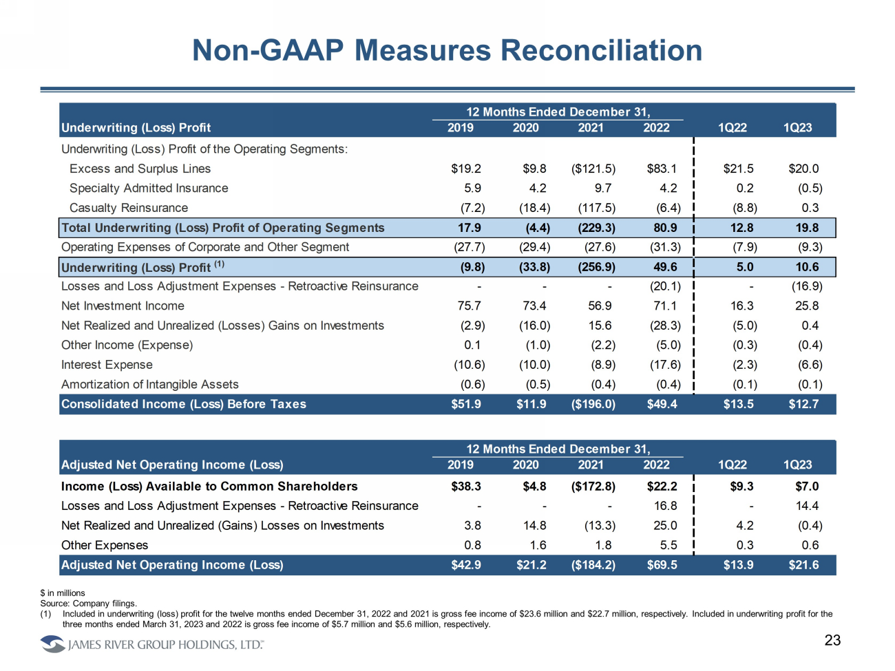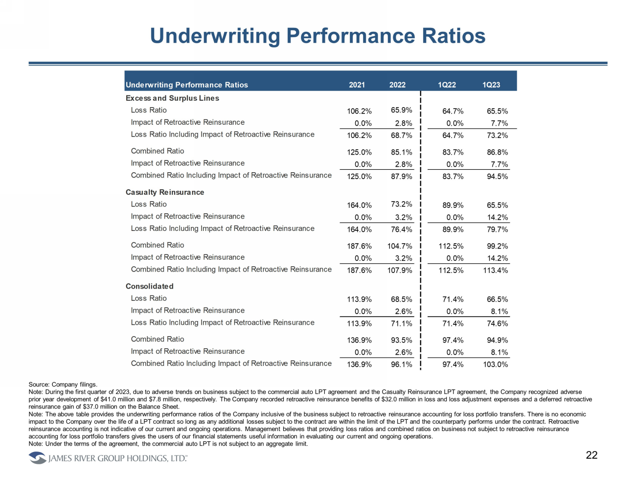 Underwriting Performance Ratios 2021 2022 1Q22 1Q23 Excess and Surplus Lines Loss Ratio 106.2% 65.9% 64.7% 65.5% Impact of Retroactive Reinsurance 0.0% 2.8% 0.0% 7.7% Loss Ratio Including Impact of Retroactive Reinsurance 106.2% 68.7% 64.7% 73.2% Combined Ratio 125.0% 85.1% 83.7% 86.8% Impact of Retroactive Reinsurance 0.0% 2.8% 0.0% 7.7% Combined Ratio Including Impact of Retroactive Reinsurance 125.0% 87.9% 83.7% 94.5% Casualty Reinsurance Loss Ratio 164.0% 73.2% 89.9% 65.5% Impact of Retroactive Reinsurance 0.0% 3.2% 0.0% 14.2% Loss Ratio Including Impact of Retroactive Reinsurance 164.0% 76.4% 89.9% 79.7% Combined Ratio 187.6% 104.7% 112.5% 99.2% Impact of Retroactive Reinsurance 0.0% 3.2% 0.0% 14.2% Combined Ratio Including Impact of Retroactive Reinsurance 187.6% 107.9% 112.5% 113.4% Consolidated Loss Ratio 113.9% 68.5% 71.4% 66.5% Impact of Retroactive Reinsurance 0.0% 2.6% 0.0% 8.1% Loss Ratio Including Impact of Retroactive Reinsurance 113.9% 71.1% 71.4% 74.6% Combined Ratio 136.9% 93.5% 97.4% 94.9% Impact of Retroactive Reinsurance 0.0% 2.6% 0.0% 8.1% Combined Ratio Including Impact of Retroactive Reinsurance 136.9% 96.1% 97.4% 103.0% Underwriting Performance Ratios 22 Source: Company filings. Note: During the first quarter of 2023, due to adverse trends on business subject to the commercial auto LPT agreement and th e C asualty Reinsurance LPT agreement, the Company recognized adverse prior year development of $41.0 million and $7.8 million, respectively. The Company recorded retroactive reinsurance benefits of $32.0 million in loss and loss adjustment expenses and a deferred retroactive reinsurance gain of $37.0 million on the Balance Sheet. Note: The above table provides the underwriting performance ratios of the Company inclusive of the business subject to retroa cti ve reinsurance accounting for loss portfolio transfers. There is no economic impact to the Company over the life of a LPT contract so long as any additional losses subject to the contract are within the li mit of the LPT and the counterparty performs under the contract. Retroactive reinsurance accounting is not indicative of our current and ongoing operations. Management believes that providing loss ratio s a nd combined ratios on business not subject to retroactive reinsurance accounting for loss portfolio transfers gives the users of our financial statements useful information in evaluating our curr ent and ongoing operations. Note: Under the terms of the agreement, the commercial auto LPT is not subject to an aggregate limit.
