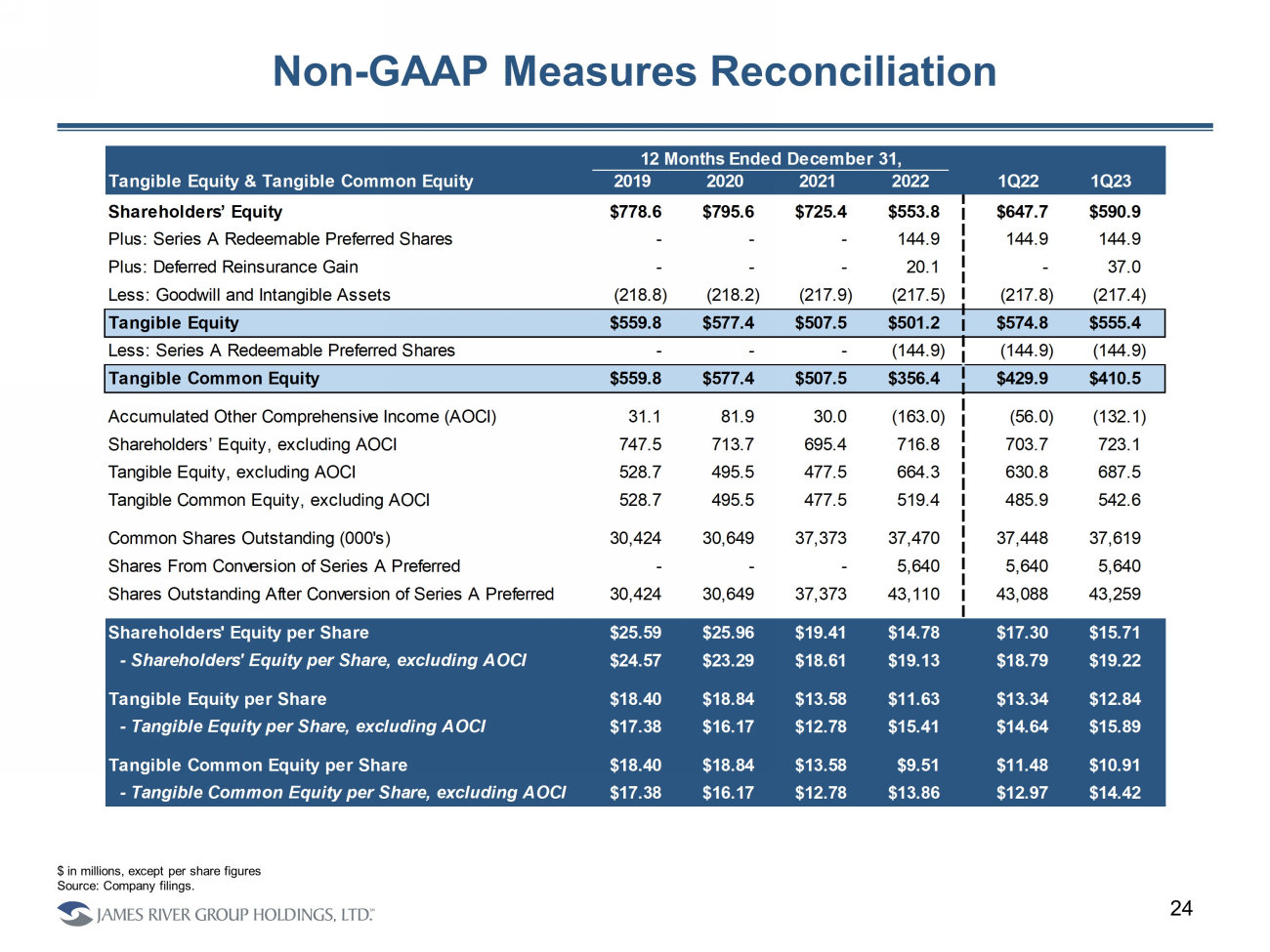 12 Months Ended December 31, Adjusted Net Operating Income (Loss) 2019 2020 2021 2022 1Q22 1Q23 Income (Loss) Available to Common Shareholders $38.3 $4.8 ($172.8) $22.2 $9.3 $7.0 Losses and Loss Adjustment Expenses - Retroactive Reinsurance - - - 16.8 - 14.4 Net Realized and Unrealized (Gains) Losses on Investments 3.8 14.8 (13.3) 25.0 4.2 (0.4) Other Expenses 0.8 1.6 1.8 5.5 0.3 0.6 Adjusted Net Operating Income (Loss) $42.9 $21.2 ($184.2) $69.5 $13.9 $21.6 Non - GAAP Measures Reconciliation 23 $ in millions Source: Company filings. (1) Included in underwriting (loss) profit for the twelve months ended December 31, 2022 and 2021 is gross fee income of $23.6 mi lli on and $22.7 million, respectively. Included in underwriting profit for the three months ended March 31, 2023 and 2022 is gross fee income of $5.7 million and $5.6 million, respectively. 12 Months Ended December 31, Underwriting (Loss) Profit 2019 2020 2021 2022 1Q22 1Q23 Underwriting (Loss) Profit of the Operating Segments: Excess and Surplus Lines $19.2 $9.8 ($121.5) $83.1 $21.5 $20.0 Specialty Admitted Insurance 5.9 4.2 9.7 4.2 0.2 (0.5) Casualty Reinsurance (7.2) (18.4) (117.5) (6.4) (8.8) 0.3 Total Underwriting (Loss) Profit of Operating Segments 17.9 (4.4) (229.3) 80.9 12.8 19.8 Operating Expenses of Corporate and Other Segment (27.7) (29.4) (27.6) (31.3) (7.9) (9.3) Underwriting (Loss) Profit (1) (9.8) (33.8) (256.9) 49.6 5.0 10.6 Losses and Loss Adjustment Expenses - Retroactive Reinsurance - - - (20.1) - (16.9) Net Investment Income 75.7 73.4 56.9 71.1 16.3 25.8 Net Realized and Unrealized (Losses) Gains on Investments (2.9) (16.0) 15.6 (28.3) (5.0) 0.4 Other Income (Expense) 0.1 (1.0) (2.2) (5.0) (0.3) (0.4) Interest Expense (10.6) (10.0) (8.9) (17.6) (2.3) (6.6) Amortization of Intangible Assets (0.6) (0.5) (0.4) (0.4) (0.1) (0.1) Consolidated Income (Loss) Before Taxes $51.9 $11.9 ($196.0) $49.4 $13.5 $12.7