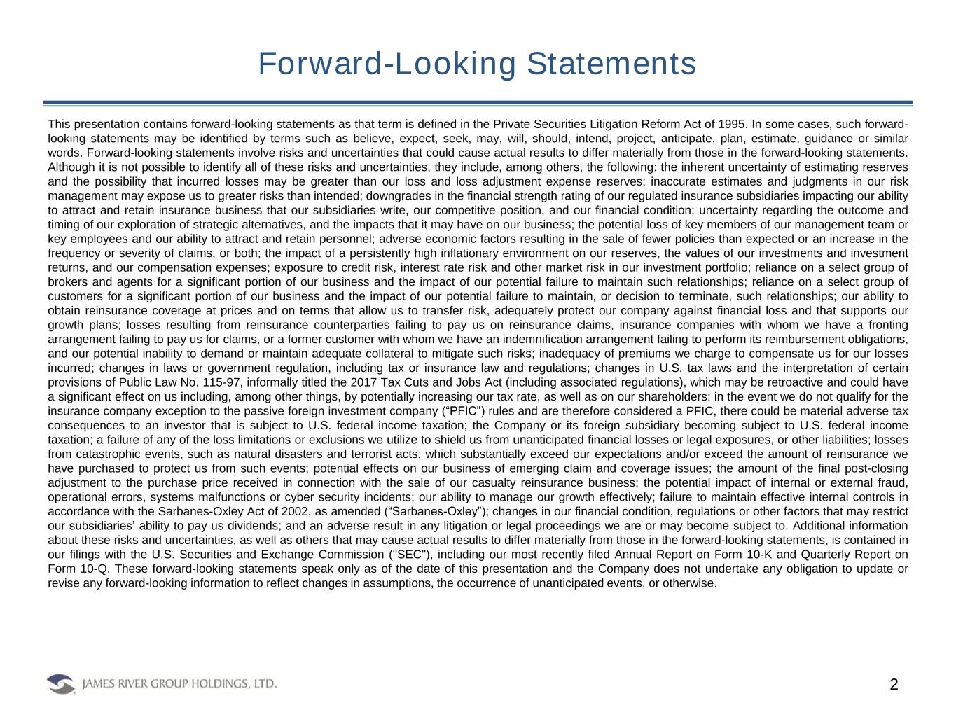 Forward-Looking Statements 2 This presentation contains forward-looking statements as that term is defined in the Private Securities Litigation Reform Act of 1995. In some cases, such forward- looking statements may be identified by terms such as believe, expect, seek, may, will, should, intend, project, anticipate, plan, estimate, guidance or similar words. Forward-looking statements involve risks and uncertainties that could cause actual results to differ materially from those in the forward-looking statements. Although it is not possible to identify all of these risks and uncertainties, they include, among others, the following: the inherent uncertainty of estimating reserves and the possibility that incurred losses may be greater than our loss and loss adjustment expense reserves; inaccurate estimates and judgments in our risk management may expose us to greater risks than intended; downgrades in the financial strength rating of our regulated insurance subsidiaries impacting our ability to attract and retain insurance business that our subsidiaries write, our competitive position, and our financial condition; uncertainty regarding the outcome and timing of our exploration of strategic alternatives, and the impacts that it may have on our business; the potential loss of key members of our management team or key employees and our ability to attract and retain personnel; adverse economic factors resulting in the sale of fewer policies than expected or an increase in the frequency or severity of claims, or both; the impact of a persistently high inflationary environment on our reserves, the values of our investments and investment returns, and our compensation expenses; exposure to credit risk, interest rate risk and other market risk in our investment portfolio; reliance on a select group of brokers and agents for a significant portion of our business and the impact of our potential failure to maintain such relationships; reliance on a select group of customers for a significant portion of our business and the impact of our potential failure to maintain, or decision to terminate, such relationships; our ability to obtain reinsurance coverage at prices and on terms that allow us to transfer risk, adequately protect our company against financial loss and that supports our growth plans; losses resulting from reinsurance counterparties failing to pay us on reinsurance claims, insurance companies with whom we have a fronting arrangement failing to pay us for claims, or a former customer with whom we have an indemnification arrangement failing to perform its reimbursement obligations, and our potential inability to demand or maintain adequate collateral to mitigate such risks; inadequacy of premiums we charge to compensate us for our losses incurred; changes in laws or government regulation, including tax or insurance law and regulations; changes in U.S. tax laws and the interpretation of certain provisions of Public Law No. 115-97, informally titled the 2017 Tax Cuts and Jobs Act (including associated regulations), which may be retroactive and could have a significant effect on us including, among other things, by potentially increasing our tax rate, as well as on our shareholders; in the event we do not qualify for the insurance company exception to the passive foreign investment company (“PFIC”) rules and are therefore considered a PFIC, there could be material adverse tax consequences to an investor that is subject to U.S. federal income taxation; the Company or its foreign subsidiary becoming subject to U.S. federal income taxation; a failure of any of the loss limitations or exclusions we utilize to shield us from unanticipated financial losses or legal exposures, or other liabilities; losses from catastrophic events, such as natural disasters and terrorist acts, which substantially exceed our expectations and/or exceed the amount of reinsurance we have purchased to protect us from such events; potential effects on our business of emerging claim and coverage issues; the amount of the final post-closing adjustment to the purchase price received in connection with the sale of our casualty reinsurance business; the potential impact of internal or external fraud, operational errors, systems malfunctions or cyber security incidents; our ability to manage our growth effectively; failure to maintain effective internal controls in accordance with the Sarbanes-Oxley Act of 2002, as amended (“Sarbanes-Oxley”); changes in our financial condition, regulations or other factors that may restrict our subsidiaries’ ability to pay us dividends; and an adverse result in any litigation or legal proceedings we are or may become subject to. Additional information about these risks and uncertainties, as well as others that may cause actual results to differ materially from those in the forward-looking statements, is contained in our filings with the U.S. Securities and Exchange Commission ("SEC"), including our most recently filed Annual Report on Form 10-K and Quarterly Report on Form 10-Q. These forward-looking statements speak only as of the date of this presentation and the Company does not undertake any obligation to update or revise any forward-looking information to reflect changes in assumptions, the occurrence of unanticipated events, or otherwise.