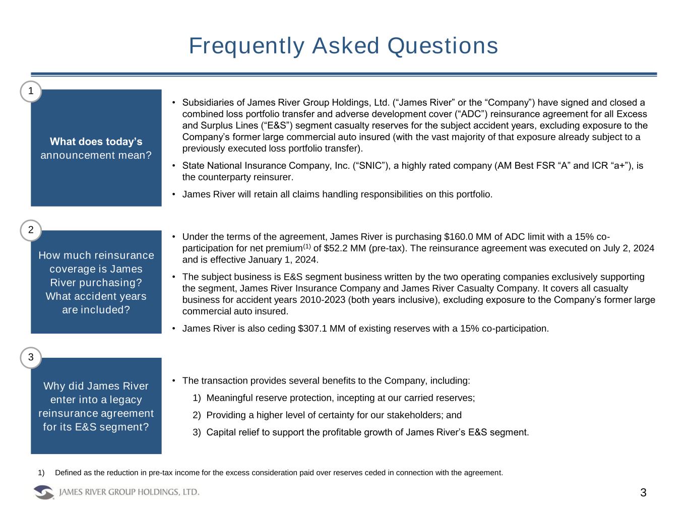 Frequently Asked Questions 3 • Subsidiaries of James River Group Holdings, Ltd. (“James River” or the “Company”) have signed and closed a combined loss portfolio transfer and adverse development cover (“ADC”) reinsurance agreement for all Excess and Surplus Lines (“E&S”) segment casualty reserves for the subject accident years, excluding exposure to the Company’s former large commercial auto insured (with the vast majority of that exposure already subject to a previously executed loss portfolio transfer). • State National Insurance Company, Inc. (“SNIC”), a highly rated company (AM Best FSR “A” and ICR “a+”), is the counterparty reinsurer. • James River will retain all claims handling responsibilities on this portfolio. What does today’s announcement mean? Why did James River enter into a legacy reinsurance agreement for its E&S segment? • The transaction provides several benefits to the Company, including: 1) Meaningful reserve protection, incepting at our carried reserves; 2) Providing a higher level of certainty for our stakeholders; and 3) Capital relief to support the profitable growth of James River’s E&S segment. • Under the terms of the agreement, James River is purchasing $160.0 MM of ADC limit with a 15% co- participation for net premium(1) of $52.2 MM (pre-tax). The reinsurance agreement was executed on July 2, 2024 and is effective January 1, 2024. • The subject business is E&S segment business written by the two operating companies exclusively supporting the segment, James River Insurance Company and James River Casualty Company. It covers all casualty business for accident years 2010-2023 (both years inclusive), excluding exposure to the Company’s former large commercial auto insured. • James River is also ceding $307.1 MM of existing reserves with a 15% co-participation. How much reinsurance coverage is James River purchasing? What accident years are included? 1 2 3 1) Defined as the reduction in pre-tax income for the excess consideration paid over reserves ceded in connection with the agreement.