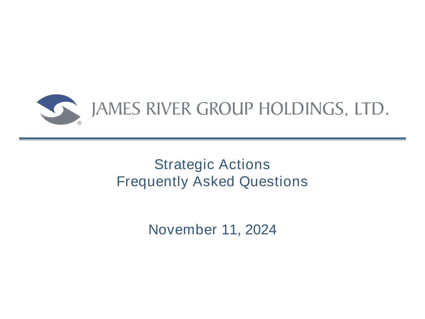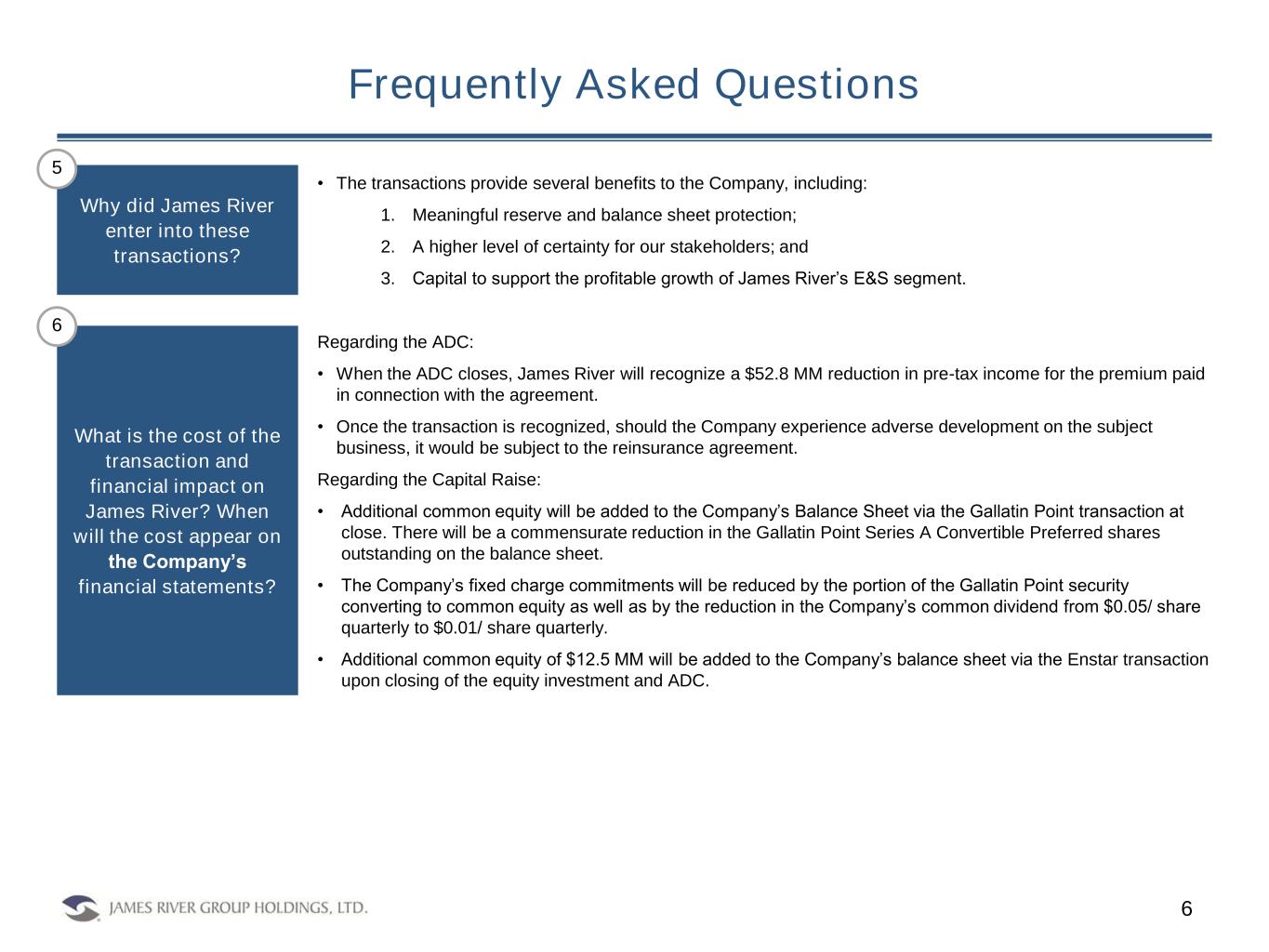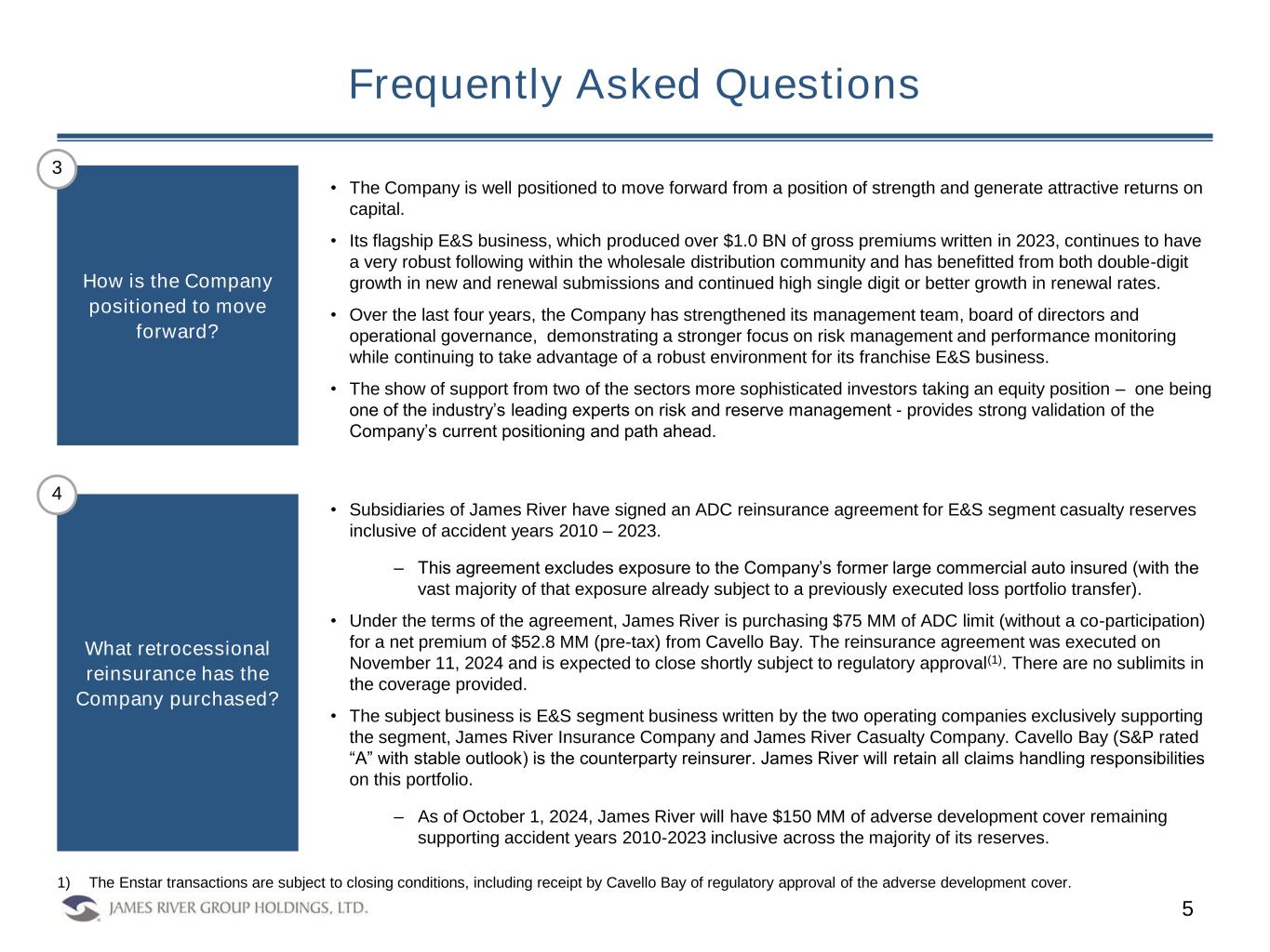 Frequently Asked Questions 4 • James River is commencing a multi-pronged strategic partnership with Enstar Group Limited ("Enstar"), a leader in P&C industry risk and liability management. As a result, Enstar, through its subsidiary, Cavello Bay Reinsurance Limited, (“Cavello Bay”) has: – Agreed to purchase $12.5 million of newly issued common shares at a per share price of $6.40 (subject to certain closing conditions), in addition to 637,640 common shares Enstar already owns through purchases in the open market; – Executed an adverse development cover (“ADC”) agreement with two James River subsidiaries for a limit of $75 million sitting directly above the existing E&S ADC through State National Insurance Company(1). – Enstar will also have an ongoing informal consulting relationship and best practices dialogue with the Company’s claims leadership across a myriad of industry topics. • Additionally, the Company also amended the terms of the Gallatin Point convertible preferred shares, enabling the conversion of $37.5 million liquidation preference of the outstanding Series A Convertible Preferred Shares to common shares at a per share price of $6.40. – Through these actions, alongside the reduction to the Company's quarterly common dividend, the Company will meaningfully reduce its fixed charges given the opportunity it has to put capital to work at attractive returns, in its E&S segment especially. – The quarterly preferred dividend on the remaining $112.5 million liquidation preference will remain at 7% for five years subsequent to September 30, 2024 and be capped at 8% thereafter. In addition, the voluntary and mandatory conversion prices of the remaining $112.5 million of outstanding preferred shares were amended to increase the conversion premiums to 130% and 200% of the new conversion price of $6.40 per share, respectively. – The Company intends to pursue a plan to redomicile to the United States during 2025 and expects to reduce its effective tax rate closer to the US statutory rate thereafter. • With these announcements, in addition to those announced in July 2024 and the completion of the sale of JRG Reinsurance Company Ltd. earlier this year, the Board of Directors has concluded the strategic review process announced in November of 2023. While the strategic review process has been completed, in the ordinary course of business the Company expects to consider beneficial opportunities. What does today’s announcement mean? 2 1) The Enstar transactions are subject to closing conditions, including receipt by Cavello Bay of regulatory approval of the adverse development cover.