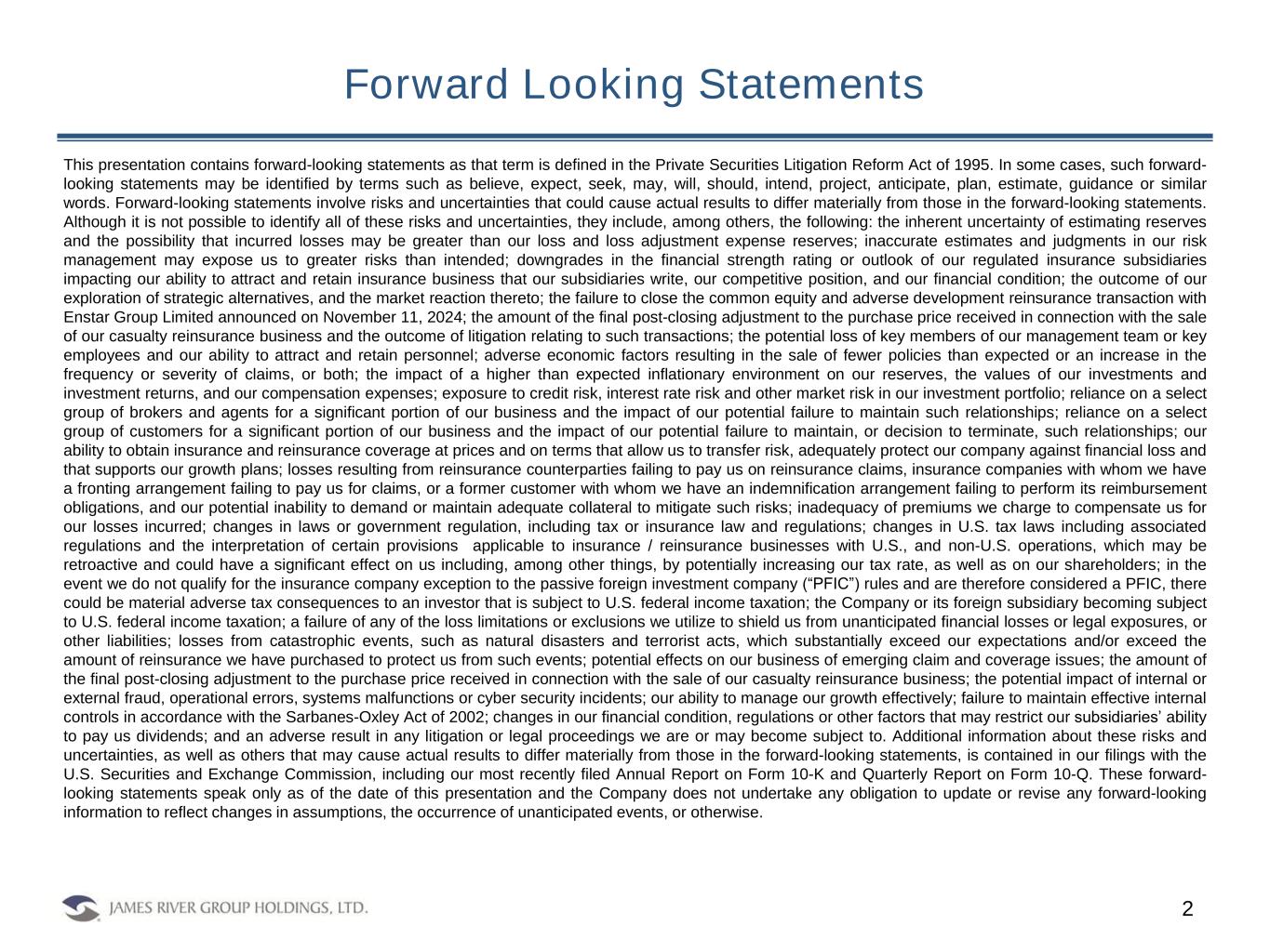 Forward Looking Statements 2 This presentation contains forward-looking statements as that term is defined in the Private Securities Litigation Reform Act of 1995. In some cases, such forward- looking statements may be identified by terms such as believe, expect, seek, may, will, should, intend, project, anticipate, plan, estimate, guidance or similar words. Forward-looking statements involve risks and uncertainties that could cause actual results to differ materially from those in the forward-looking statements. Although it is not possible to identify all of these risks and uncertainties, they include, among others, the following: the inherent uncertainty of estimating reserves and the possibility that incurred losses may be greater than our loss and loss adjustment expense reserves; inaccurate estimates and judgments in our risk management may expose us to greater risks than intended; downgrades in the financial strength rating or outlook of our regulated insurance subsidiaries impacting our ability to attract and retain insurance business that our subsidiaries write, our competitive position, and our financial condition; the outcome of our exploration of strategic alternatives, and the market reaction thereto; the failure to close the common equity and adverse development reinsurance transaction with Enstar Group Limited announced on November 11, 2024; the amount of the final post-closing adjustment to the purchase price received in connection with the sale of our casualty reinsurance business and the outcome of litigation relating to such transactions; the potential loss of key members of our management team or key employees and our ability to attract and retain personnel; adverse economic factors resulting in the sale of fewer policies than expected or an increase in the frequency or severity of claims, or both; the impact of a higher than expected inflationary environment on our reserves, the values of our investments and investment returns, and our compensation expenses; exposure to credit risk, interest rate risk and other market risk in our investment portfolio; reliance on a select group of brokers and agents for a significant portion of our business and the impact of our potential failure to maintain such relationships; reliance on a select group of customers for a significant portion of our business and the impact of our potential failure to maintain, or decision to terminate, such relationships; our ability to obtain insurance and reinsurance coverage at prices and on terms that allow us to transfer risk, adequately protect our company against financial loss and that supports our growth plans; losses resulting from reinsurance counterparties failing to pay us on reinsurance claims, insurance companies with whom we have a fronting arrangement failing to pay us for claims, or a former customer with whom we have an indemnification arrangement failing to perform its reimbursement obligations, and our potential inability to demand or maintain adequate collateral to mitigate such risks; inadequacy of premiums we charge to compensate us for our losses incurred; changes in laws or government regulation, including tax or insurance law and regulations; changes in U.S. tax laws including associated regulations and the interpretation of certain provisions applicable to insurance / reinsurance businesses with U.S., and non-U.S. operations, which may be retroactive and could have a significant effect on us including, among other things, by potentially increasing our tax rate, as well as on our shareholders; in the event we do not qualify for the insurance company exception to the passive foreign investment company (“PFIC”) rules and are therefore considered a PFIC, there could be material adverse tax consequences to an investor that is subject to U.S. federal income taxation; the Company or its foreign subsidiary becoming subject to U.S. federal income taxation; a failure of any of the loss limitations or exclusions we utilize to shield us from unanticipated financial losses or legal exposures, or other liabilities; losses from catastrophic events, such as natural disasters and terrorist acts, which substantially exceed our expectations and/or exceed the amount of reinsurance we have purchased to protect us from such events; potential effects on our business of emerging claim and coverage issues; the amount of the final post-closing adjustment to the purchase price received in connection with the sale of our casualty reinsurance business; the potential impact of internal or external fraud, operational errors, systems malfunctions or cyber security incidents; our ability to manage our growth effectively; failure to maintain effective internal controls in accordance with the Sarbanes-Oxley Act of 2002; changes in our financial condition, regulations or other factors that may restrict our subsidiaries’ ability to pay us dividends; and an adverse result in any litigation or legal proceedings we are or may become subject to. Additional information about these risks and uncertainties, as well as others that may cause actual results to differ materially from those in the forward-looking statements, is contained in our filings with the U.S. Securities and Exchange Commission, including our most recently filed Annual Report on Form 10-K and Quarterly Report on Form 10-Q. These forward- looking statements speak only as of the date of this presentation and the Company does not undertake any obligation to update or revise any forward-looking information to reflect changes in assumptions, the occurrence of unanticipated events, or otherwise.