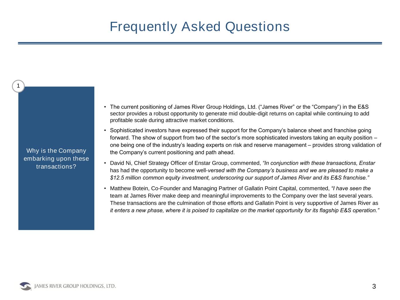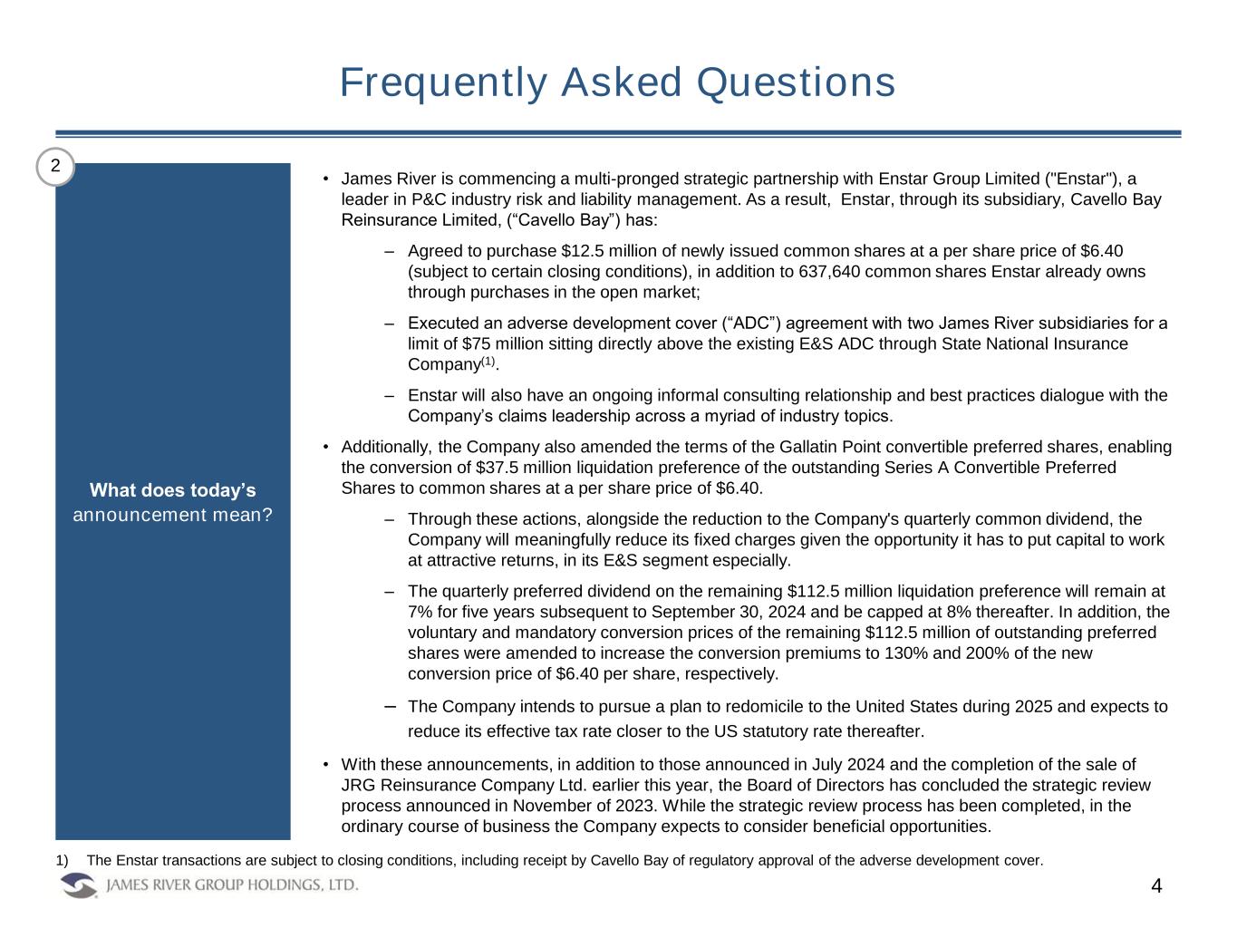 Frequently Asked Questions 3 • The current positioning of James River Group Holdings, Ltd. (“James River” or the “Company”) in the E&S sector provides a robust opportunity to generate mid double-digit returns on capital while continuing to add profitable scale during attractive market conditions. • Sophisticated investors have expressed their support for the Company’s balance sheet and franchise going forward. The show of support from two of the sector’s more sophisticated investors taking an equity position – one being one of the industry’s leading experts on risk and reserve management – provides strong validation of the Company’s current positioning and path ahead. • David Ni, Chief Strategy Officer of Enstar Group, commented, “In conjunction with these transactions, Enstar has had the opportunity to become well-versed with the Company’s business and we are pleased to make a $12.5 million common equity investment, underscoring our support of James River and its E&S franchise.” • Matthew Botein, Co-Founder and Managing Partner of Gallatin Point Capital, commented, “I have seen the team at James River make deep and meaningful improvements to the Company over the last several years. These transactions are the culmination of those efforts and Gallatin Point is very supportive of James River as it enters a new phase, where it is poised to capitalize on the market opportunity for its flagship E&S operation.” Why is the Company embarking upon these transactions? 1