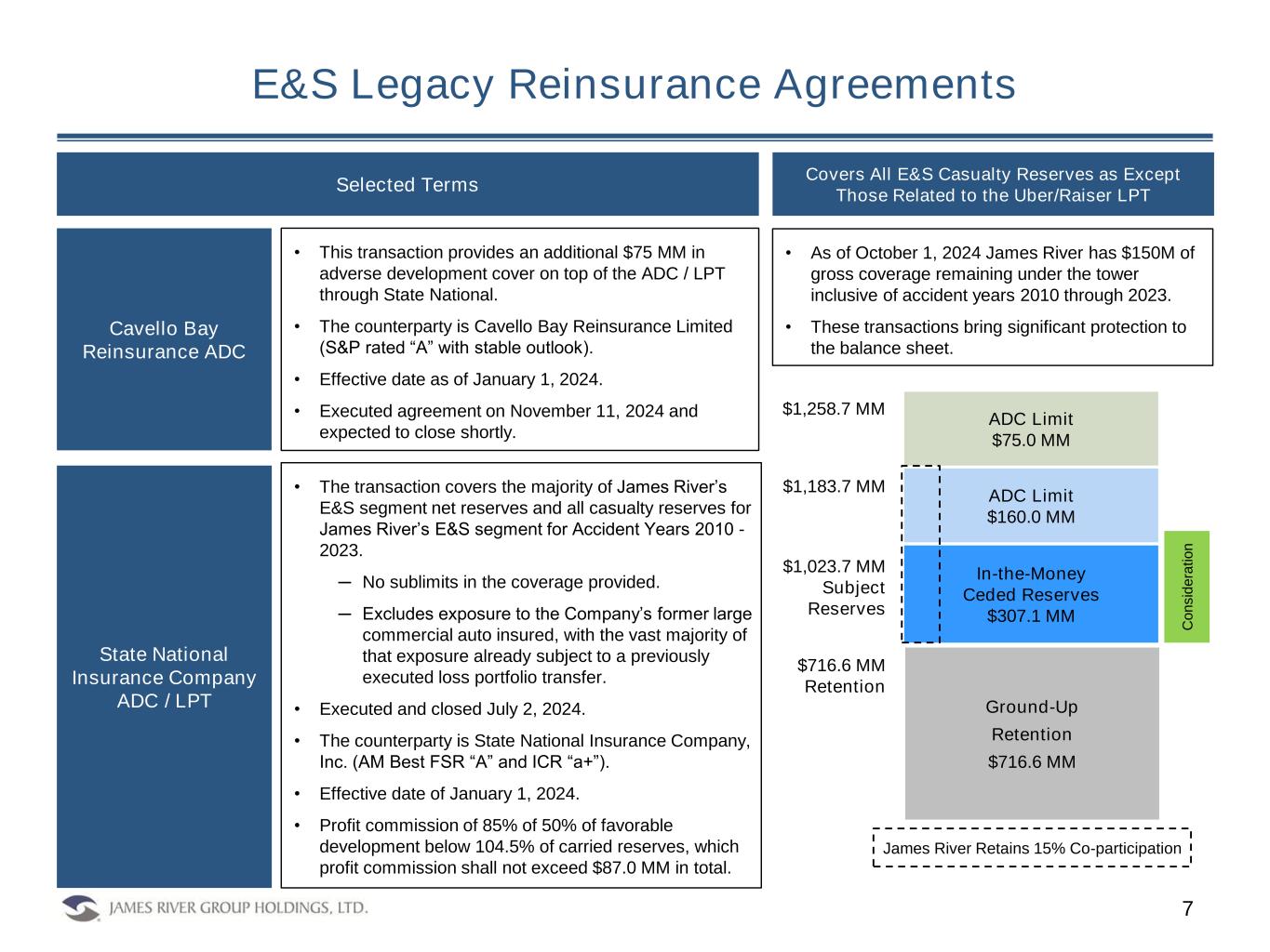 Frequently Asked Questions 6 • The transactions provide several benefits to the Company, including: 1. Meaningful reserve and balance sheet protection; 2. A higher level of certainty for our stakeholders; and 3. Capital to support the profitable growth of James River’s E&S segment. Why did James River enter into these transactions? What is the cost of the transaction and financial impact on James River? When will the cost appear on the Company’s financial statements? Regarding the ADC: • When the ADC closes, James River will recognize a $52.8 MM reduction in pre-tax income for the premium paid in connection with the agreement. • Once the transaction is recognized, should the Company experience adverse development on the subject business, it would be subject to the reinsurance agreement. Regarding the Capital Raise: • Additional common equity will be added to the Company’s Balance Sheet via the Gallatin Point transaction at close. There will be a commensurate reduction in the Gallatin Point Series A Convertible Preferred shares outstanding on the balance sheet. • The Company’s fixed charge commitments will be reduced by the portion of the Gallatin Point security converting to common equity as well as by the reduction in the Company’s common dividend from $0.05/ share quarterly to $0.01/ share quarterly. • Additional common equity of $12.5 MM will be added to the Company’s balance sheet via the Enstar transaction upon closing of the equity investment and ADC. 5 6
