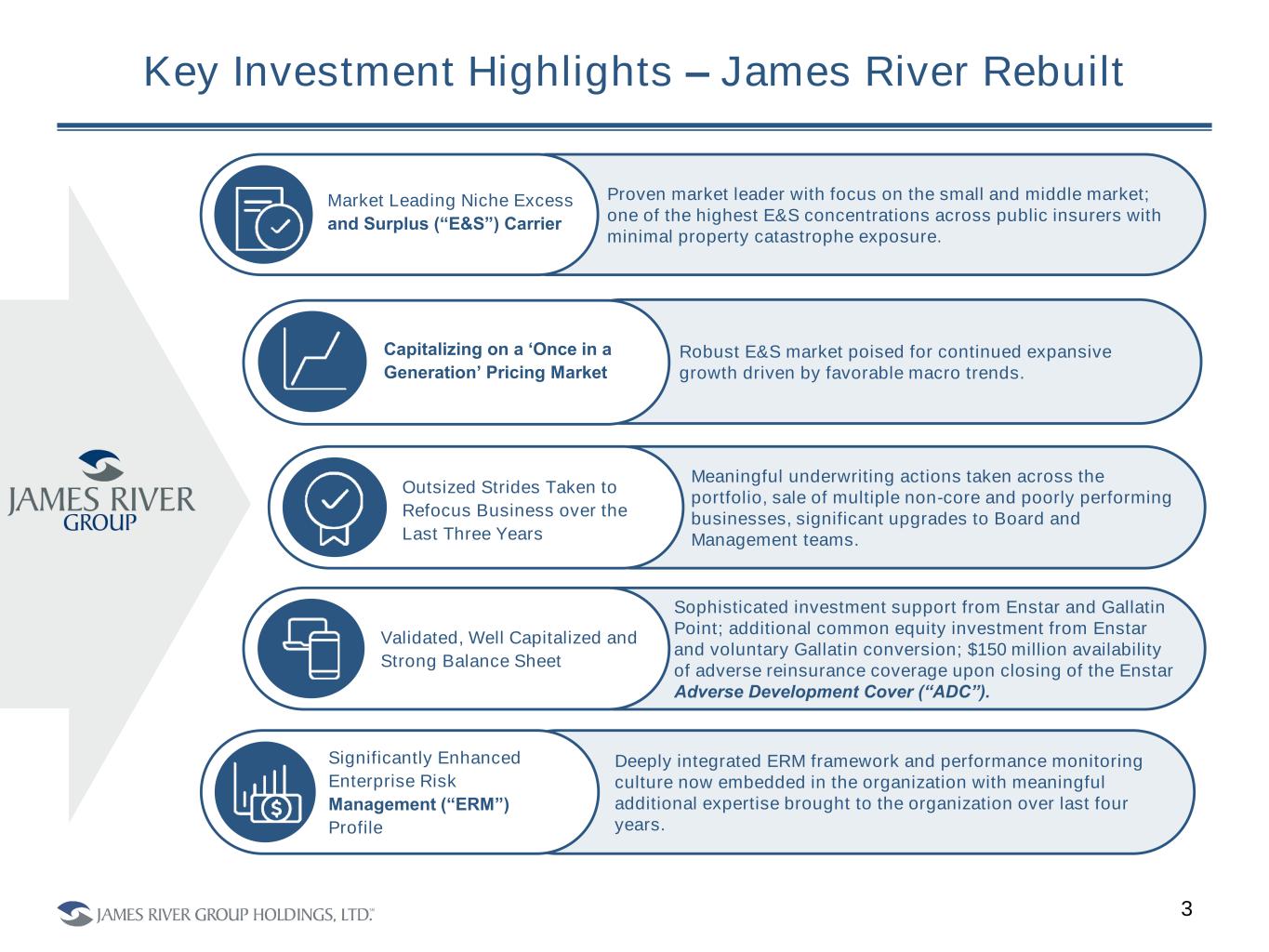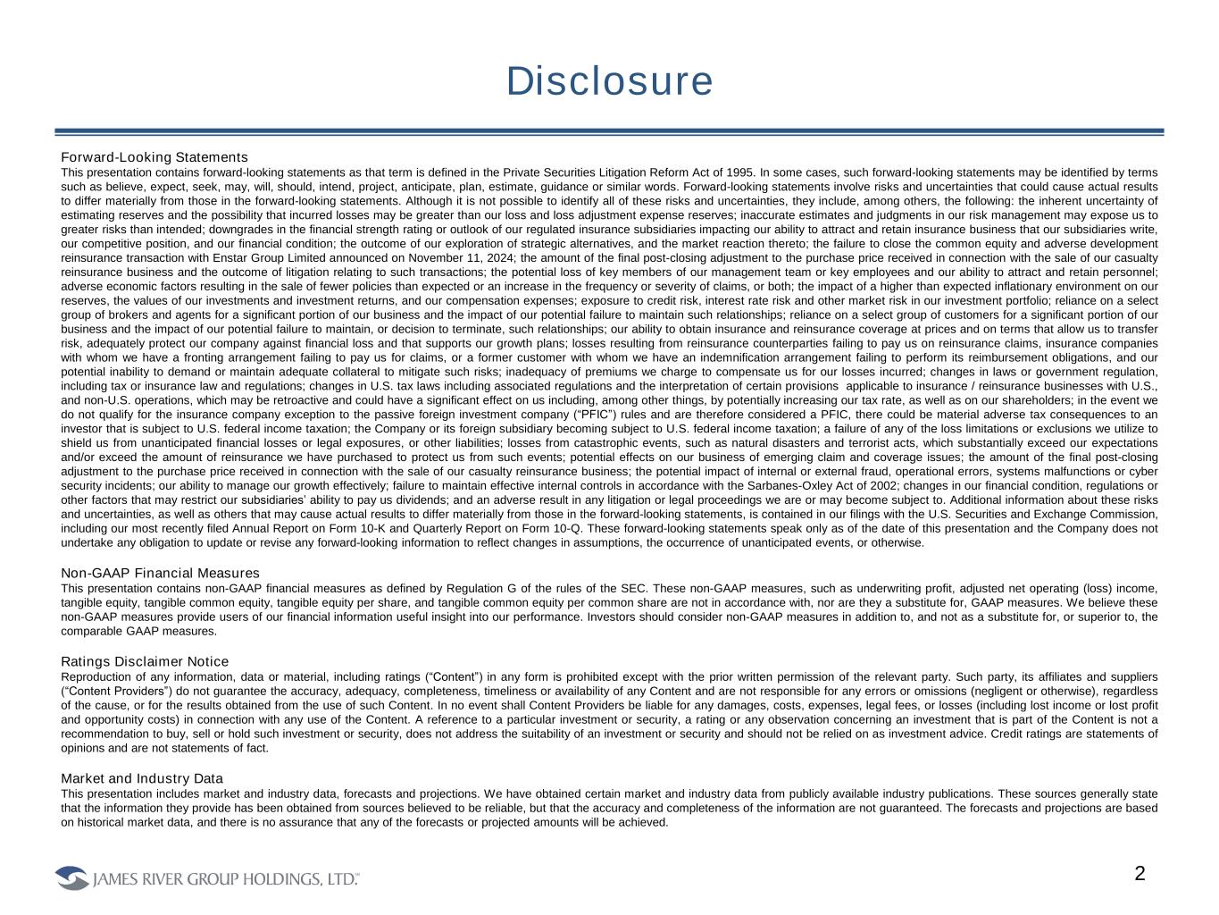 Disclosure 2 Forward-Looking Statements This presentation contains forward-looking statements as that term is defined in the Private Securities Litigation Reform Act of 1995. In some cases, such forward-looking statements may be identified by terms such as believe, expect, seek, may, will, should, intend, project, anticipate, plan, estimate, guidance or similar words. Forward-looking statements involve risks and uncertainties that could cause actual results to differ materially from those in the forward-looking statements. Although it is not possible to identify all of these risks and uncertainties, they include, among others, the following: the inherent uncertainty of estimating reserves and the possibility that incurred losses may be greater than our loss and loss adjustment expense reserves; inaccurate estimates and judgments in our risk management may expose us to greater risks than intended; downgrades in the financial strength rating or outlook of our regulated insurance subsidiaries impacting our ability to attract and retain insurance business that our subsidiaries write, our competitive position, and our financial condition; the outcome of our exploration of strategic alternatives, and the market reaction thereto; the failure to close the common equity and adverse development reinsurance transaction with Enstar Group Limited announced on November 11, 2024; the amount of the final post-closing adjustment to the purchase price received in connection with the sale of our casualty reinsurance business and the outcome of litigation relating to such transactions; the potential loss of key members of our management team or key employees and our ability to attract and retain personnel; adverse economic factors resulting in the sale of fewer policies than expected or an increase in the frequency or severity of claims, or both; the impact of a higher than expected inflationary environment on our reserves, the values of our investments and investment returns, and our compensation expenses; exposure to credit risk, interest rate risk and other market risk in our investment portfolio; reliance on a select group of brokers and agents for a significant portion of our business and the impact of our potential failure to maintain such relationships; reliance on a select group of customers for a significant portion of our business and the impact of our potential failure to maintain, or decision to terminate, such relationships; our ability to obtain insurance and reinsurance coverage at prices and on terms that allow us to transfer risk, adequately protect our company against financial loss and that supports our growth plans; losses resulting from reinsurance counterparties failing to pay us on reinsurance claims, insurance companies with whom we have a fronting arrangement failing to pay us for claims, or a former customer with whom we have an indemnification arrangement failing to perform its reimbursement obligations, and our potential inability to demand or maintain adequate collateral to mitigate such risks; inadequacy of premiums we charge to compensate us for our losses incurred; changes in laws or government regulation, including tax or insurance law and regulations; changes in U.S. tax laws including associated regulations and the interpretation of certain provisions applicable to insurance / reinsurance businesses with U.S., and non-U.S. operations, which may be retroactive and could have a significant effect on us including, among other things, by potentially increasing our tax rate, as well as on our shareholders; in the event we do not qualify for the insurance company exception to the passive foreign investment company (“PFIC”) rules and are therefore considered a PFIC, there could be material adverse tax consequences to an investor that is subject to U.S. federal income taxation; the Company or its foreign subsidiary becoming subject to U.S. federal income taxation; a failure of any of the loss limitations or exclusions we utilize to shield us from unanticipated financial losses or legal exposures, or other liabilities; losses from catastrophic events, such as natural disasters and terrorist acts, which substantially exceed our expectations and/or exceed the amount of reinsurance we have purchased to protect us from such events; potential effects on our business of emerging claim and coverage issues; the amount of the final post-closing adjustment to the purchase price received in connection with the sale of our casualty reinsurance business; the potential impact of internal or external fraud, operational errors, systems malfunctions or cyber security incidents; our ability to manage our growth effectively; failure to maintain effective internal controls in accordance with the Sarbanes-Oxley Act of 2002; changes in our financial condition, regulations or other factors that may restrict our subsidiaries’ ability to pay us dividends; and an adverse result in any litigation or legal proceedings we are or may become subject to. Additional information about these risks and uncertainties, as well as others that may cause actual results to differ materially from those in the forward-looking statements, is contained in our filings with the U.S. Securities and Exchange Commission, including our most recently filed Annual Report on Form 10-K and Quarterly Report on Form 10-Q. These forward-looking statements speak only as of the date of this presentation and the Company does not undertake any obligation to update or revise any forward-looking information to reflect changes in assumptions, the occurrence of unanticipated events, or otherwise. Non-GAAP Financial Measures This presentation contains non-GAAP financial measures as defined by Regulation G of the rules of the SEC. These non-GAAP measures, such as underwriting profit, adjusted net operating (loss) income, tangible equity, tangible common equity, tangible equity per share, and tangible common equity per common share are not in a