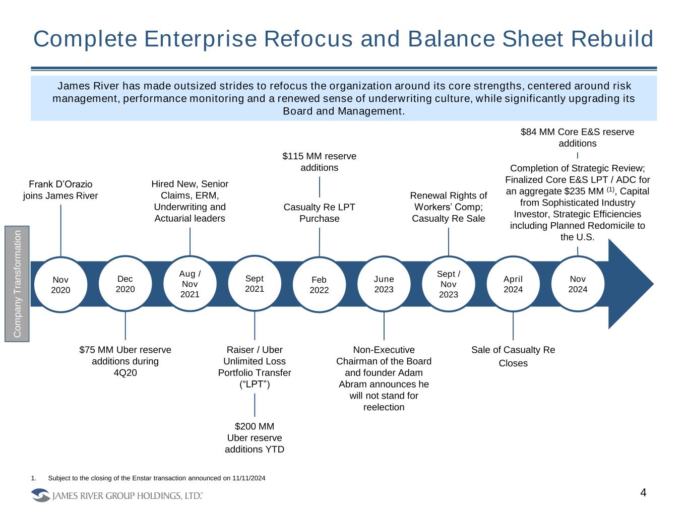 Key Investment Highlights – James River Rebuilt 3 Deeply integrated ERM framework and performance monitoring culture now embedded in the organization with meaningful additional expertise brought to the organization over last four years. Large and Expanding Addressable Market Significantly Enhanced Enterprise Risk Management (“ERM”) Profile Sophisticated investment support from Enstar and Gallatin Point; additional common equity investment from Enstar and voluntary Gallatin conversion; $150 million availability of adverse reinsurance coverage upon closing of the Enstar Adverse Development Cover (“ADC”). Large and Expanding Addressable Market Validated, Well Capitalized and Strong Balance Sheet Proven market leader with focus on the small and middle market; one of the highest E&S concentrations across public insurers with minimal property catastrophe exposure. Large and Expanding Addressable Market Market Leading Niche Excess and Surplus (“E&S”) Carrier Robust E&S market poised for continued expansive growth driven by favorable macro trends. Large and Expanding Addressable Market Capitalizing on a ‘Once in a Generation’ Pricing Market Meaningful underwriting actions taken across the portfolio, sale of multiple non-core and poorly performing businesses, significant upgrades to Board and Management teams. Large and Expanding Addressable Market Outsized Strides Taken to Refocus Business over the Last Three Years