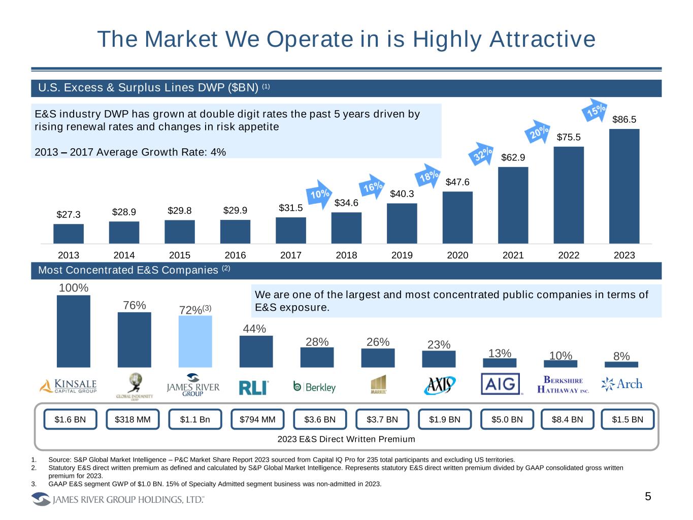 Complete Enterprise Refocus and Balance Sheet Rebuild James River has made outsized strides to refocus the organization around its core strengths, centered around risk management, performance monitoring and a renewed sense of underwriting culture, while significantly upgrading its Board and Management. Frank D’Orazio joins James River Raiser / Uber Unlimited Loss Portfolio Transfer (“LPT”) Renewal Rights of Workers’ Comp; Casualty Re Sale Hired New, Senior Claims, ERM, Underwriting and Actuarial leaders Nov 2020 Sept 2021 Aug / Nov 2021 April 2024 Nov 2024 Completion of Strategic Review; Finalized Core E&S LPT / ADC for an aggregate $235 MM (1), Capital from Sophisticated Industry Investor, Strategic Efficiencies including Planned Redomicile to the U.S. Sept / Nov 2023 Sale of Casualty Re Closes C o m p a n y T ra n s fo rm a ti o n $200 MM Uber reserve additions YTD Casualty Re LPT Purchase Feb 2022 $115 MM reserve additions $84 MM Core E&S reserve additions Non-Executive Chairman of the Board and founder Adam Abram announces he will not stand for reelection June 2023 4 1. Subject to the closing of the Enstar transaction announced on 11/11/2024 Dec 2020 $75 MM Uber reserve additions during 4Q20