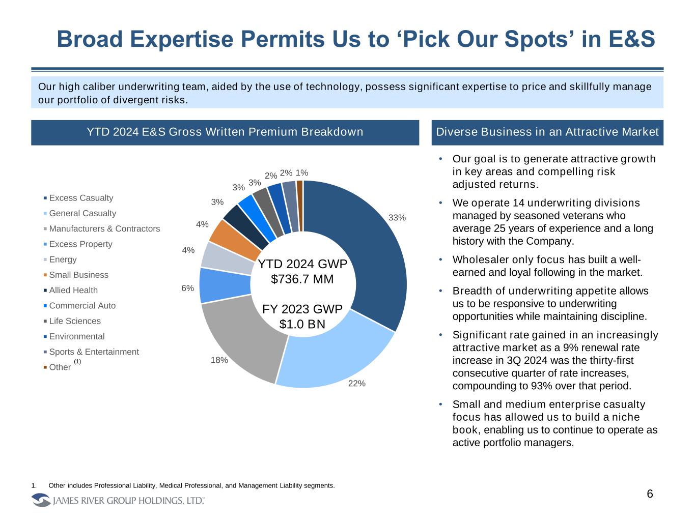 2023 E&S Direct Written Premium 100% 76% 72%(3) 44% 28% 26% 23% 13% 10% 8% $27.3 $28.9 $29.8 $29.9 $31.5 $34.6 $40.3 $47.6 $62.9 $75.5 $86.5 2013 2014 2015 2016 2017 2018 2019 2020 2021 2022 2023 5 The Market We Operate in is Highly Attractive U.S. Excess & Surplus Lines DWP ($BN) (1) 1. Source: S&P Global Market Intelligence – P&C Market Share Report 2023 sourced from Capital IQ Pro for 235 total participants and excluding US territories. 2. Statutory E&S direct written premium as defined and calculated by S&P Global Market Intelligence. Represents statutory E&S direct written premium divided by GAAP consolidated gross written premium for 2023. 3. GAAP E&S segment GWP of $1.0 BN. 15% of Specialty Admitted segment business was non-admitted in 2023. Most Concentrated E&S Companies (2) We are one of the largest and most concentrated public companies in terms of E&S exposure. E&S industry DWP has grown at double digit rates the past 5 years driven by rising renewal rates and changes in risk appetite 2013 – 2017 Average Growth Rate: 4% $1.6 BN $318 MM $1.1 Bn $794 MM $3.6 BN $3.7 BN $1.9 BN $5.0 BN $8.4 BN $1.5 BN