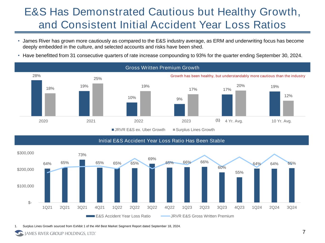 Broad Expertise Permits Us to ‘Pick Our Spots’ in E&S 6 • Our goal is to generate attractive growth in key areas and compelling risk adjusted returns. • We operate 14 underwriting divisions managed by seasoned veterans who average 25 years of experience and a long history with the Company. • Wholesaler only focus has built a well- earned and loyal following in the market. • Breadth of underwriting appetite allows us to be responsive to underwriting opportunities while maintaining discipline. • Significant rate gained in an increasingly attractive market as a 9% renewal rate increase in 3Q 2024 was the thirty-first consecutive quarter of rate increases, compounding to 93% over that period. • Small and medium enterprise casualty focus has allowed us to build a niche book, enabling us to continue to operate as active portfolio managers. Our high caliber underwriting team, aided by the use of technology, possess significant expertise to price and skillfully manage our portfolio of divergent risks. 33% 22% 18% 6% 4% 4% 3% 3% 3% 2% 2% 1% Excess Casualty General Casualty Manufacturers & Contractors Excess Property Energy Small Business Allied Health Commercial Auto Life Sciences Environmental Sports & Entertainment Other YTD 2024 E&S Gross Written Premium Breakdown YTD 2024 GWP $736.7 MM FY 2023 GWP $1.0 BN (1) 1. Other includes Professional Liability, Medical Professional, and Management Liability segments. Diverse Business in an Attractive Market