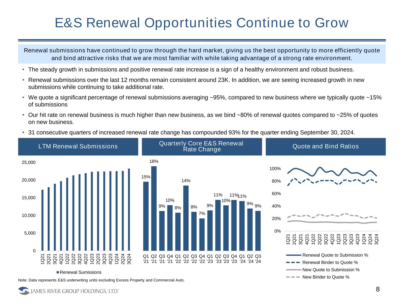 7 E&S Has Demonstrated Cautious but Healthy Growth, and Consistent Initial Accident Year Loss Ratios Gross Written Premium Growth Initial E&S Accident Year Loss Ratio Has Been Stable • James River has grown more cautiously as compared to the E&S industry average, as ERM and underwriting focus has become deeply embedded in the culture, and selected accounts and risks have been shed. • Have benefitted from 31 consecutive quarters of rate increase compounding to 93% for the quarter ending September 30, 2024. 1. Surplus Lines Growth sourced from Exhibit 1 of the AM Best Market Segment Report dated September 18, 2024. Growth has been healthy, but understandably more cautious than the industry (1) 28% 19% 10% 9% 17% 19%18% 25% 19% 17% 20% 12% 2020 2021 2022 2023 4 Yr. Avg. 10 Yr. Avg. JRVR E&S ex. Uber Growth Surplus Lines Growth 64% 65% 73% 65% 65% 65% 69% 65% 66% 66% 60% 55% 64% 64% 65% $- $100,000 $200,000 $300,000 1Q21 2Q21 3Q21 4Q21 1Q22 2Q22 3Q22 4Q22 1Q23 2Q23 3Q23 4Q23 1Q24 2Q24 3Q24 E&S Accident Year Loss Ratio JRVR E&S Gross Written Premium
