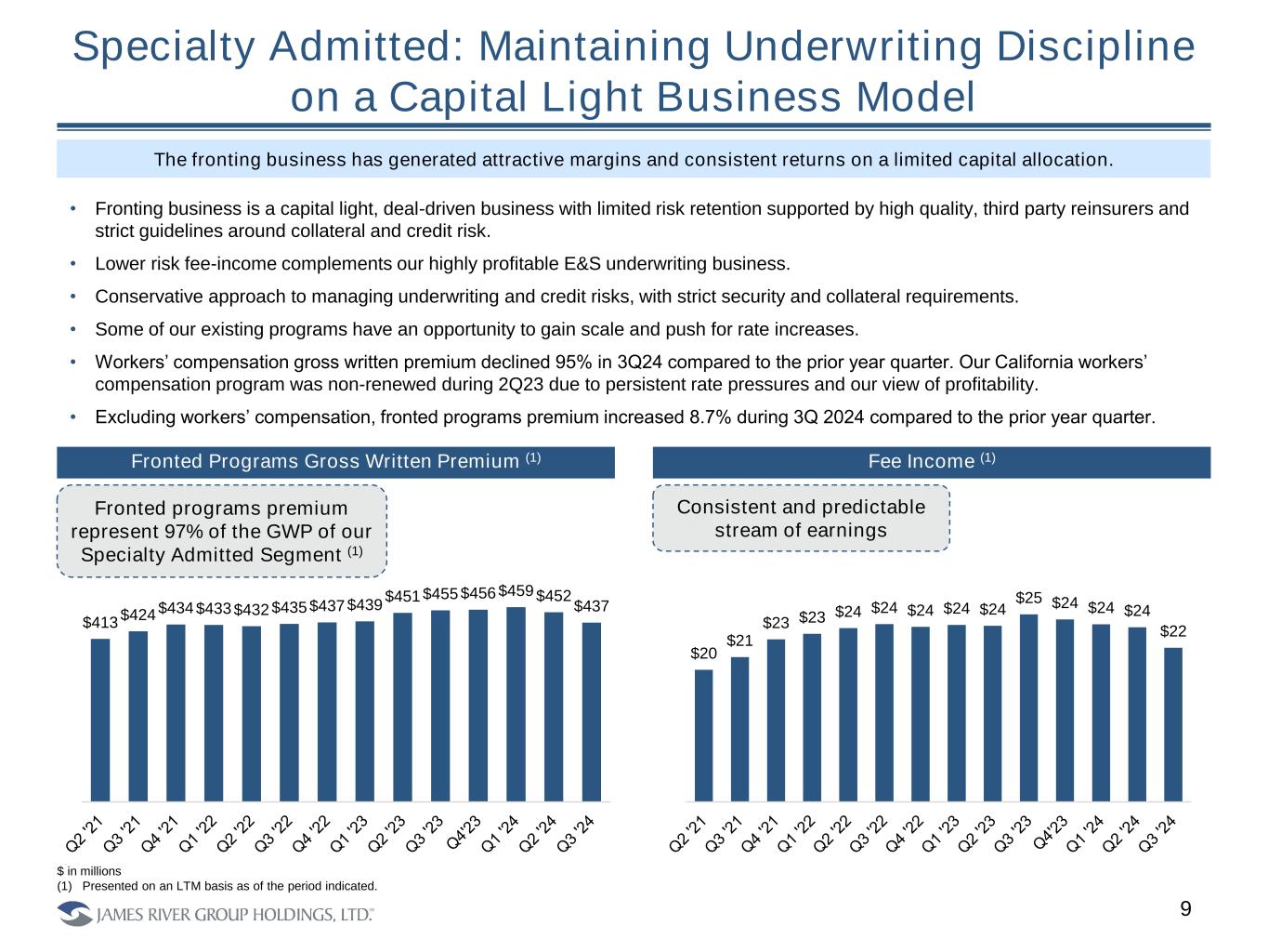E&S Renewal Opportunities Continue to Grow 8 Renewal submissions have continued to grow through the hard market, giving us the best opportunity to more efficiently quote and bind attractive risks that we are most familiar with while taking advantage of a strong rate environment. • The steady growth in submissions and positive renewal rate increase is a sign of a healthy environment and robust business. • Renewal submissions over the last 12 months remain consistent around 23K. In addition, we are seeing increased growth in new submissions while continuing to take additional rate. • We quote a significant percentage of renewal submissions averaging ~95%, compared to new business where we typically quote ~15% of submissions • Our hit rate on renewal business is much higher than new business, as we bind ~80% of renewal quotes compared to ~25% of quotes on new business. • 31 consecutive quarters of increased renewal rate change has compounded 93% for the quarter ending September 30, 2024. LTM Renewal Submissions Quote and Bind Ratios Note: Data represents E&S underwriting units excluding Excess Property and Commercial Auto. 0% 20% 40% 60% 80% 100% 1 Q 2 1 2 Q 2 1 3 Q 2 1 4 Q 2 1 1 Q 2 2 2 Q 2 2 3 Q 2 2 4 Q 2 2 1 Q 2 3 2 Q 2 3 3 Q 2 3 4 Q 2 3 1 Q 2 4 2 Q 2 4 3 Q 2 4 Renewal Quote to Submission % Renewal Binder to Quote % New Quote to Submission % New Binder to Quote % 0 5,000 10,000 15,000 20,000 25,000 1 Q 2 1 2 Q 2 1 3 Q 2 1 4 Q 2 1 1 Q 2 2 2 Q 2 2 3 Q 2 2 4 Q 2 2 1 Q 2 3 2 Q 2 3 3 Q 2 3 4 Q 2 3 1 Q 2 4 2 Q 2 4 3 Q 2 4 Renewal Sumissions Quarterly Core E&S Renewal Rate Change 15% 18% 9% 10% 8% 14% 8% 7% 9% 11% 10% 11%11% 9% 9% Q1 '21 Q2 '21 Q3 '21 Q4 '21 Q1 '22 Q2 '22 Q3 '22 Q4 '22 Q1 '23 Q2 '23 Q3 '23 Q4 '23 Q1 '24 Q2 '24 Q3 '24