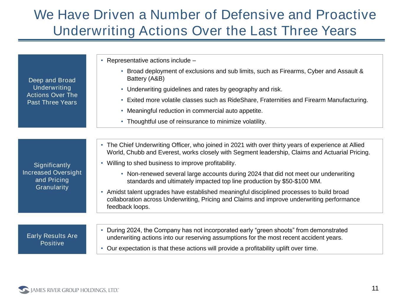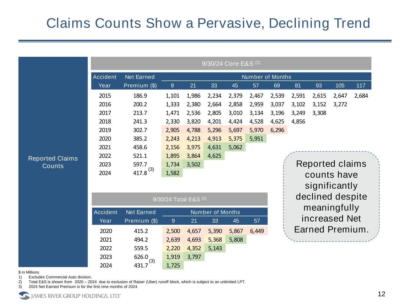 11 We Have Driven a Number of Defensive and Proactive Underwriting Actions Over the Last Three Years • Representative actions include – • Broad deployment of exclusions and sub limits, such as Firearms, Cyber and Assault & Battery (A&B) • Underwriting guidelines and rates by geography and risk. • Exited more volatile classes such as RideShare, Fraternities and Firearm Manufacturing. • Meaningful reduction in commercial auto appetite. • Thoughtful use of reinsurance to minimize volatility. Deep and Broad Underwriting Actions Over The Past Three Years Significantly Increased Oversight and Pricing Granularity • The Chief Underwriting Officer, who joined in 2021 with over thirty years of experience at Allied World, Chubb and Everest, works closely with Segment leadership, Claims and Actuarial Pricing. • Willing to shed business to improve profitability. • Non-renewed several large accounts during 2024 that did not meet our underwriting standards and ultimately impacted top line production by $50-$100 MM. • Amidst talent upgrades have established meaningful disciplined processes to build broad collaboration across Underwriting, Pricing and Claims and improve underwriting performance feedback loops. Early Results Are Positive • During 2024, the Company has not incorporated early “green shoots” from demonstrated underwriting actions into our reserving assumptions for the most recent accident years. • Our expectation is that these actions will provide a profitability uplift over time.