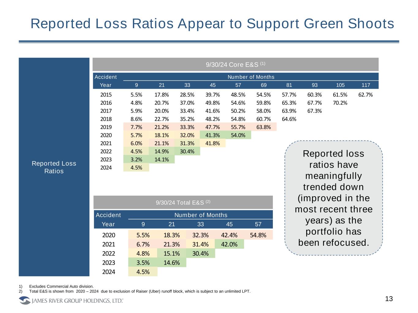 12 9/30/24 Total E&S (2) 9/30/24 Core E&S (1) Reported Claims Counts $ in Millions 1) Excludes Commercial Auto division. 2) Total E&S is shown from 2020 – 2024 due to exclusion of Raiser (Uber) runoff block, which is subject to an unlimited LPT. 3) 2024 Net Earned Premium is for the first nine months of 2024. Accident Net Earned Number of Months Year Premium ($) 9 21 33 45 57 69 81 93 105 117 2015 186.9 1,101 1,986 2,234 2,379 2,467 2,539 2,591 2,615 2,647 2,684 2016 200.2 1,333 2,380 2,664 2,858 2,959 3,037 3,102 3,152 3,272 2017 213.7 1,471 2,536 2,805 3,010 3,134 3,196 3,249 3,308 2018 241.3 2,330 3,820 4,201 4,424 4,528 4,625 4,856 2019 302.7 2,905 4,788 5,296 5,697 5,970 6,296 2020 385.2 2,243 4,213 4,913 5,375 5,951 2021 458.6 2,156 3,975 4,631 5,062 2022 521.1 1,895 3,864 4,625 2023 597.7 1,734 3,502 2024 417.8 1,582 Accident Net Earned Number of Months Year Premium ($) 9 21 33 45 57 2020 415.2 2,500 4,657 5,390 5,867 6,449 2021 494.2 2,639 4,693 5,368 5,808 2022 559.5 2,220 4,352 5,143 2023 626.0 1,919 3,797 2024 431.7 1,725 (3) (3) Claims Counts Show a Pervasive, Declining Trend Reported claims counts have significantly declined despite meaningfully increased Net Earned Premium.