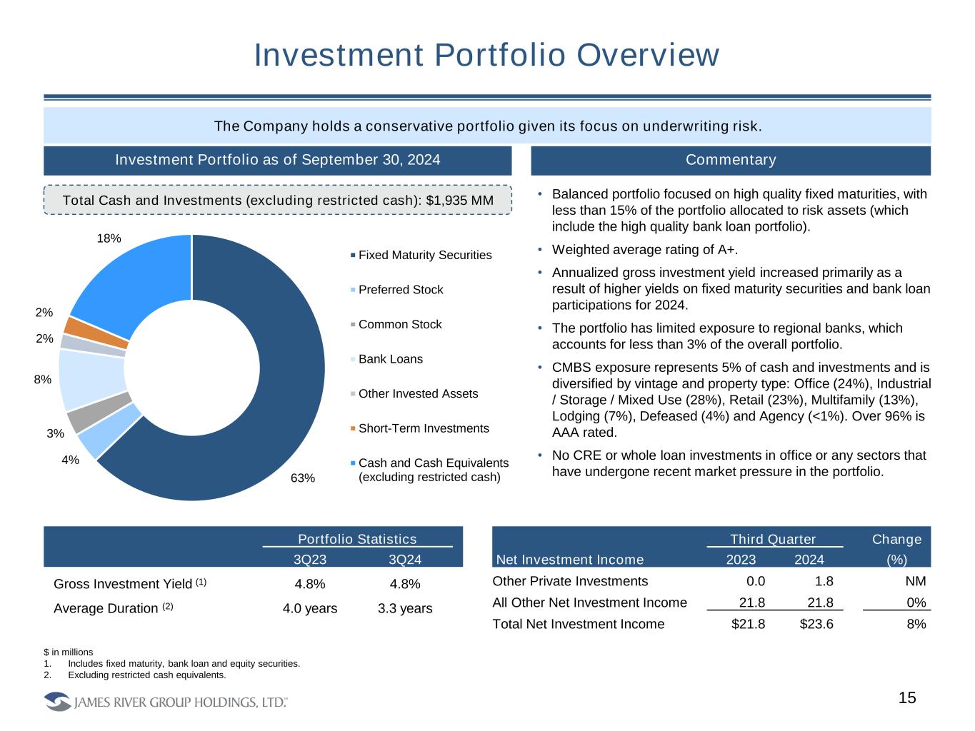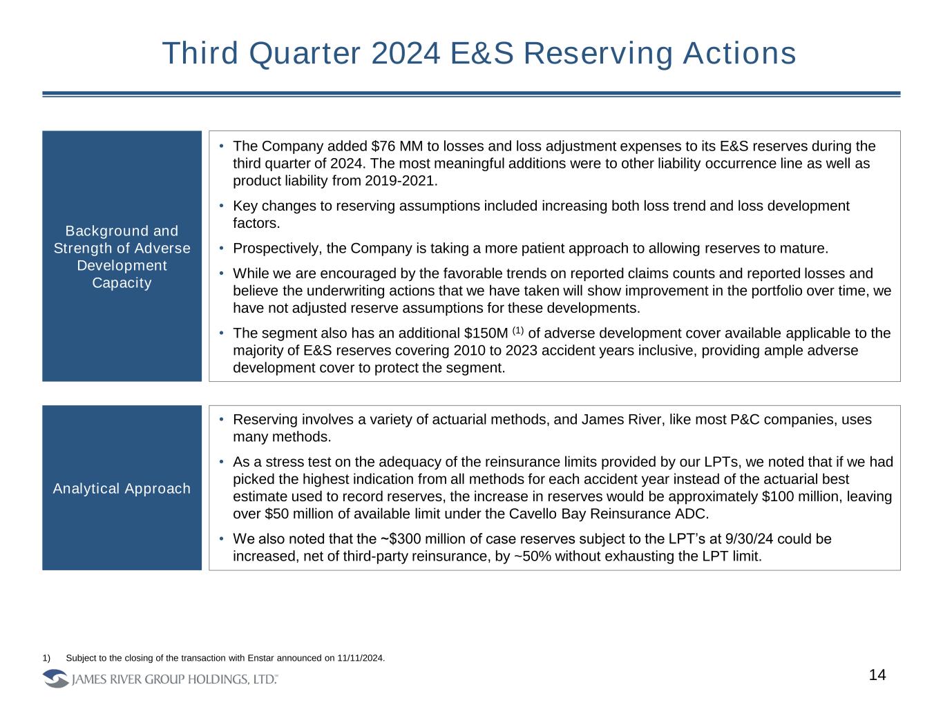14 Background and Strength of Adverse Development Capacity 1) Subject to the closing of the transaction with Enstar announced on 11/11/2024. • The Company added $76 MM to losses and loss adjustment expenses to its E&S reserves during the third quarter of 2024. The most meaningful additions were to other liability occurrence line as well as product liability from 2019-2021. • Key changes to reserving assumptions included increasing both loss trend and loss development factors. • Prospectively, the Company is taking a more patient approach to allowing reserves to mature. • While we are encouraged by the favorable trends on reported claims counts and reported losses and believe the underwriting actions that we have taken will show improvement in the portfolio over time, we have not adjusted reserve assumptions for these developments. • The segment also has an additional $150M (1) of adverse development cover available applicable to the majority of E&S reserves covering 2010 to 2023 accident years inclusive, providing ample adverse development cover to protect the segment. Third Quarter 2024 E&S Reserving Actions Analytical Approach • Reserving involves a variety of actuarial methods, and James River, like most P&C companies, uses many methods. • As a stress test on the adequacy of the reinsurance limits provided by our LPTs, we noted that if we had picked the highest indication from all methods for each accident year instead of the actuarial best estimate used to record reserves, the increase in reserves would be approximately $100 million, leaving over $50 million of available limit under the Cavello Bay Reinsurance ADC. • We also noted that the ~$300 million of case reserves subject to the LPT’s at 9/30/24 could be increased, net of third-party reinsurance, by ~50% without exhausting the LPT limit.