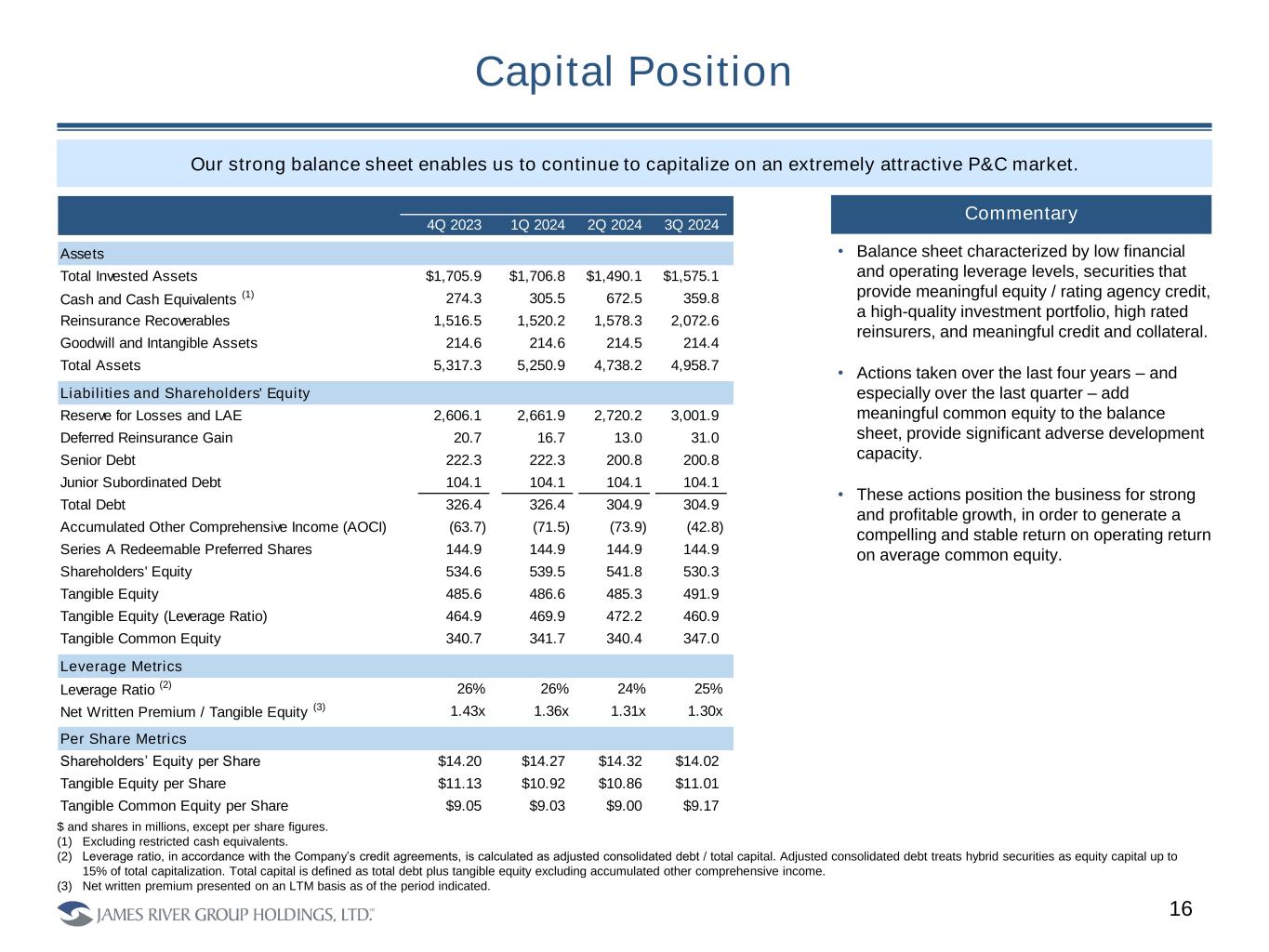 Investment Portfolio Overview 15 CommentaryInvestment Portfolio as of September 30, 2024 Third Quarter Change Net Investment Income 2023 2024 (%) Other Private Investments 0.0 1.8 NM All Other Net Investment Income 21.8 21.8 0% Total Net Investment Income $21.8 $23.6 8% Portfolio Statistics 3Q23 3Q24 Gross Investment Yield (1) 4.8% 4.8% Average Duration (2) 4.0 years 3.3 years Total Cash and Investments (excluding restricted cash): $1,935 MM The Company holds a conservative portfolio given its focus on underwriting risk. $ in millions 1. Includes fixed maturity, bank loan and equity securities. 2. Excluding restricted cash equivalents. • Balanced portfolio focused on high quality fixed maturities, with less than 15% of the portfolio allocated to risk assets (which include the high quality bank loan portfolio). • Weighted average rating of A+. • Annualized gross investment yield increased primarily as a result of higher yields on fixed maturity securities and bank loan participations for 2024. • The portfolio has limited exposure to regional banks, which accounts for less than 3% of the overall portfolio. • CMBS exposure represents 5% of cash and investments and is diversified by vintage and property type: Office (24%), Industrial / Storage / Mixed Use (28%), Retail (23%), Multifamily (13%), Lodging (7%), Defeased (4%) and Agency (<1%). Over 96% is AAA rated. • No CRE or whole loan investments in office or any sectors that have undergone recent market pressure in the portfolio. 63% 4% 3% 8% 2% 2% 18% Fixed Maturity Securities Preferred Stock Common Stock Bank Loans Other Invested Assets Short-Term Investments Cash and Cash Equivalents (excluding restricted cash)