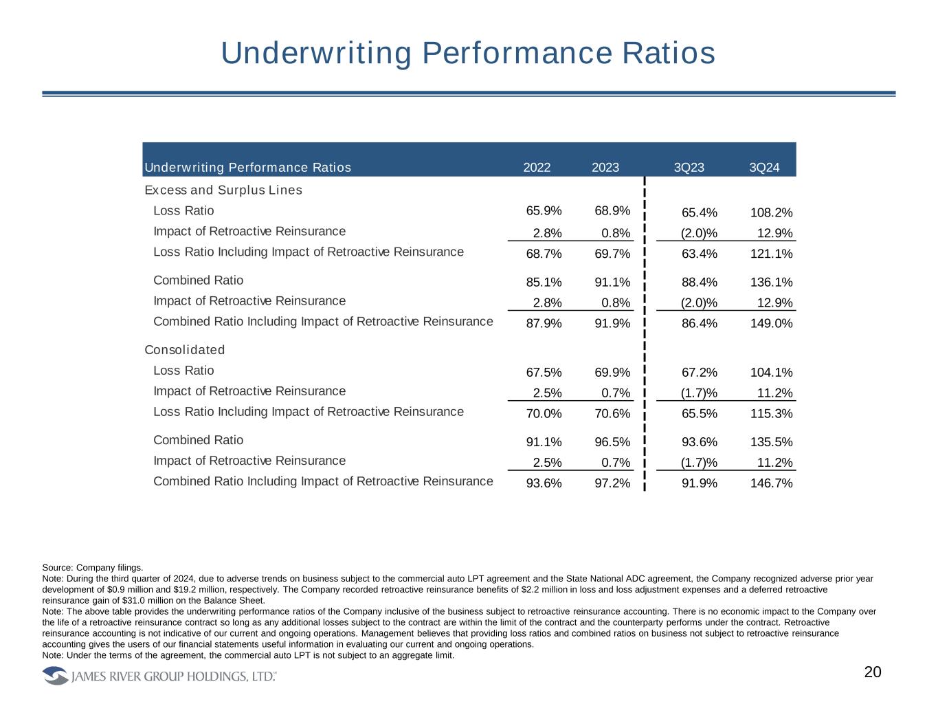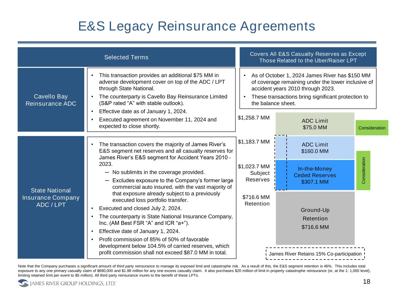 E&S Legacy Reinsurance Agreements 18 Covers All E&S Casualty Reserves as Except Those Related to the Uber/Raiser LPT Selected Terms • As of October 1, 2024 James River has $150 MM of coverage remaining under the tower inclusive of accident years 2010 through 2023. • These transactions bring significant protection to the balance sheet. • The transaction covers the majority of James River’s E&S segment net reserves and all casualty reserves for James River’s E&S segment for Accident Years 2010 - 2023. ─ No sublimits in the coverage provided. ─ Excludes exposure to the Company’s former large commercial auto insured, with the vast majority of that exposure already subject to a previously executed loss portfolio transfer. • Executed and closed July 2, 2024. • The counterparty is State National Insurance Company, Inc. (AM Best FSR “A” and ICR “a+”). • Effective date of January 1, 2024. • Profit commission of 85% of 50% of favorable development below 104.5% of carried reserves, which profit commission shall not exceed $87.0 MM in total. State National Insurance Company ADC / LPT Cavello Bay Reinsurance ADC • This transaction provides an additional $75 MM in adverse development cover on top of the ADC / LPT through State National. • The counterparty is Cavello Bay Reinsurance Limited (S&P rated “A” with stable outlook). • Effective date as of January 1, 2024. • Executed agreement on November 11, 2024 and expected to close shortly. In-the-Money Ceded Reserves $307.1 MM Ground-Up Retention $716.6 MM ADC Limit $160.0 MM $1,023.7 MM Subject Reserves $1,183.7 MM $716.6 MM Retention C o n s id e ra ti o n James River Retains 15% Co-participation ADC Limit $75.0 MM $1,258.7 MM Note that the Company purchases a significant amount of third party reinsurance to manage its exposed limit and catastrophe risk. As a result of this, the E&S segment retention is 46%. This includes total exposure to any one primary casualty claim of $690,000 and $1.98 million for any one excess casualty claim. It also purchases $20 million of limit in property catastrophe reinsurance (or, at the 1: 1,000 level), limiting retained limit per event to $5 million). All third party reinsurance inures to the benefit of these LPTs. Consideration