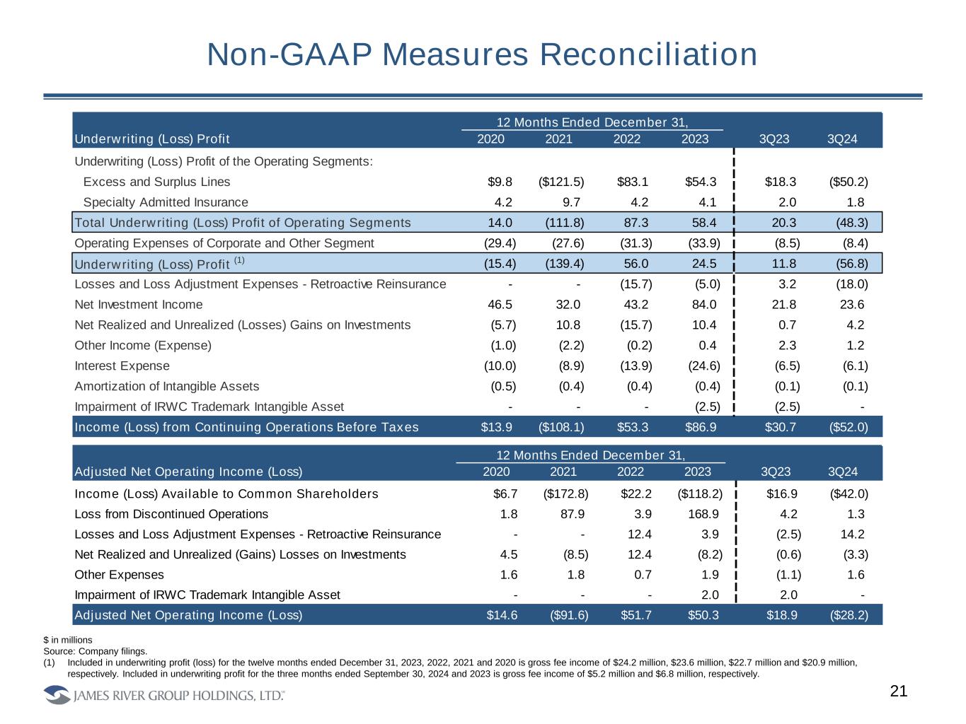 Underwriting Performance Ratios 20 Source: Company filings. Note: During the third quarter of 2024, due to adverse trends on business subject to the commercial auto LPT agreement and the State National ADC agreement, the Company recognized adverse prior year development of $0.9 million and $19.2 million, respectively. The Company recorded retroactive reinsurance benefits of $2.2 million in loss and loss adjustment expenses and a deferred retroactive reinsurance gain of $31.0 million on the Balance Sheet. Note: The above table provides the underwriting performance ratios of the Company inclusive of the business subject to retroactive reinsurance accounting. There is no economic impact to the Company over the life of a retroactive reinsurance contract so long as any additional losses subject to the contract are within the limit of the contract and the counterparty performs under the contract. Retroactive reinsurance accounting is not indicative of our current and ongoing operations. Management believes that providing loss ratios and combined ratios on business not subject to retroactive reinsurance accounting gives the users of our financial statements useful information in evaluating our current and ongoing operations. Note: Under the terms of the agreement, the commercial auto LPT is not subject to an aggregate limit. Underwriting Performance Ratios 2022 2023 3Q23 3Q24 Excess and Surplus Lines Loss Ratio 65.9% 68.9% 65.4% 108.2% Impact of Retroactive Reinsurance 2.8% 0.8% (2.0)% 12.9% Loss Ratio Including Impact of Retroactive Reinsurance 68.7% 69.7% 63.4% 121.1% Combined Ratio 85.1% 91.1% 88.4% 136.1% Impact of Retroactive Reinsurance 2.8% 0.8% (2.0)% 12.9% Combined Ratio Including Impact of Retroactive Reinsurance 87.9% 91.9% 86.4% 149.0% Consolidated Loss Ratio 67.5% 69.9% 67.2% 104.1% Impact of Retroactive Reinsurance 2.5% 0.7% (1.7)% 11.2% Loss Ratio Including Impact of Retroactive Reinsurance 70.0% 70.6% 65.5% 115.3% Combined Ratio 91.1% 96.5% 93.6% 135.5% Impact of Retroactive Reinsurance 2.5% 0.7% (1.7)% 11.2% Combined Ratio Including Impact of Retroactive Reinsurance 93.6% 97.2% 91.9% 146.7%
