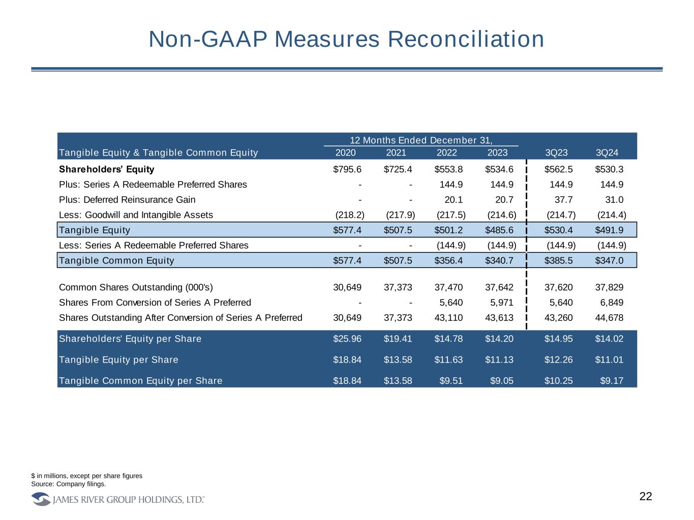 Non-GAAP Measures Reconciliation 21 $ in millions Source: Company filings. (1) Included in underwriting profit (loss) for the twelve months ended December 31, 2023, 2022, 2021 and 2020 is gross fee income of $24.2 million, $23.6 million, $22.7 million and $20.9 million, respectively. Included in underwriting profit for the three months ended September 30, 2024 and 2023 is gross fee income of $5.2 million and $6.8 million, respectively. 12 Months Ended December 31, Adjusted Net Operating Income (Loss) 2020 2021 2022 2023 3Q23 3Q24 Income (Loss) Available to Common Shareholders $6.7 ($172.8) $22.2 ($118.2) $16.9 ($42.0) Loss from Discontinued Operations 1.8 87.9 3.9 168.9 4.2 1.3 Losses and Loss Adjustment Expenses - Retroactive Reinsurance - - 12.4 3.9 (2.5) 14.2 Net Realized and Unrealized (Gains) Losses on Investments 4.5 (8.5) 12.4 (8.2) (0.6) (3.3) Other Expenses 1.6 1.8 0.7 1.9 (1.1) 1.6 Impairment of IRWC Trademark Intangible Asset - - - 2.0 2.0 - Adjusted Net Operating Income (Loss) $14.6 ($91.6) $51.7 $50.3 $18.9 ($28.2) 12 Months Ended December 31, Underwriting (Loss) Profit 2020 2021 2022 2023 3Q23 3Q24 Underwriting (Loss) Profit of the Operating Segments: Excess and Surplus Lines $9.8 ($121.5) $83.1 $54.3 $18.3 ($50.2) Specialty Admitted Insurance 4.2 9.7 4.2 4.1 2.0 1.8 Total Underwriting (Loss) Profit of Operating Segments 14.0 (111.8) 87.3 58.4 20.3 (48.3) Operating Expenses of Corporate and Other Segment (29.4) (27.6) (31.3) (33.9) (8.5) (8.4) Underwriting (Loss) Profit (1) (15.4) (139.4) 56.0 24.5 11.8 (56.8) Losses and Loss Adjustment Expenses - Retroactive Reinsurance - - (15.7) (5.0) 3.2 (18.0) Net Investment Income 46.5 32.0 43.2 84.0 21.8 23.6 Net Realized and Unrealized (Losses) Gains on Investments (5.7) 10.8 (15.7) 10.4 0.7 4.2 Other Income (Expense) (1.0) (2.2) (0.2) 0.4 2.3 1.2 Interest Expense (10.0) (8.9) (13.9) (24.6) (6.5) (6.1) Amortization of Intangible Assets (0.5) (0.4) (0.4) (0.4) (0.1) (0.1) Impairment of IRWC Trademark Intangible Asset - - - (2.5) (2.5) - Income (Loss) from Continuing Operations Before Taxes $13.9 ($108.1) $53.3 $86.9 $30.7 ($52.0)