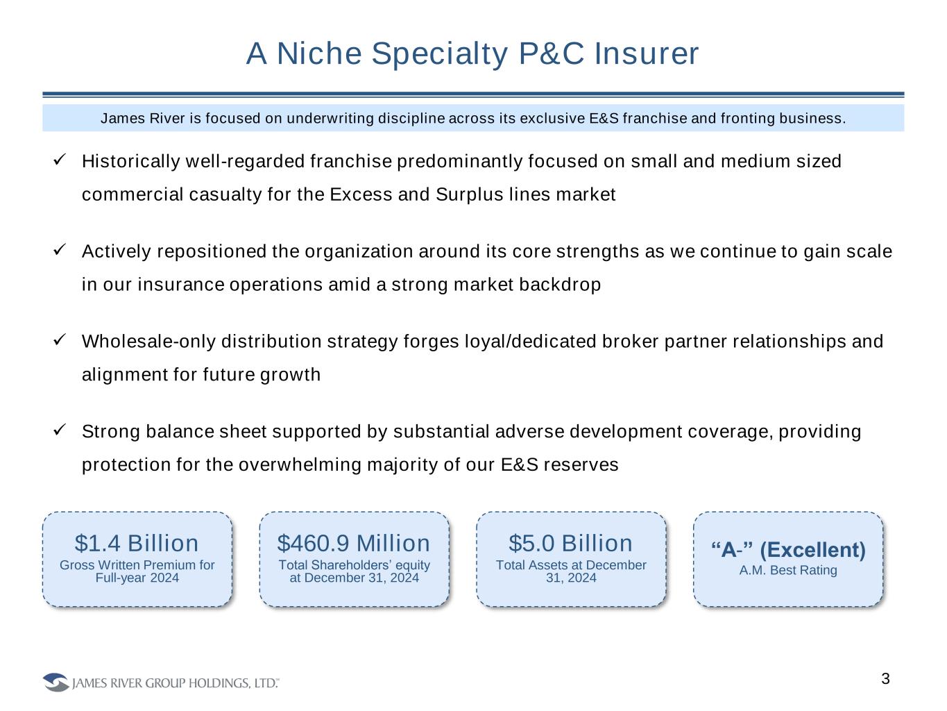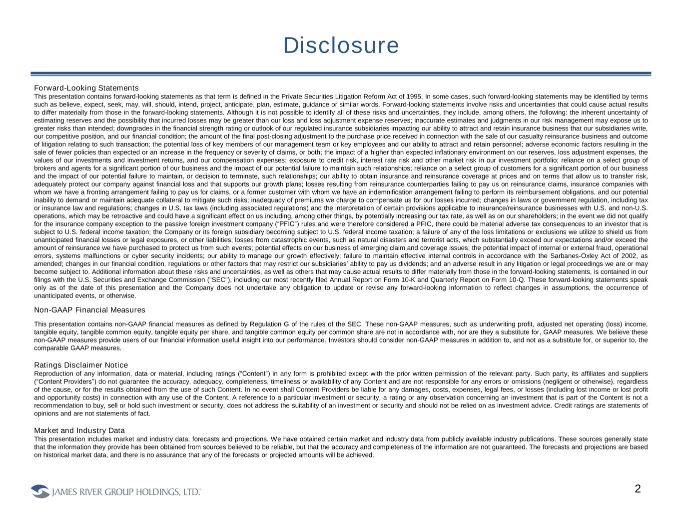 Disclosure 2 Forward-Looking Statements This presentation contains forward-looking statements as that term is defined in the Private Securities Litigation Reform Act of 1995. In some cases, such forward-looking statements may be identified by terms such as believe, expect, seek, may, will, should, intend, project, anticipate, plan, estimate, guidance or similar words. Forward-looking statements involve risks and uncertainties that could cause actual results to differ materially from those in the forward-looking statements. Although it is not possible to identify all of these risks and uncertainties, they include, among others, the following: the inherent uncertainty of estimating reserves and the possibility that incurred losses may be greater than our loss and loss adjustment expense reserves; inaccurate estimates and judgments in our risk management may expose us to greater risks than intended; downgrades in the financial strength rating or outlook of our regulated insurance subsidiaries impacting our ability to attract and retain insurance business that our subsidiaries write, our competitive position, and our financial condition; the amount of the final post-closing adjustment to the purchase price received in connection with the sale of our casualty reinsurance business and outcome of litigation relating to such transaction; the potential loss of key members of our management team or key employees and our ability to attract and retain personnel; adverse economic factors resulting in the sale of fewer policies than expected or an increase in the frequency or severity of claims, or both; the impact of a higher than expected inflationary environment on our reserves, loss adjustment expenses, the values of our investments and investment returns, and our compensation expenses; exposure to credit risk, interest rate risk and other market risk in our investment portfolio; reliance on a select group of brokers and agents for a significant portion of our business and the impact of our potential failure to maintain such relationships; reliance on a select group of customers for a significant portion of our business and the impact of our potential failure to maintain, or decision to terminate, such relationships; our ability to obtain insurance and reinsurance coverage at prices and on terms that allow us to transfer risk, adequately protect our company against financial loss and that supports our growth plans; losses resulting from reinsurance counterparties failing to pay us on reinsurance claims, insurance companies with whom we have a fronting arrangement failing to pay us for claims, or a former customer with whom we have an indemnification arrangement failing to perform its reimbursement obligations, and our potential inability to demand or maintain adequate collateral to mitigate such risks; inadequacy of premiums we charge to compensate us for our losses incurred; changes in laws or government regulation, including tax or insurance law and regulations; changes in U.S. tax laws (including associated regulations) and the interpretation of certain provisions applicable to insurance/reinsurance businesses with U.S. and non-U.S. operations, which may be retroactive and could have a significant effect on us including, among other things, by potentially increasing our tax rate, as well as on our shareholders; in the event we did not qualify for the insurance company exception to the passive foreign investment company (“PFIC”) rules and were therefore considered a PFIC, there could be material adverse tax consequences to an investor that is subject to U.S. federal income taxation; the Company or its foreign subsidiary becoming subject to U.S. federal income taxation; a failure of any of the loss limitations or exclusions we utilize to shield us from unanticipated financial losses or legal exposures, or other liabilities; losses from catastrophic events, such as natural disasters and terrorist acts, which substantially exceed our expectations and/or exceed the amount of reinsurance we have purchased to protect us from such events; potential effects on our business of emerging claim and coverage issues; the potential impact of internal or external fraud, operational errors, systems malfunctions or cyber security incidents; our ability to manage our growth effectively; failure to maintain effective internal controls in accordance with the Sarbanes-Oxley Act of 2002, as amended; changes in our financial condition, regulations or other factors that may restrict our subsidiaries’ ability to pay us dividends; and an adverse result in any litigation or legal proceedings we are or may become subject to. Additional information about these risks and uncertainties, as well as others that may cause actual results to differ materially from those in the forward-looking statements, is contained in our filings with the U.S. Securities and Exchange Commission ("SEC"), including our most recently filed Annual Report on Form 10-K and Quarterly Report on Form 10-Q. These forward-looking statements speak only as of the date of this presentation and the Company does not undertake any obligation to update or revise any forward-looking information to reflect changes in assumptions, the occurrence of unanticipated events, or otherwise. Non-GAAP Financial Measures This presentation contains non-GAAP financial measures as defined by Regulation G of the rules of the SEC. These non-GAAP measures, such as underwriting profit, adjusted net operating (loss) income, tangible equity, tangible common equity, tangible equity per share, and tangible common equity per common share are not in accordance with, nor are they a substitute for, GAAP measures. We believe these non-GAAP measures provide users of our financial information useful insight into our performance. Investors should consider non-GAAP measures in addition to, and not as a substitute for, or superior to, the comparable GAAP measures. Ratings Disclaimer Notice R