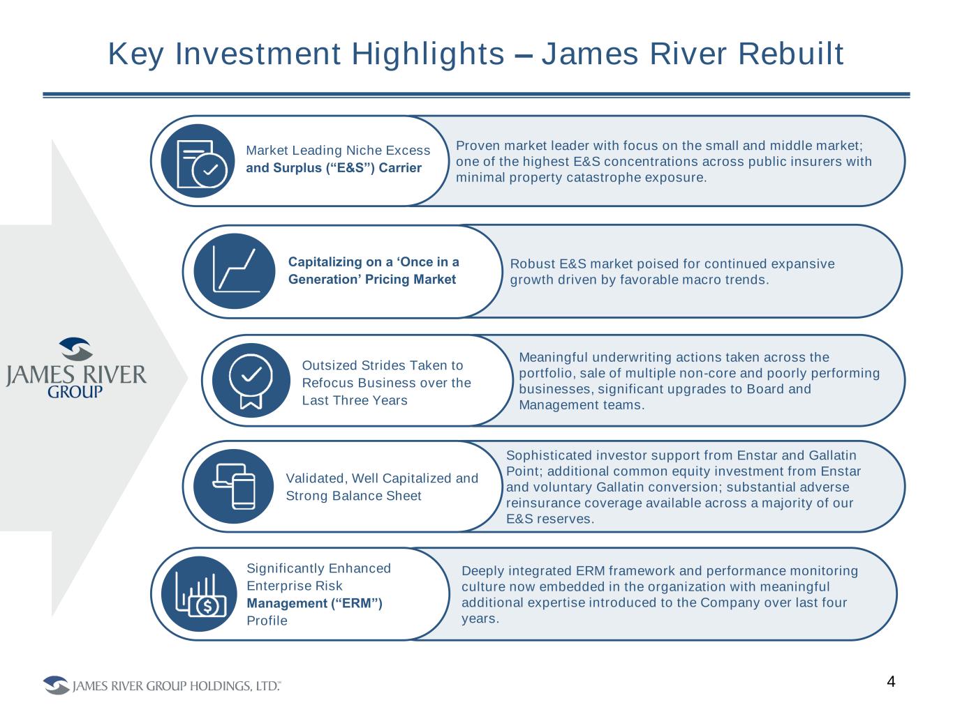 ✓ Historically well-regarded franchise predominantly focused on small and medium sized commercial casualty for the Excess and Surplus lines market ✓ Actively repositioned the organization around its core strengths as we continue to gain scale in our insurance operations amid a strong market backdrop ✓ Wholesale-only distribution strategy forges loyal/dedicated broker partner relationships and alignment for future growth ✓ Strong balance sheet supported by substantial adverse development coverage, providing protection for the overwhelming majority of our E&S reserves A Niche Specialty P&C Insurer James River is focused on underwriting discipline across its exclusive E&S franchise and fronting business. 3 $460.9 Million Total Shareholders’ equity at December 31, 2024 $5.0 Billion Total Assets at December 31, 2024 $1.4 Billion Gross Written Premium for Full-year 2024 “A-” (Excellent) A.M. Best Rating