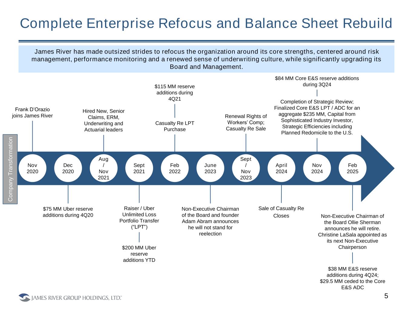 Key Investment Highlights – James River Rebuilt 4 Deeply integrated ERM framework and performance monitoring culture now embedded in the organization with meaningful additional expertise introduced to the Company over last four years. Large and Expanding Addressable Market Significantly Enhanced Enterprise Risk Management (“ERM”) Profile Sophisticated investor support from Enstar and Gallatin Point; additional common equity investment from Enstar and voluntary Gallatin conversion; substantial adverse reinsurance coverage available across a majority of our E&S reserves. Large and Expanding Addressable Market Validated, Well Capitalized and Strong Balance Sheet Proven market leader with focus on the small and middle market; one of the highest E&S concentrations across public insurers with minimal property catastrophe exposure. Large and Expanding Addressable Market Market Leading Niche Excess and Surplus (“E&S”) Carrier Robust E&S market poised for continued expansive growth driven by favorable macro trends. Large and Expanding Addressable Market Capitalizing on a ‘Once in a Generation’ Pricing Market Meaningful underwriting actions taken across the portfolio, sale of multiple non-core and poorly performing businesses, significant upgrades to Board and Management teams. Large and Expanding Addressable Market Outsized Strides Taken to Refocus Business over the Last Three Years