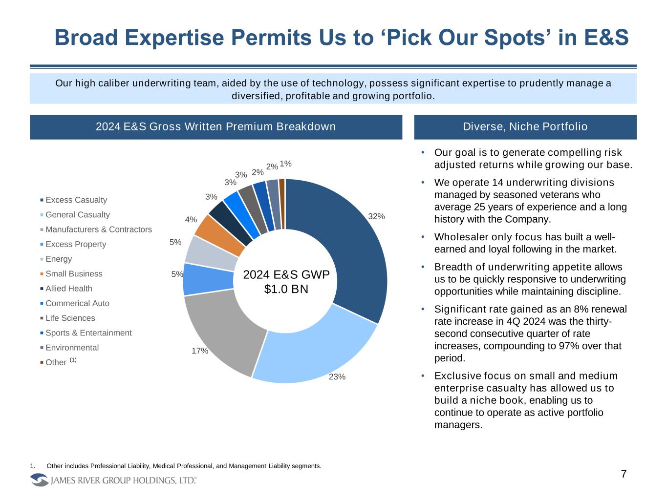 100% 76% 72%(3) 44% 28% 26% 23% 13% 10% 8% 2023 E&S Direct Written Premium $27.3 $28.9 $29.8 $29.9 $31.5 $34.6 $40.3 $47.6 $62.9 $75.5 $86.5 2013 2014 2015 2016 2017 2018 2019 2020 2021 2022 2023 6 The Market We Operate in is Highly Attractive U.S. Excess & Surplus Lines DWP ($BN) (1) 1. Source: S&P Global Market Intelligence – P&C Market Share Report 2023 sourced from Capital IQ Pro for 235 total participants and excluding US territories. 2. Statutory E&S direct written premium as defined and calculated by S&P Global Market Intelligence. Represents statutory E&S direct written premium divided by GAAP consolidated gross written premium for 2023. 3. GAAP E&S segment GWP of $1.0 BN. 15% of Specialty Admitted segment business was non-admitted in 2023. Most Concentrated E&S Companies (2) We are one of the largest and most concentrated public companies in terms of E&S exposure. E&S industry DWP has grown at double digit rates the past 5 years driven by rising renewal rates and changes in risk appetite. 2013 – 2017 Average Growth Rate: 4% $1.6 BN $318 MM $1.1 Bn $794 MM $3.6 BN $3.7 BN $1.9 BN $5.0 BN $8.4 BN $1.5 BN