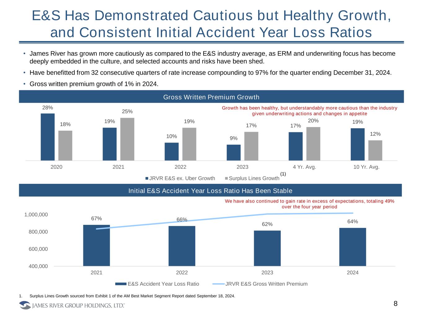 32% 23% 17% 5% 5% 4% 3% 3% 3% 2% 2% 1% Excess Casualty General Casualty Manufacturers & Contractors Excess Property Energy Small Business Allied Health Commerical Auto Life Sciences Sports & Entertainment Environmental Other Broad Expertise Permits Us to ‘Pick Our Spots’ in E&S 7 • Our goal is to generate compelling risk adjusted returns while growing our base. • We operate 14 underwriting divisions managed by seasoned veterans who average 25 years of experience and a long history with the Company. • Wholesaler only focus has built a well- earned and loyal following in the market. • Breadth of underwriting appetite allows us to be quickly responsive to underwriting opportunities while maintaining discipline. • Significant rate gained as an 8% renewal rate increase in 4Q 2024 was the thirty- second consecutive quarter of rate increases, compounding to 97% over that period. • Exclusive focus on small and medium enterprise casualty has allowed us to build a niche book, enabling us to continue to operate as active portfolio managers. Our high caliber underwriting team, aided by the use of technology, possess significant expertise to prudently manage a diversified, profitable and growing portfolio. 2024 E&S Gross Written Premium Breakdown 2024 E&S GWP $1.0 BN 1. Other includes Professional Liability, Medical Professional, and Management Liability segments. Diverse, Niche Portfolio (1)