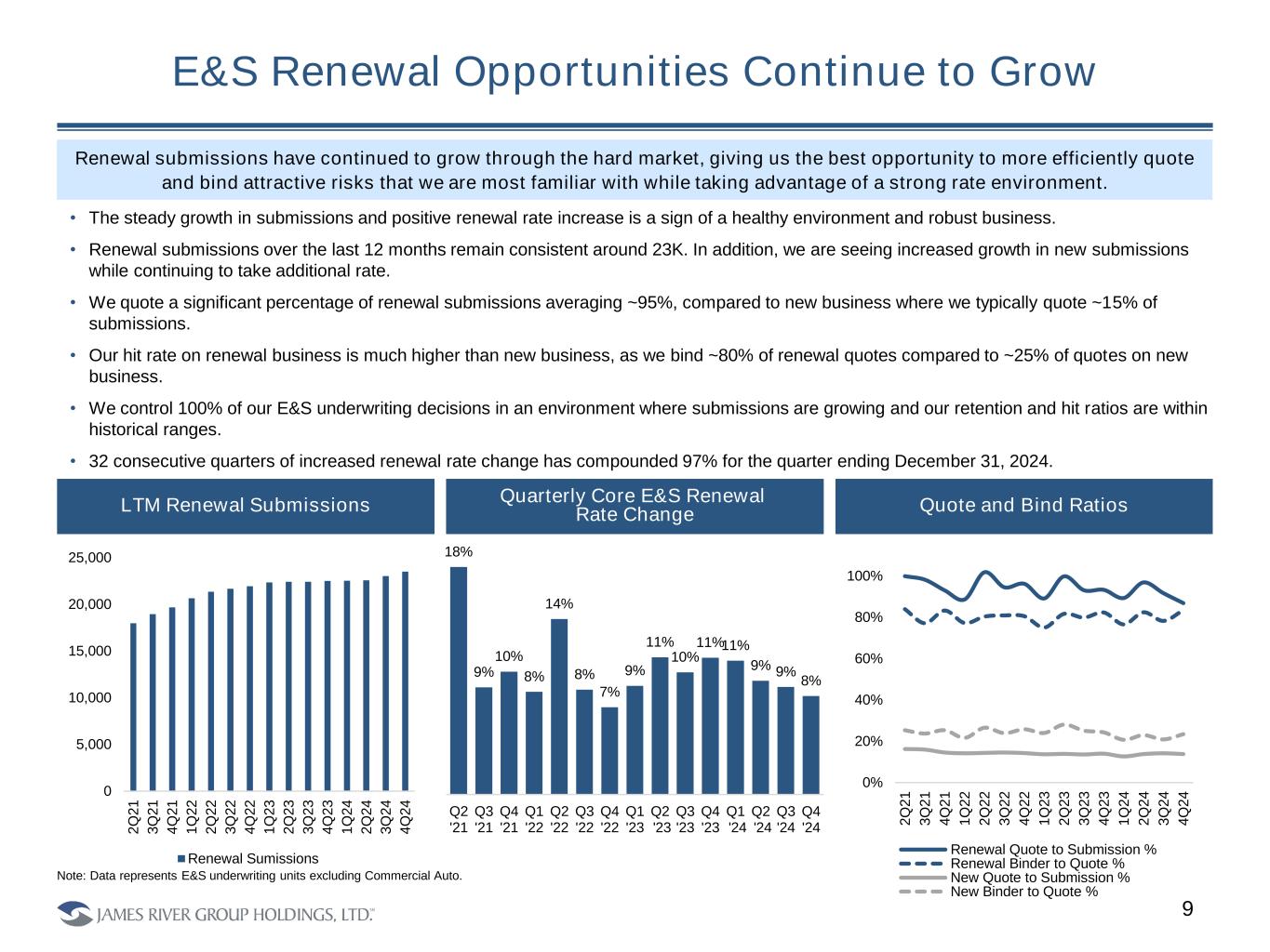 28% 19% 10% 9% 17% 19%18% 25% 19% 17% 20% 12% 2020 2021 2022 2023 4 Yr. Avg. 10 Yr. Avg. JRVR E&S ex. Uber Growth Surplus Lines Growth 8 E&S Has Demonstrated Cautious but Healthy Growth, and Consistent Initial Accident Year Loss Ratios Gross Written Premium Growth Initial E&S Accident Year Loss Ratio Has Been Stable • James River has grown more cautiously as compared to the E&S industry average, as ERM and underwriting focus has become deeply embedded in the culture, and selected accounts and risks have been shed. • Have benefitted from 32 consecutive quarters of rate increase compounding to 97% for the quarter ending December 31, 2024. • Gross written premium growth of 1% in 2024. 1. Surplus Lines Growth sourced from Exhibit 1 of the AM Best Market Segment Report dated September 18, 2024. Growth has been healthy, but understandably more cautious than the industry given underwriting actions and changes in appetite (1) 67% 66% 62% 64% 400,000 600,000 800,000 1,000,000 2021 2022 2023 2024 E&S Accident Year Loss Ratio JRVR E&S Gross Written Premium We have also continued to gain rate in excess of expectations, totaling 49% over the four year period
