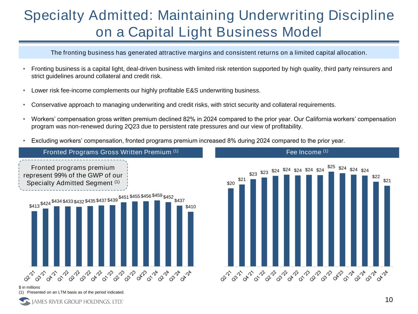 E&S Renewal Opportunities Continue to Grow 9 Renewal submissions have continued to grow through the hard market, giving us the best opportunity to more efficiently quote and bind attractive risks that we are most familiar with while taking advantage of a strong rate environment. • The steady growth in submissions and positive renewal rate increase is a sign of a healthy environment and robust business. • Renewal submissions over the last 12 months remain consistent around 23K. In addition, we are seeing increased growth in new submissions while continuing to take additional rate. • We quote a significant percentage of renewal submissions averaging ~95%, compared to new business where we typically quote ~15% of submissions. • Our hit rate on renewal business is much higher than new business, as we bind ~80% of renewal quotes compared to ~25% of quotes on new business. • We control 100% of our E&S underwriting decisions in an environment where submissions are growing and our retention and hit ratios are within historical ranges. • 32 consecutive quarters of increased renewal rate change has compounded 97% for the quarter ending December 31, 2024. LTM Renewal Submissions Quote and Bind Ratios Note: Data represents E&S underwriting units excluding Commercial Auto. Quarterly Core E&S Renewal Rate Change 18% 9% 10% 8% 14% 8% 7% 9% 11% 10% 11%11% 9% 9% 8% Q2 '21 Q3 '21 Q4 '21 Q1 '22 Q2 '22 Q3 '22 Q4 '22 Q1 '23 Q2 '23 Q3 '23 Q4 '23 Q1 '24 Q2 '24 Q3 '24 Q4 '24 0% 20% 40% 60% 80% 100% 2 Q 2 1 3 Q 2 1 4 Q 2 1 1 Q 2 2 2 Q 2 2 3 Q 2 2 4 Q 2 2 1 Q 2 3 2 Q 2 3 3 Q 2 3 4 Q 2 3 1 Q 2 4 2 Q 2 4 3 Q 2 4 4 Q 2 4 Renewal Quote to Submission % Renewal Binder to Quote % New Quote to Submission % New Binder to Quote % 0 5,000 10,000 15,000 20,000 25,000 2 Q 2 1 3 Q 2 1 4 Q 2 1 1 Q 2 2 2 Q 2 2 3 Q 2 2 4 Q 2 2 1 Q 2 3 2 Q 2 3 3 Q 2 3 4 Q 2 3 1 Q 2 4 2 Q 2 4 3 Q 2 4 4 Q 2 4 Renewal Sumissions