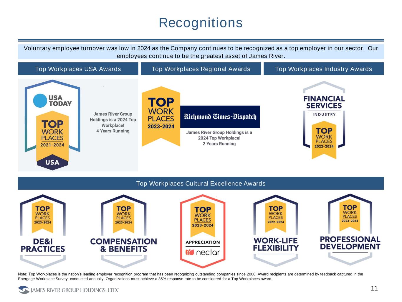Recognitions 11 Voluntary employee turnover was low in 2024 as the Company continues to be recognized as a top employer in our sector. Our employees continue to be the greatest asset of James River. Top Workplaces Cultural Excellence Awards Note: Top Workplaces is the nation’s leading employer recognition program that has been recognizing outstanding companies since 2006. Award recipients are determined by feedback captured in the Energage Workplace Survey, conducted annually. Organizations must achieve a 35% response rate to be considered for a Top Workplaces award. Top Workplaces USA Awards Top Workplaces Regional Awards Top Workplaces Industry Awards