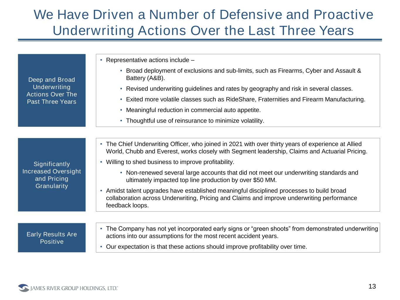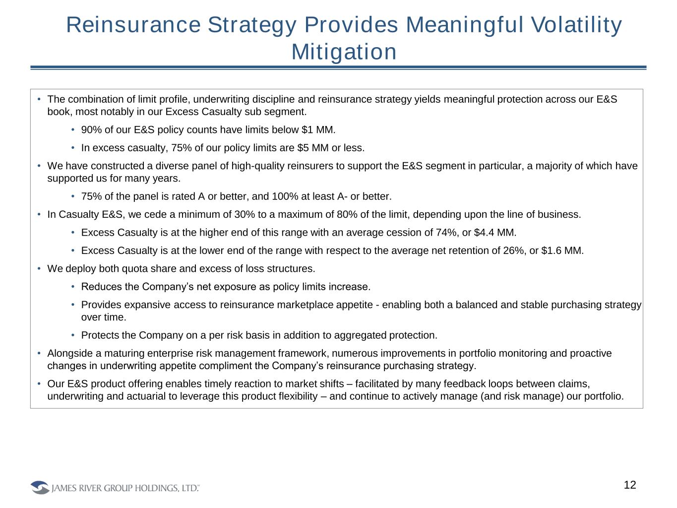12 Reinsurance Strategy Provides Meaningful Volatility Mitigation • The combination of limit profile, underwriting discipline and reinsurance strategy yields meaningful protection across our E&S book, most notably in our Excess Casualty sub segment. • 90% of our E&S policy counts have limits below $1 MM. • In excess casualty, 75% of our policy limits are $5 MM or less. • We have constructed a diverse panel of high-quality reinsurers to support the E&S segment in particular, a majority of which have supported us for many years. • 75% of the panel is rated A or better, and 100% at least A- or better. • In Casualty E&S, we cede a minimum of 30% to a maximum of 80% of the limit, depending upon the line of business. • Excess Casualty is at the higher end of this range with an average cession of 74%, or $4.4 MM. • Excess Casualty is at the lower end of the range with respect to the average net retention of 26%, or $1.6 MM. • We deploy both quota share and excess of loss structures. • Reduces the Company’s net exposure as policy limits increase. • Provides expansive access to reinsurance marketplace appetite - enabling both a balanced and stable purchasing strategy over time. • Protects the Company on a per risk basis in addition to aggregated protection. • Alongside a maturing enterprise risk management framework, numerous improvements in portfolio monitoring and proactive changes in underwriting appetite compliment the Company’s reinsurance purchasing strategy. • Our E&S product offering enables timely reaction to market shifts – facilitated by many feedback loops between claims, underwriting and actuarial to leverage this product flexibility – and continue to actively manage (and risk manage) our portfolio.